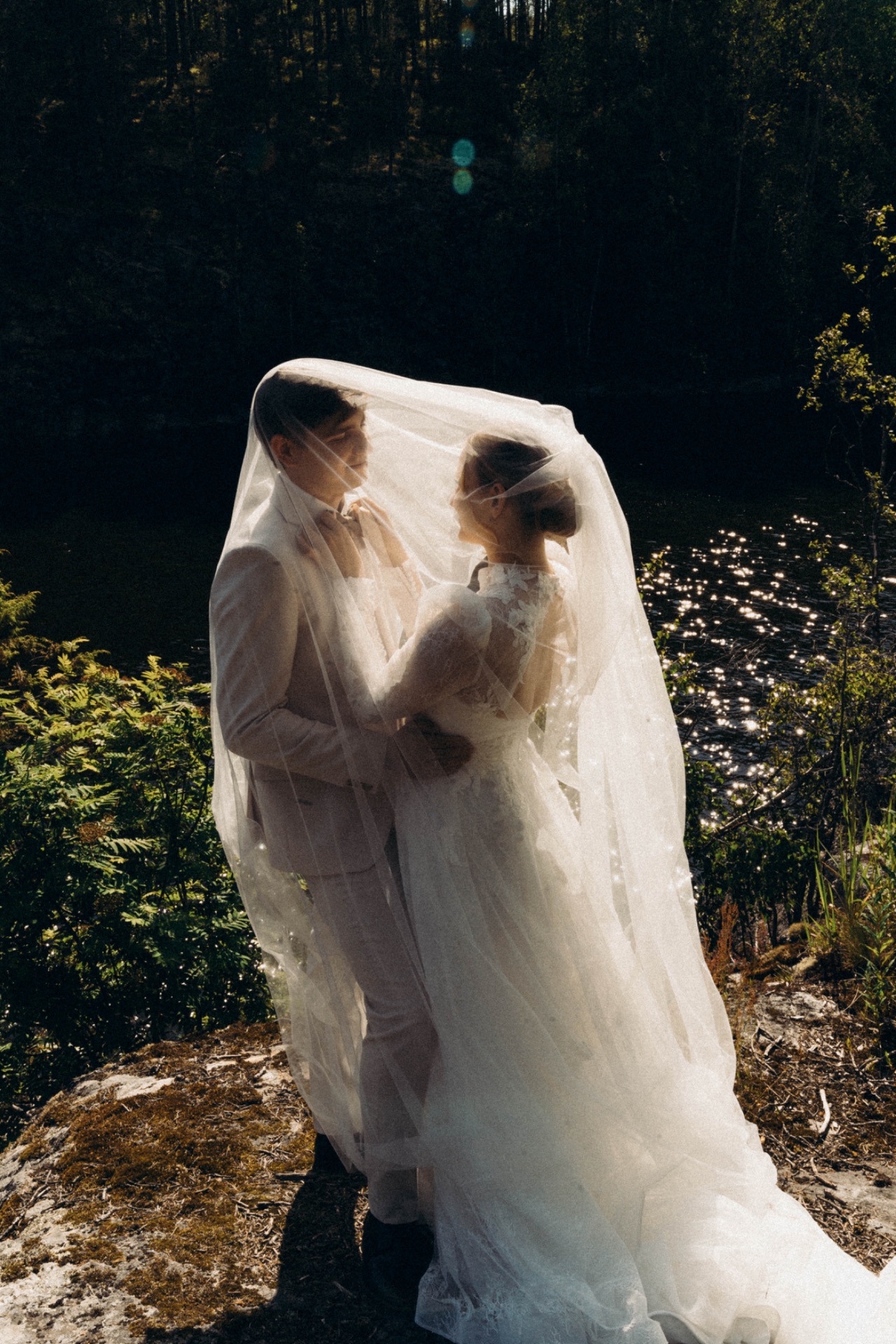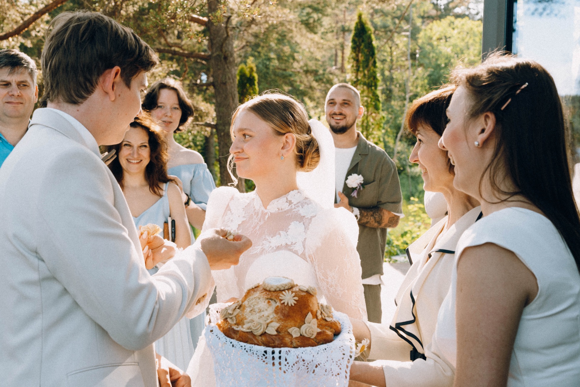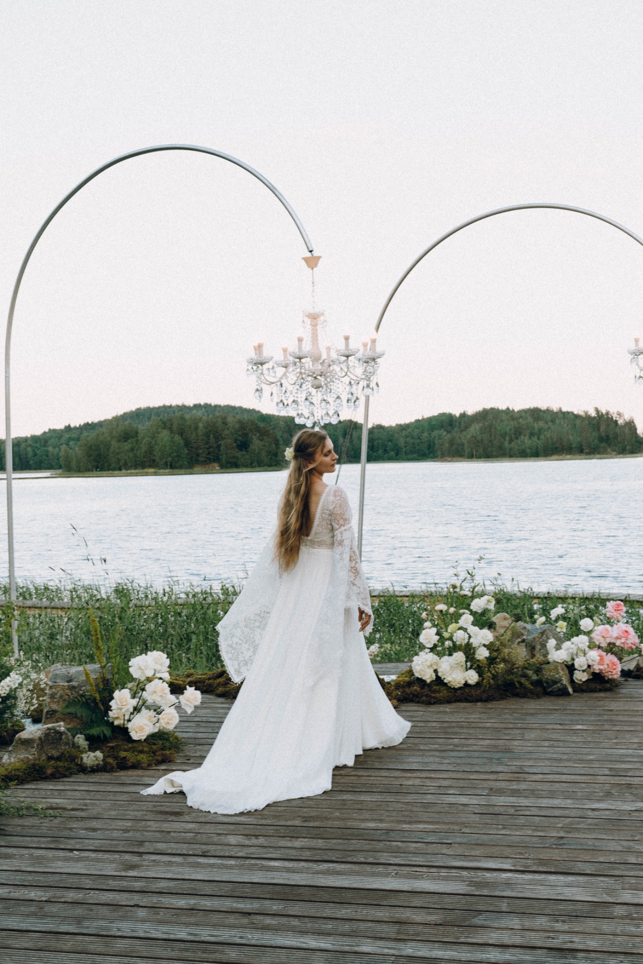 Мы остановились на концепции «петербургской свадьбы» в Карелии. Нам хотелось совместить дворцовую тематику, хрустальные люстры и атмосферу бала на природе. И самое главное, мне хотелось, чтобы было много полевых цветов. Я очень хотела сделать акцент на ромашках, потому что они на момент нашего знакомства были моими единственными любимыми цветами. Мне очень нравились их лёгкость и простота. И Серёжа был первым из всех, кто запомнил этот факт и подарил их мне.