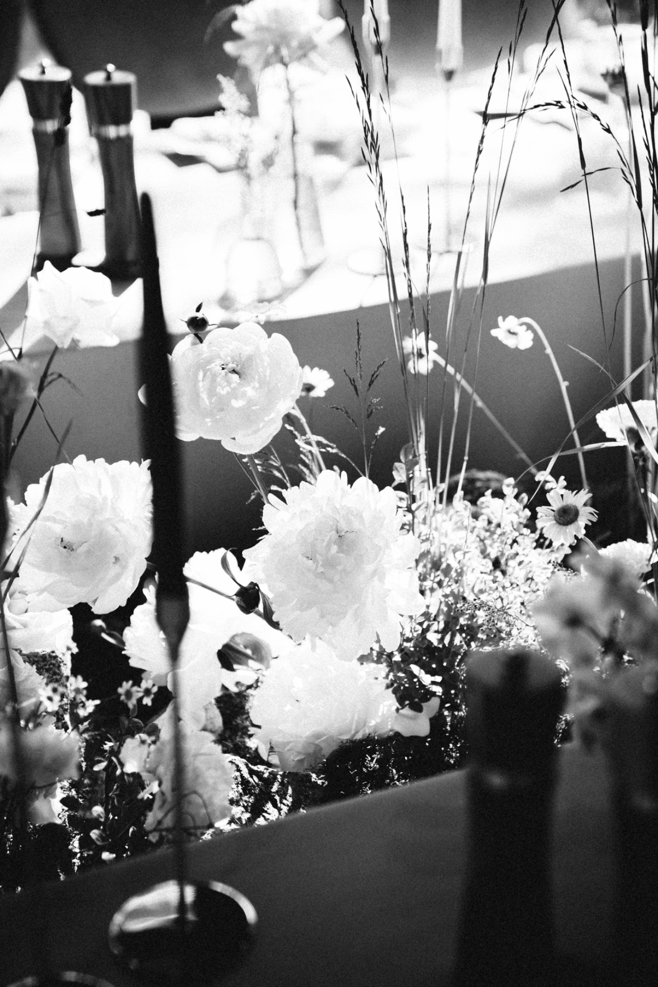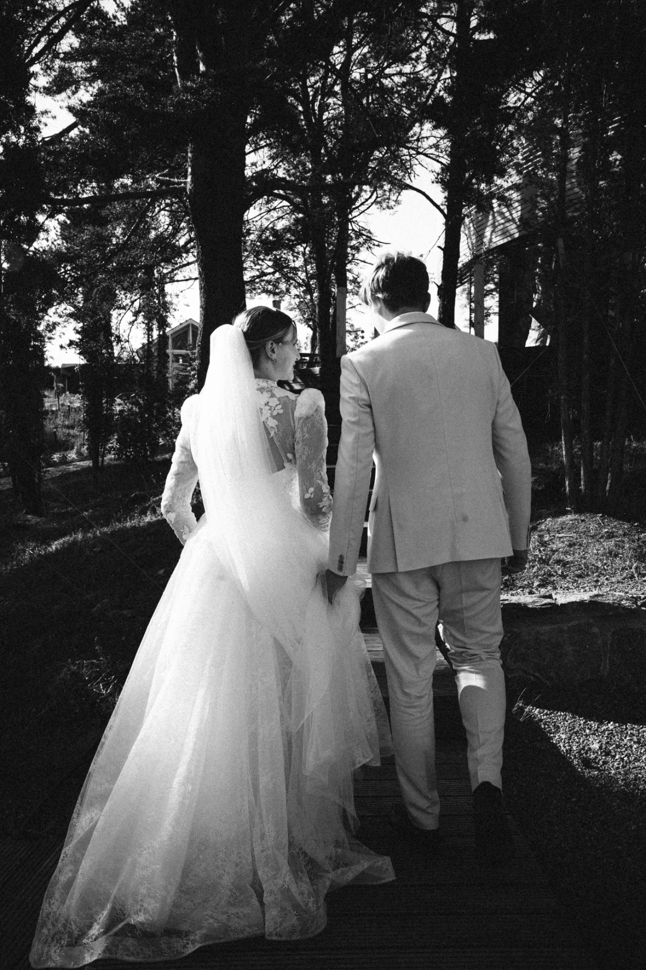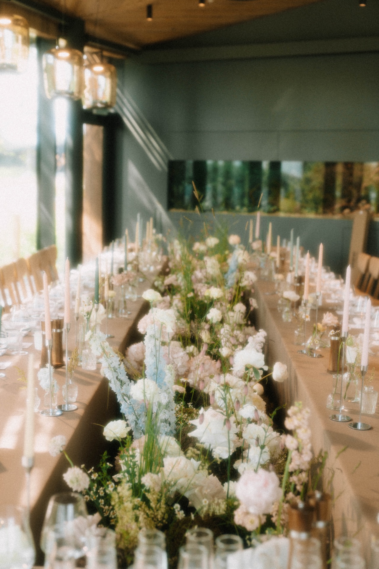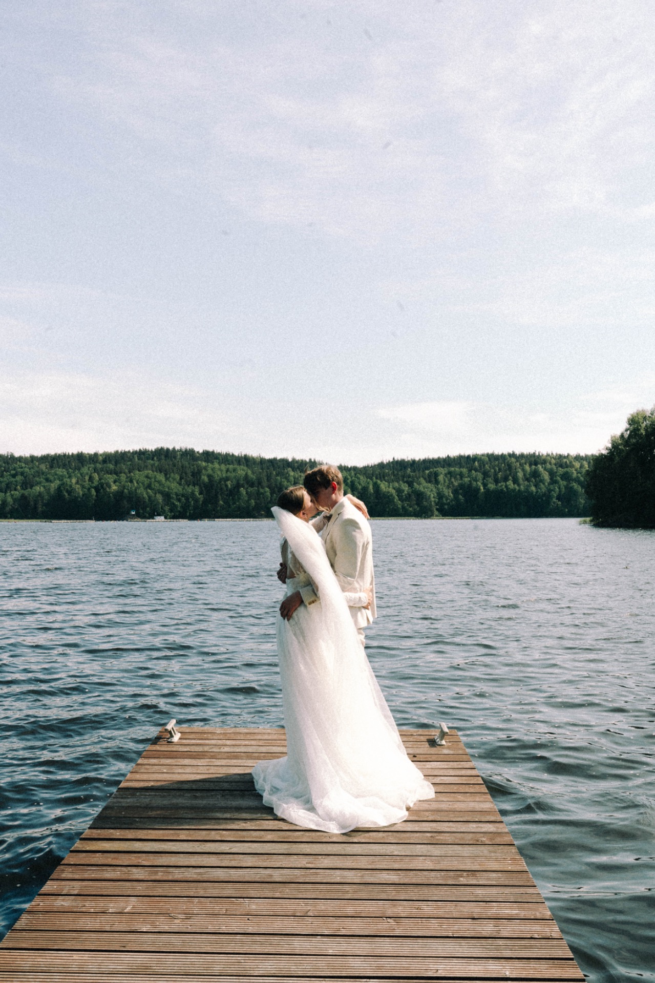 Мы остановились на концепции «петербургской свадьбы» в Карелии. Нам хотелось совместить дворцовую тематику, хрустальные люстры и атмосферу бала на природе. И самое главное, мне хотелось, чтобы было много полевых цветов. Я очень хотела сделать акцент на ромашках, потому что они на момент нашего знакомства были моими единственными любимыми цветами. Мне очень нравились их лёгкость и простота. И Серёжа был первым из всех, кто запомнил этот факт и подарил их мне.