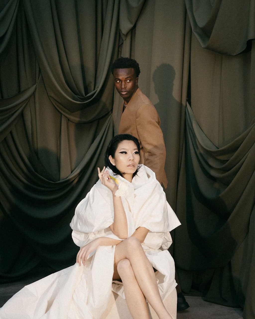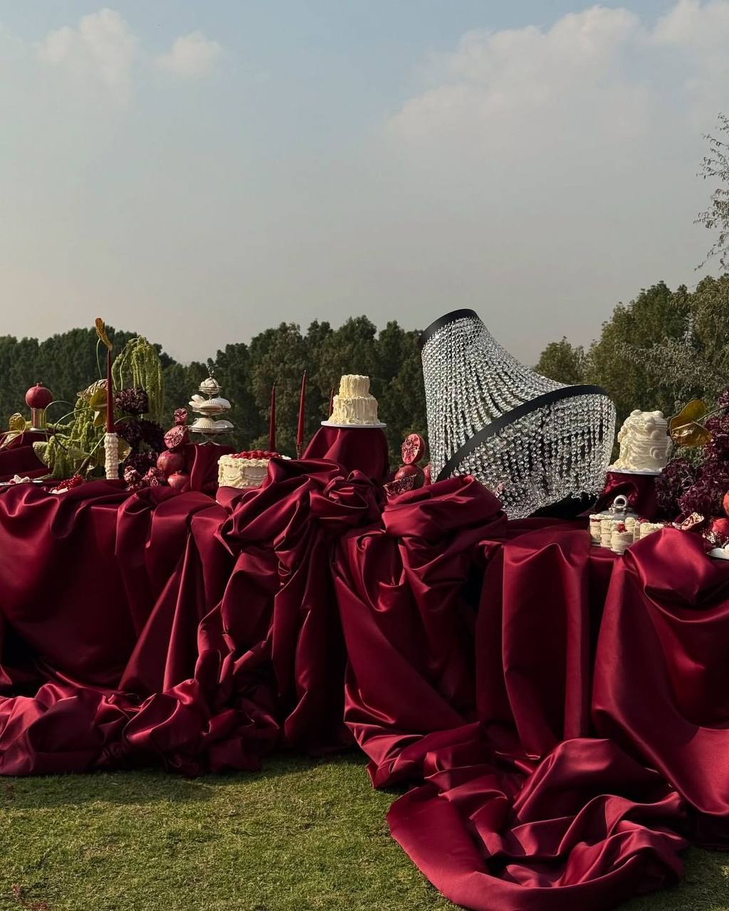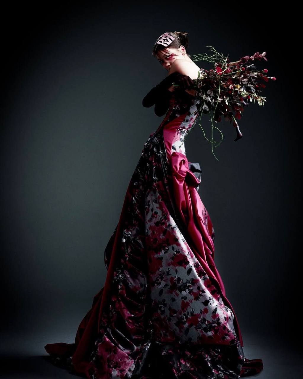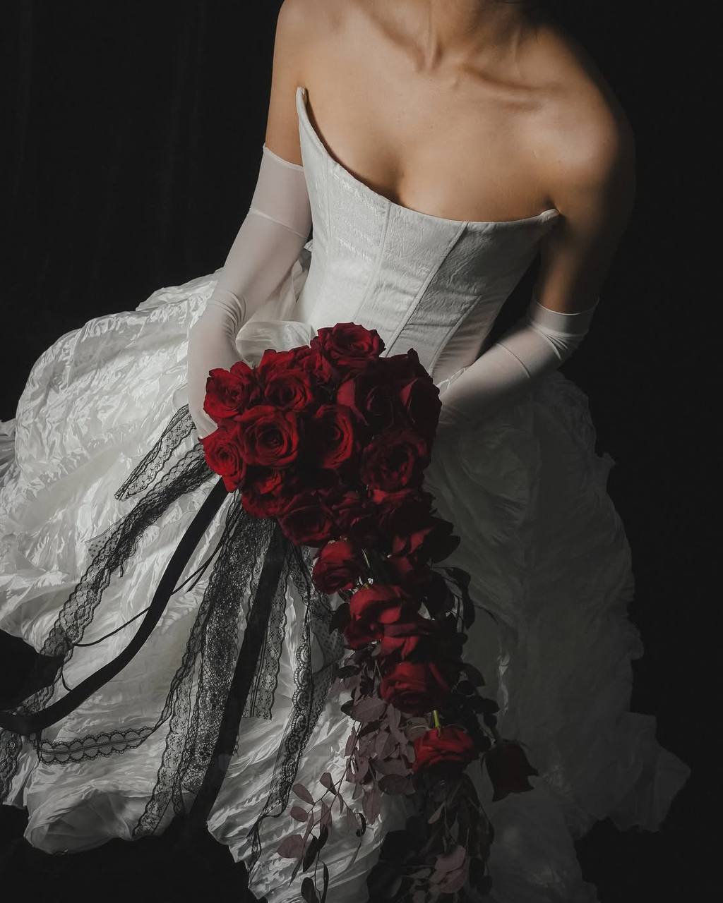 В образах невесты — это бордовые, винные и почти чёрные ткани, бархатные платья с асимметричными деталями, корсеты и роскошные драпировки.