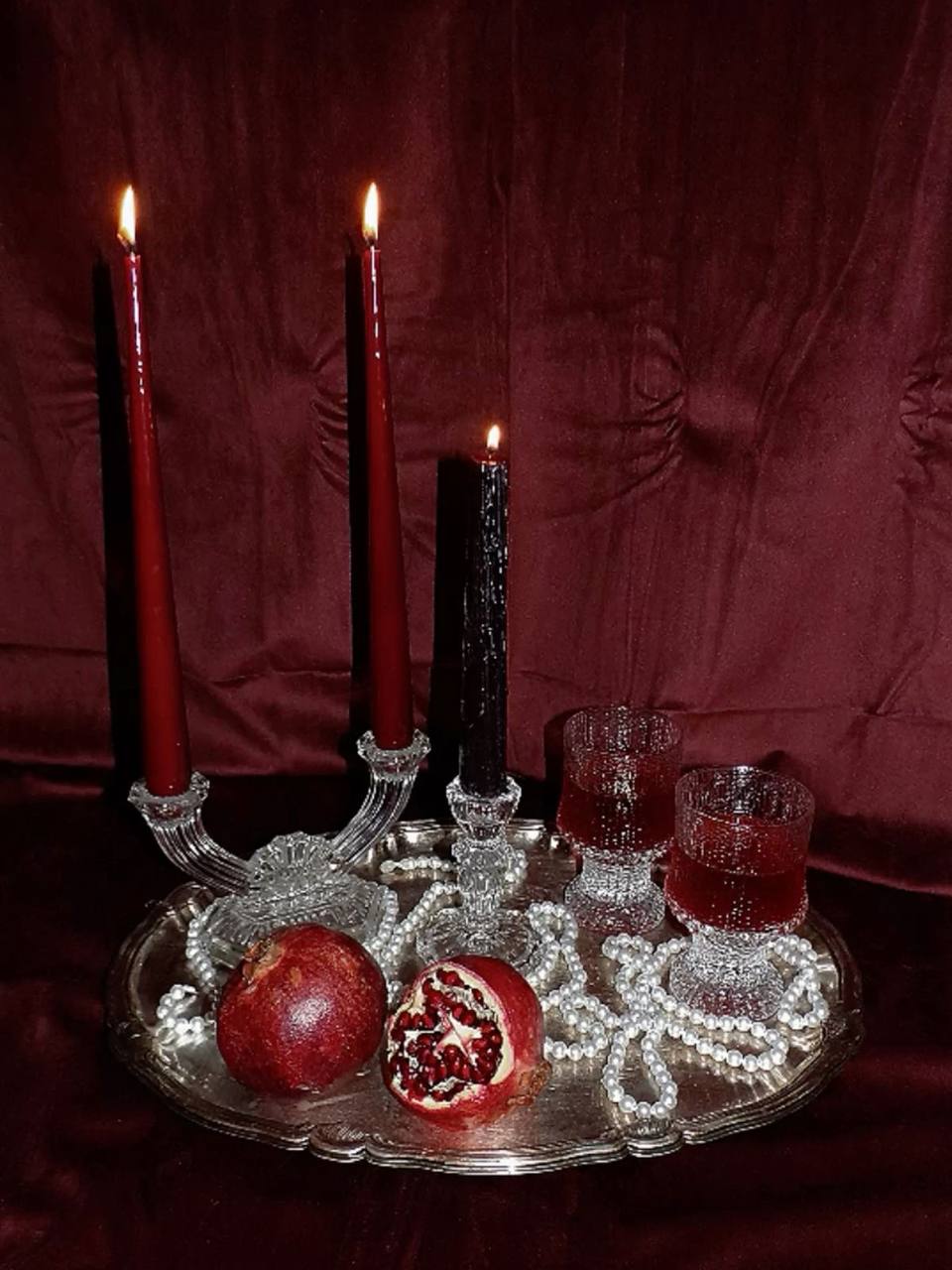 В декоре преобладают свечи, тёмная флористика, зеркала, металл и приглушённое освещение, которое создаёт атмосферу драматизма и чем-то напоминает сцены из фильма про вампиров.
