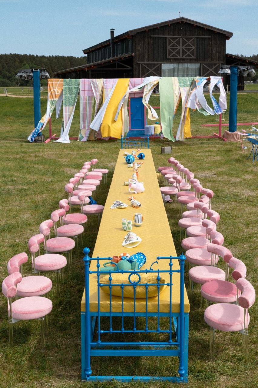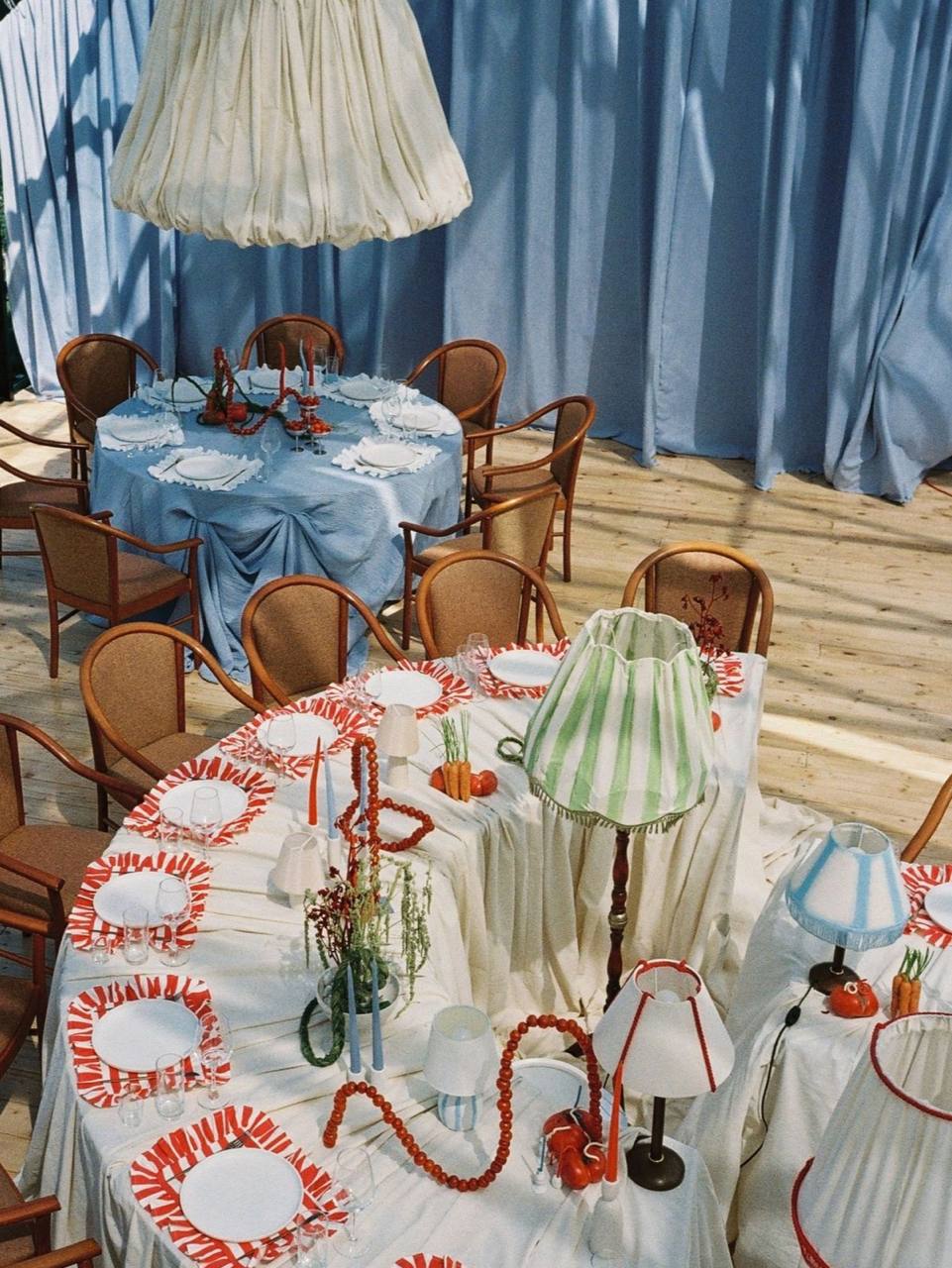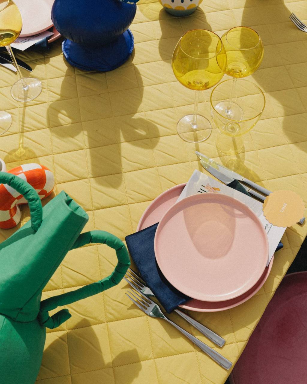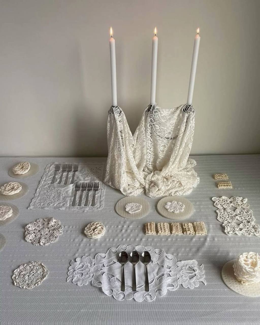 На смену строгим композициям приходят наивные цвета, воздушные ткани в стиле 90-х и предметы, которые вызывают тёплые улыбки — бабушкины тюлевые салфетки, разноцветные стаканы и ретро-сладости вроде ирисок и мармелада.