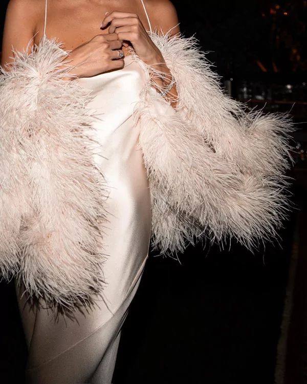 В нарядах это широкие плечи, платья с драпировкой, костюмы с чёткой линией и золотыми акцентами, декоративные детали вроде массивных пряжек, ремней и аксессуаров из перьев. Для невест это роскошные вечерние платья, многослойные ткани, блестящие вставки и прозрачные элементы.