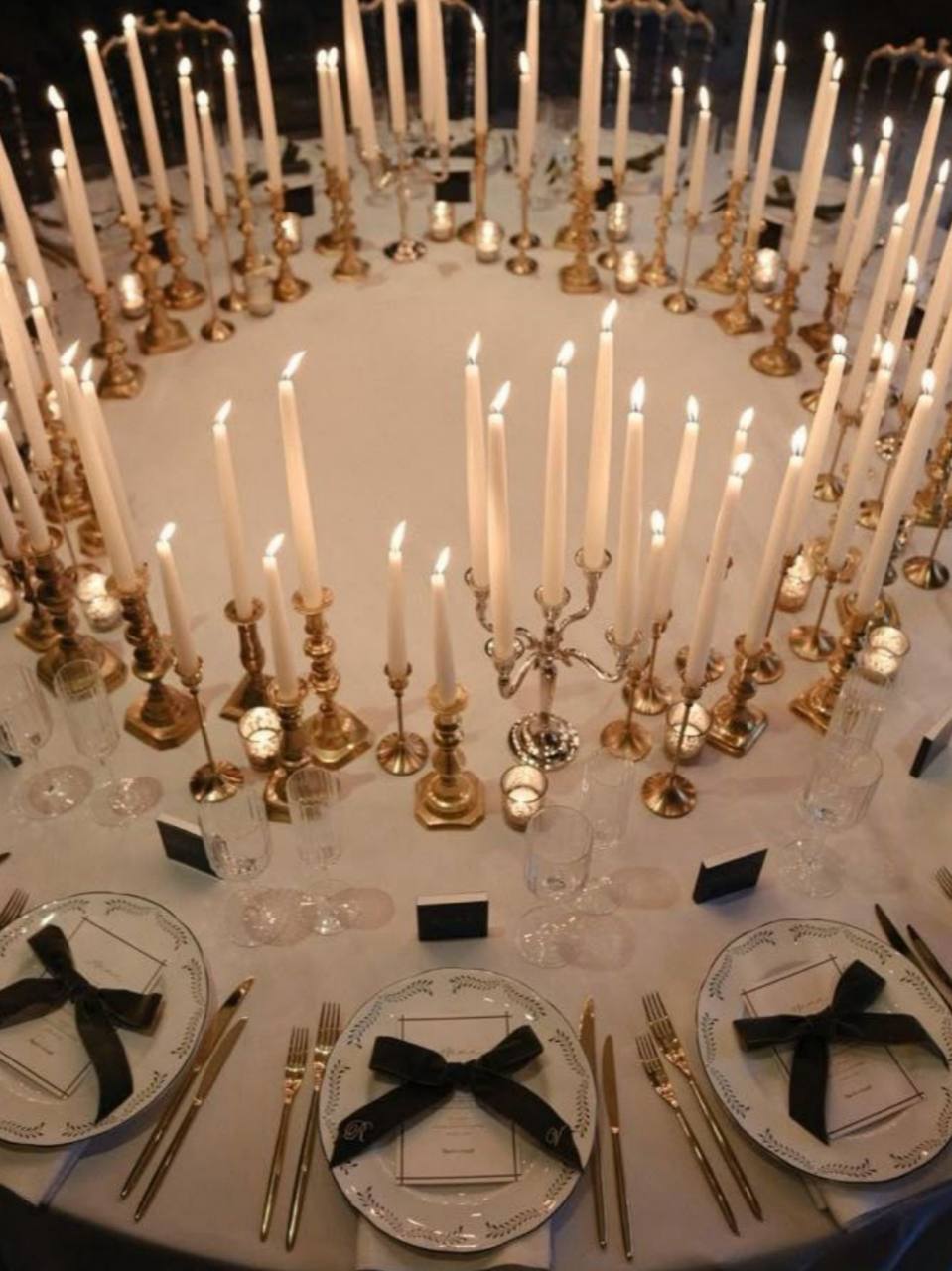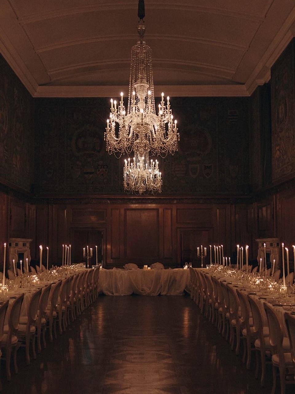 Здесь уместны массивные подсвечники, бокалы с золотой каймой, длинные столы с эффектной сервировкой, композиции из тёмных роз, гвоздик, анемонов, амаранта.