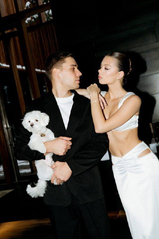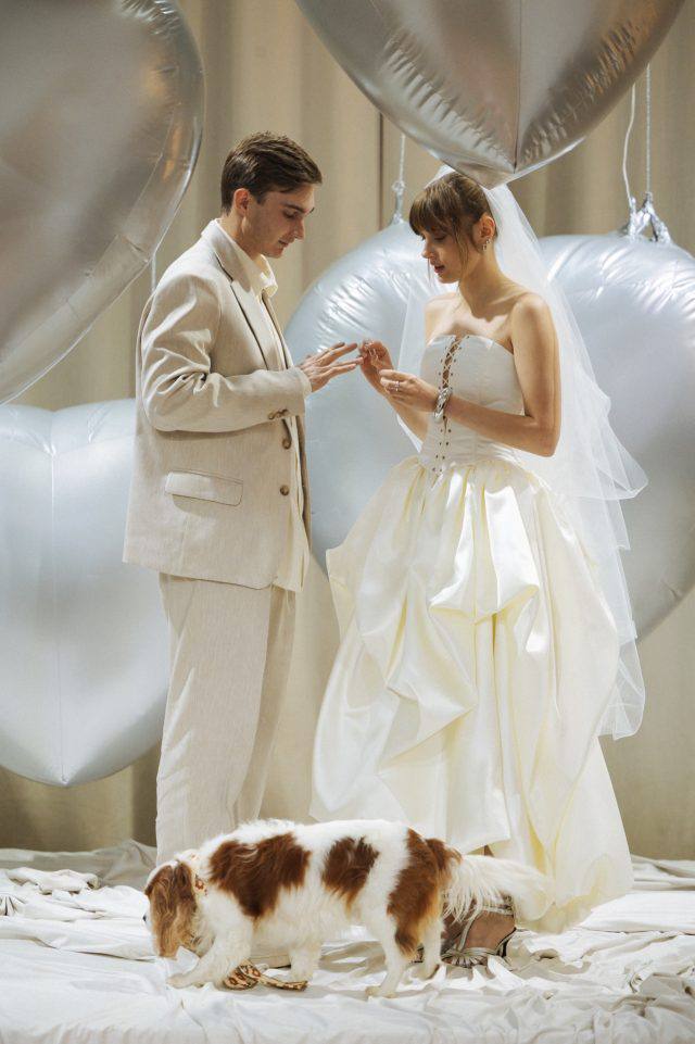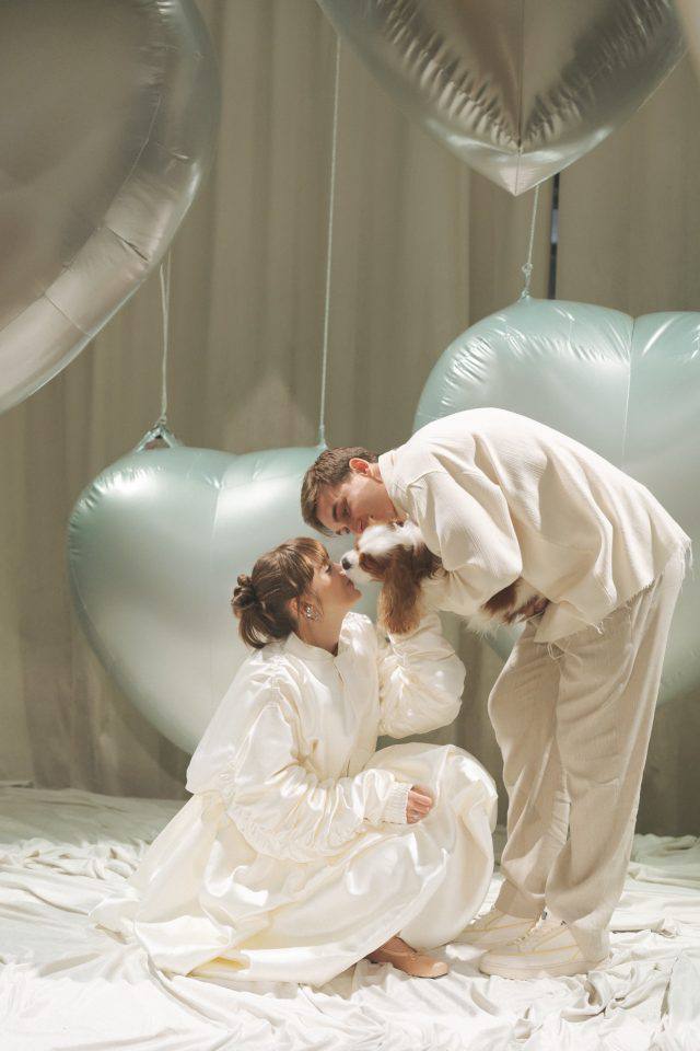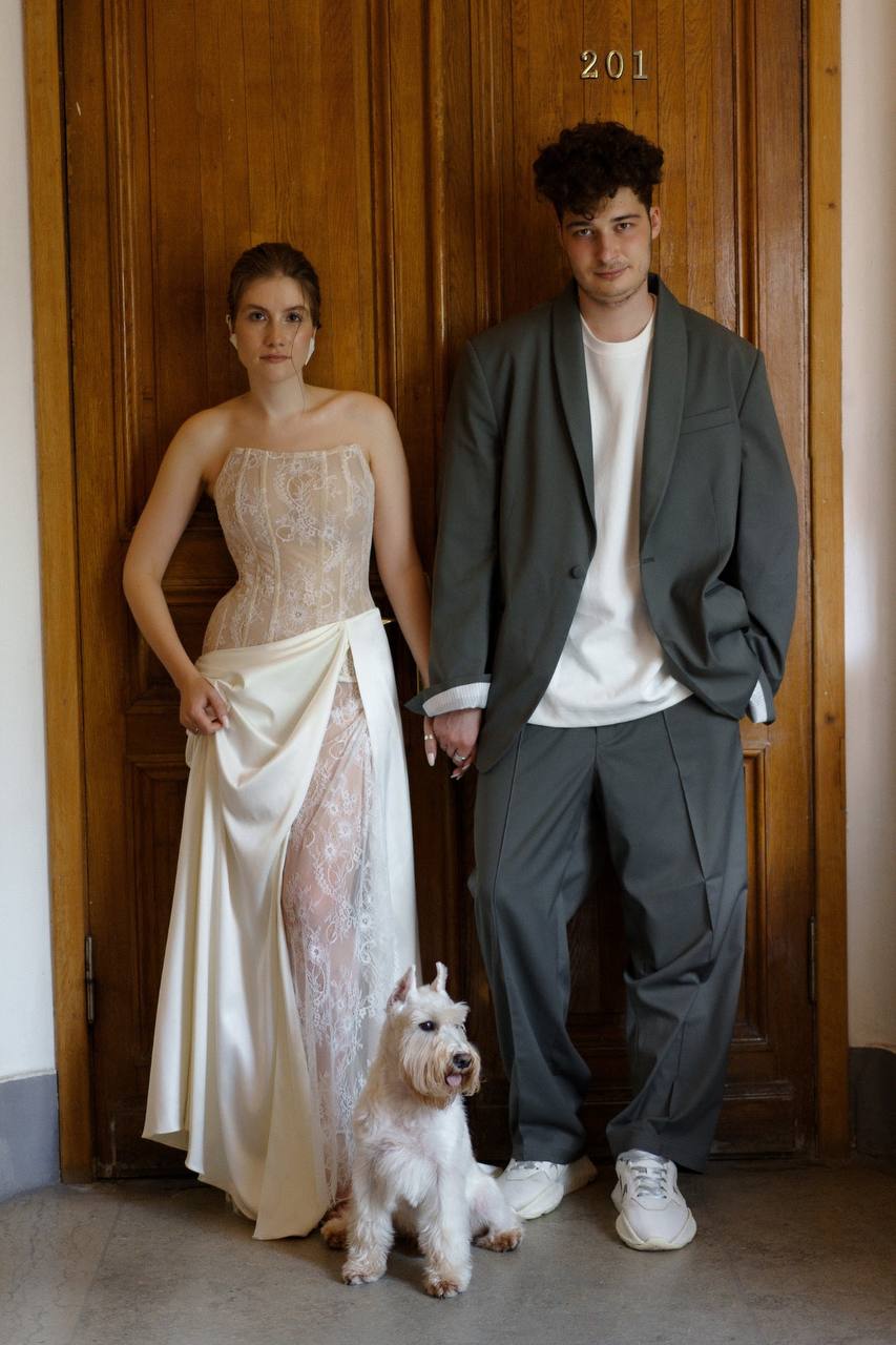 У ребят не было традиционной пышной свадьбы, зато была роспись и невероятно атмосферная и стильная съёмка, главной «фишкой» которой стали их питомцы. В итоге, им удалось запечатлеть их маленькую семью в полном составе.