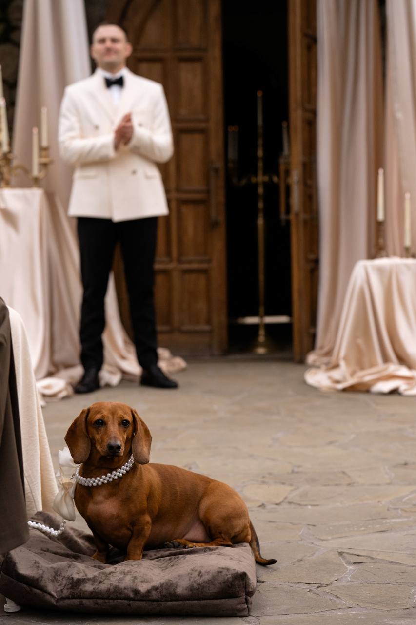 Активную собаку можно вовлечь в церемонию: проводить невесту по проходу или вынести кольца. Спокойного питомца лучше оставить рядом с женихом у алтаря или подготовить уютное место в лаунж-зоне.