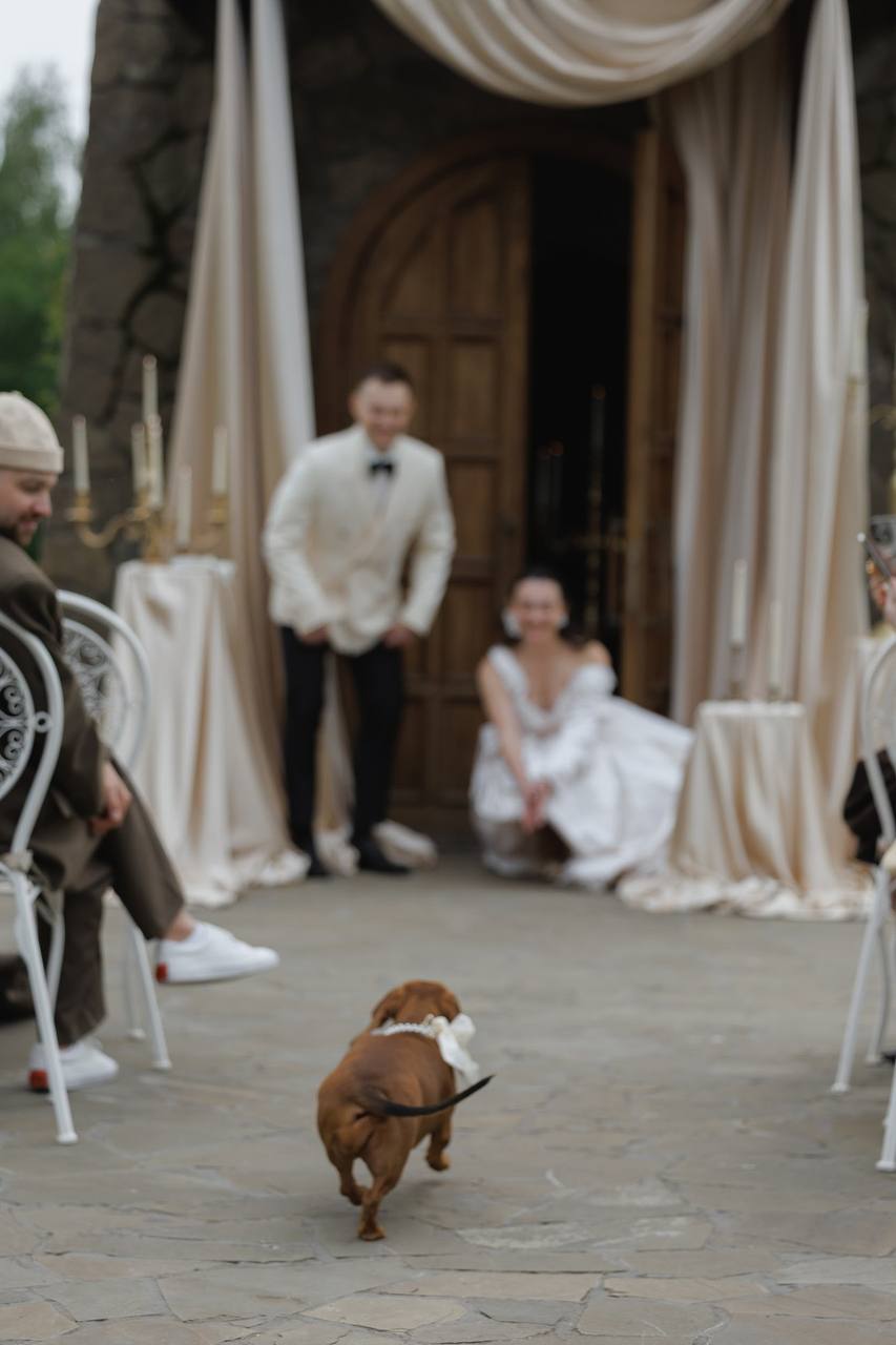 У пары было красивое торжество в винтажном настроении, но особенно эмоциональной получилась церемония — кольца ребятам вынесла такса по имени Лапа, которая в этот день была в центре внимания и тоже наслаждалась праздником.