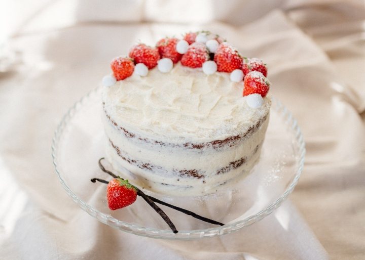 Спатулой обмазать бока и верхушку торта остатками заварного крема. Украсить клубникой и шариками клюквы в сахарной пудре.