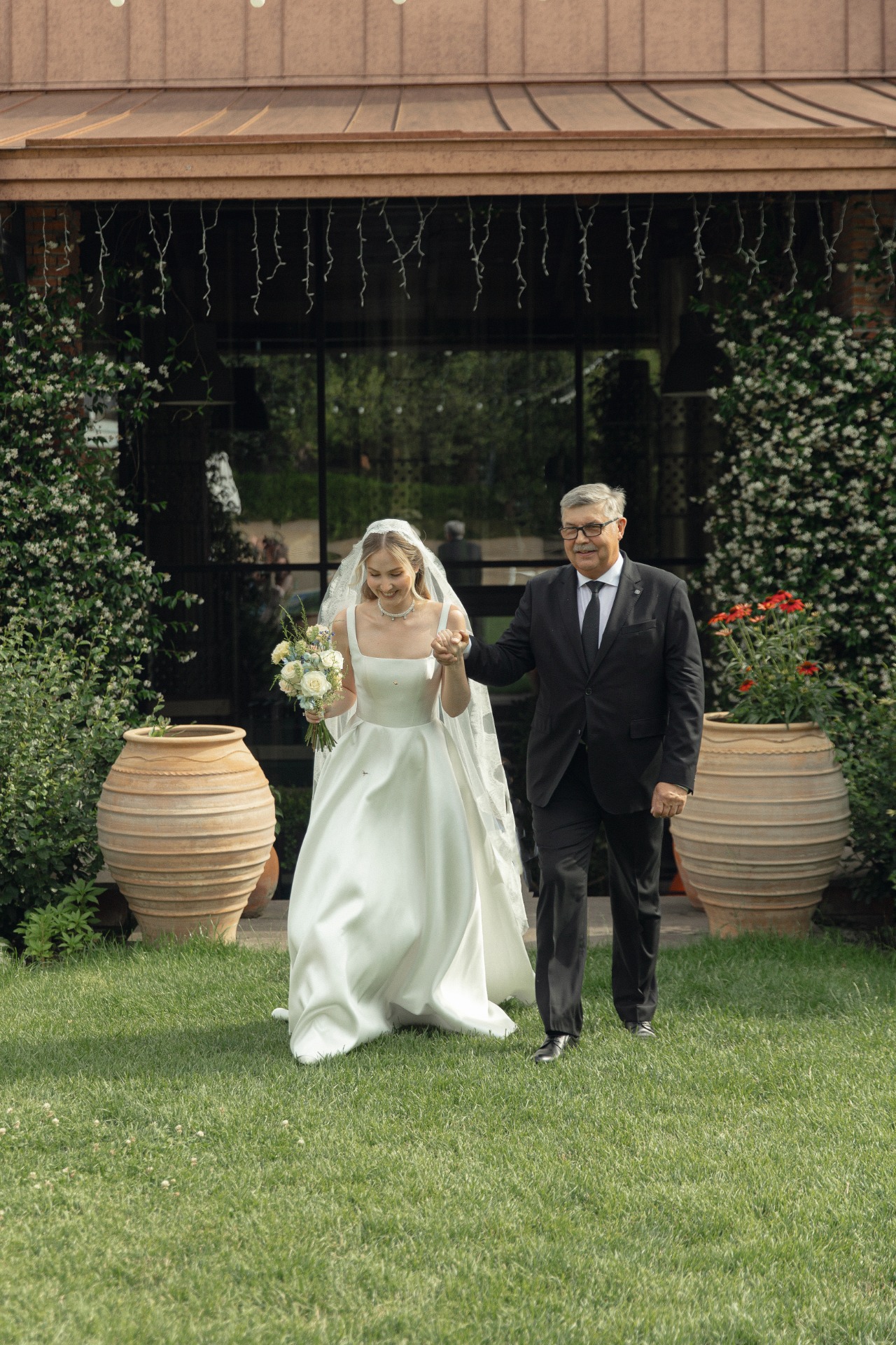 Примерно за год до свадьбы я увидела пост своей знакомой, где она делилась снимками уютной, душевной церемонии на винодельне в Грузии. Там был длинный стол под деревьями, вечерние огоньки, спокойствие и атмосфера праздника для своих. Я сразу поняла, что хочу провести свою свадьбу именно так.