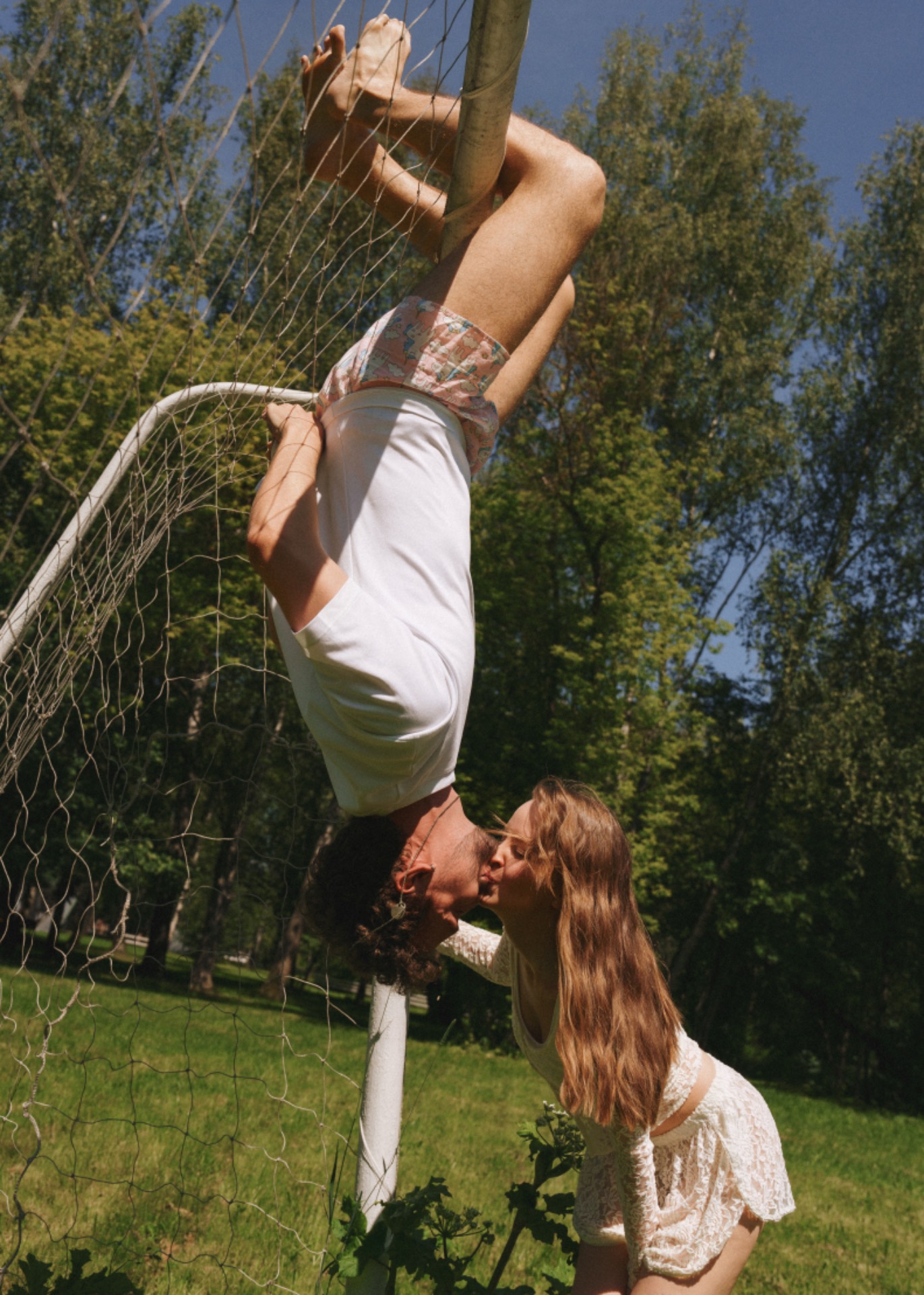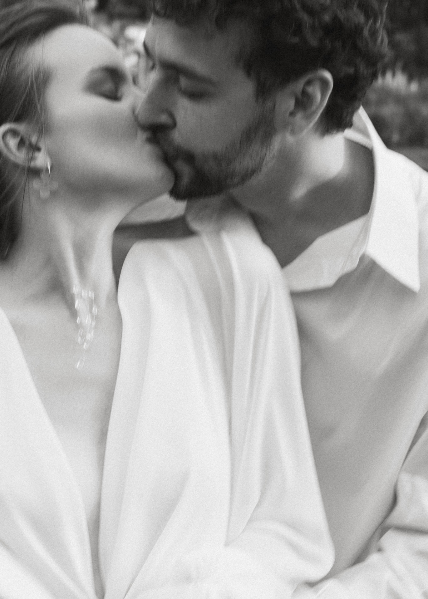 В образе жениха Вова сразу исключил пиджак, ему хотелось сделать стиль менее официальным. Он искал широкие брюки с защипами на завышенной талии, но найти их не удалось. Нас выручил Артём Мидда: Вова заказал у него брюки и рубашку из тонкого хлопка. Дополнением к образу стали пуссеты в виде цветка нимфеи, которые он случайно нашёл у бренда Prud.