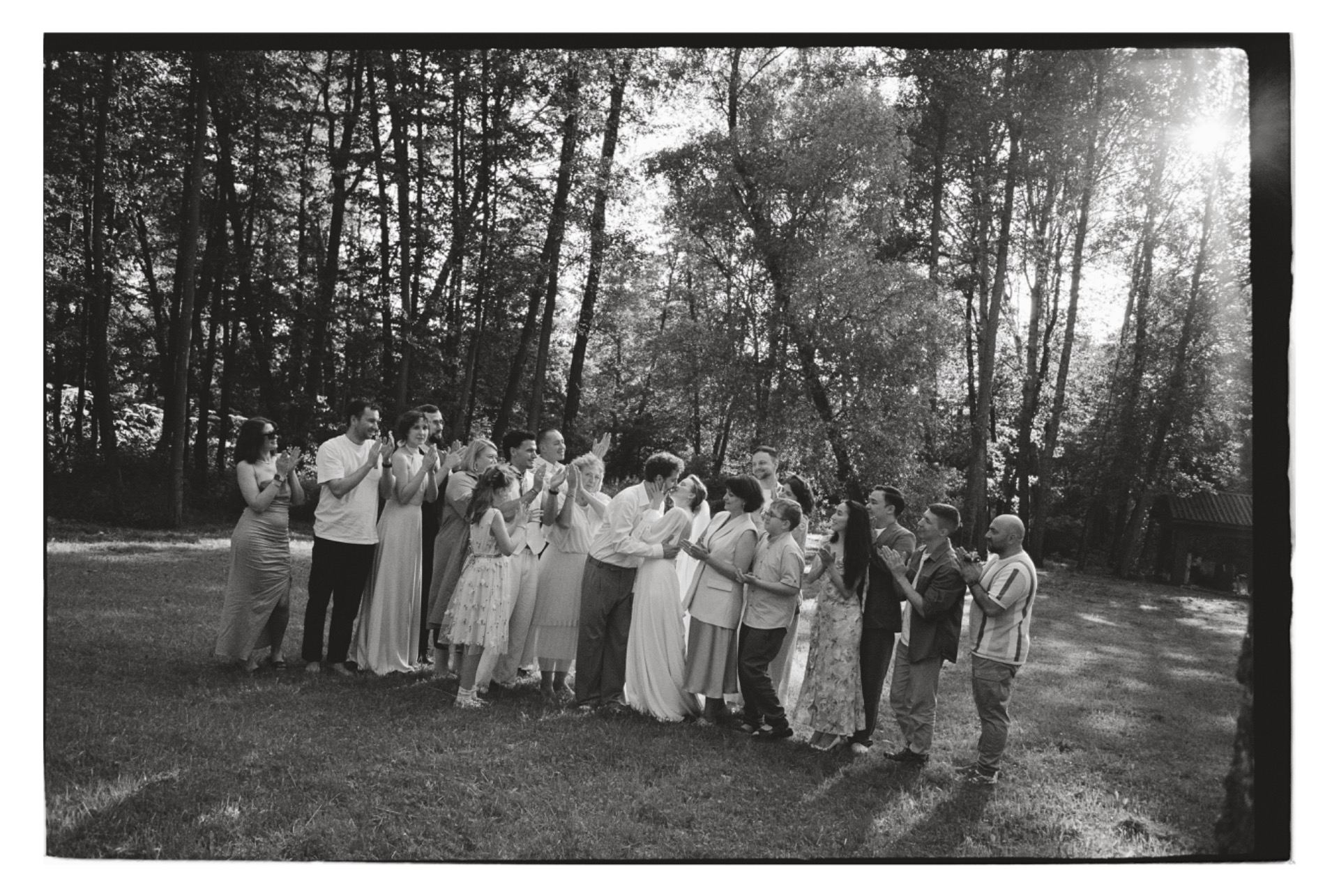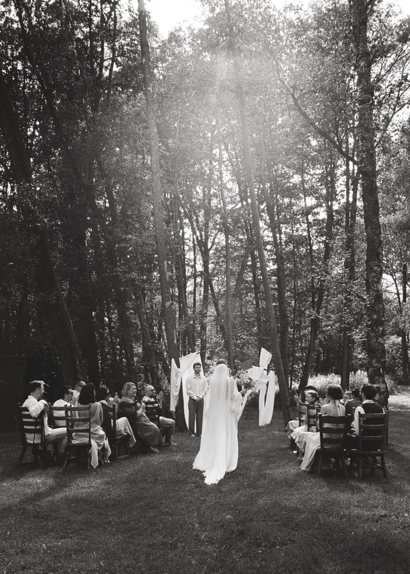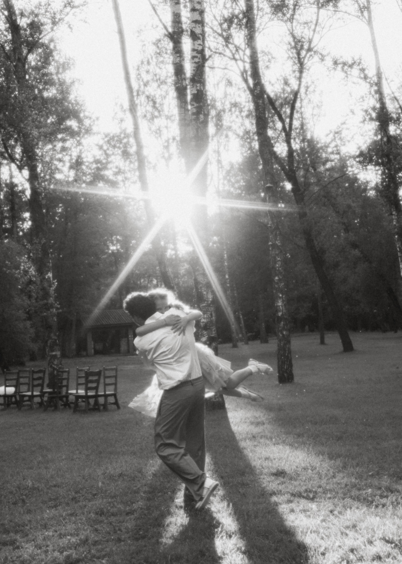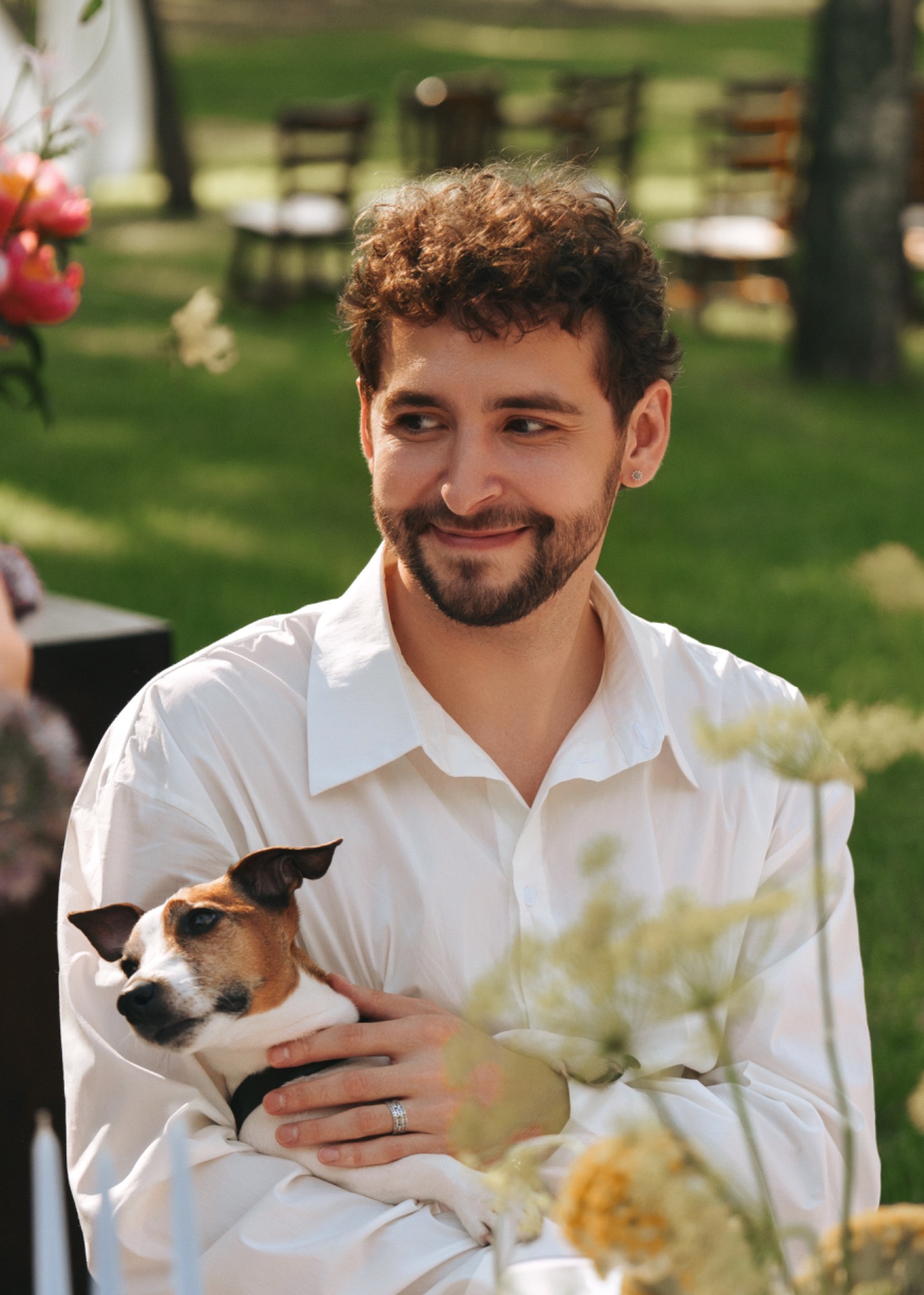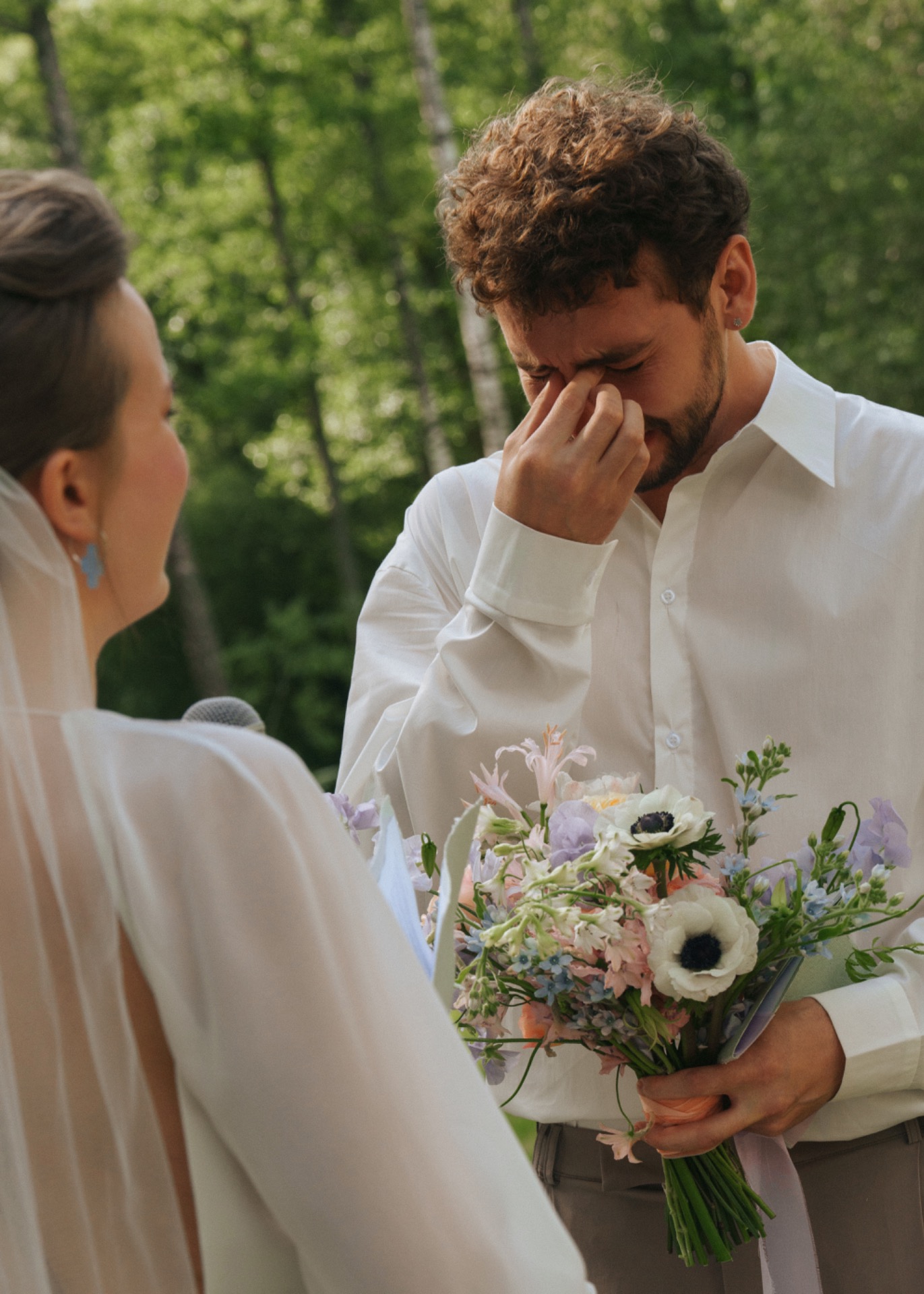 Церемонию вёл наш близкий друг, поэтому она получилась максимально про нас, с множеством отсылок к нашей истории. На клятвах мы оба плакали, смеялись и улыбались. Мы оба любим плёночные фотографии, поэтому прямо на церемонии сняли друг друга, чтобы навсегда запечатлеть этот момент.