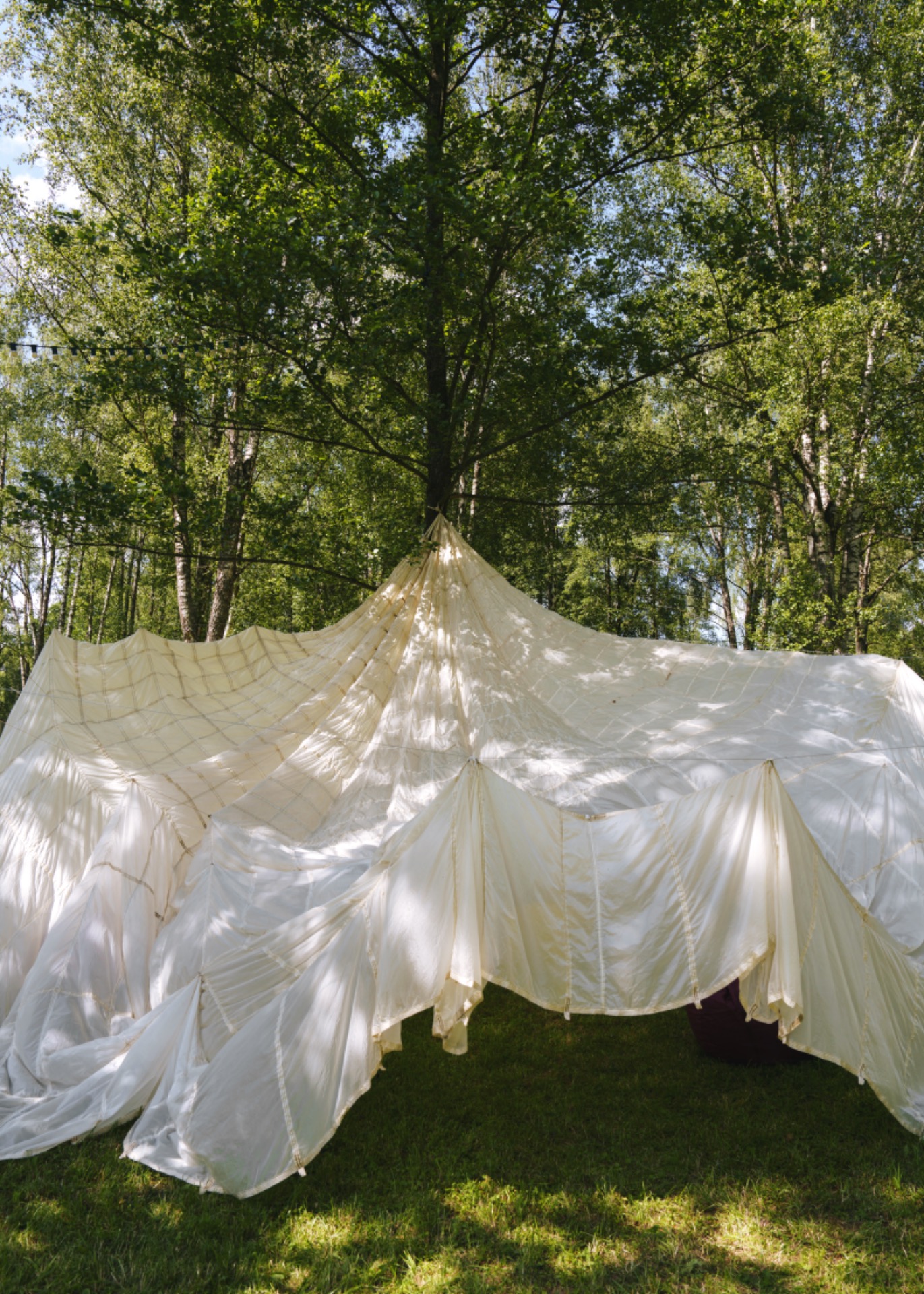 На ватмане, который мы разместили на столе, гости оставляли разноцветные пожелания и рисунки. К вечеру мы включили гирлянды, зажгли свечи и фитили на столе, атмосфера стала ещё уютнее. Особым акцентом вечера стала невесомая лаундж-зона под парашютом, натянутым между деревьев.