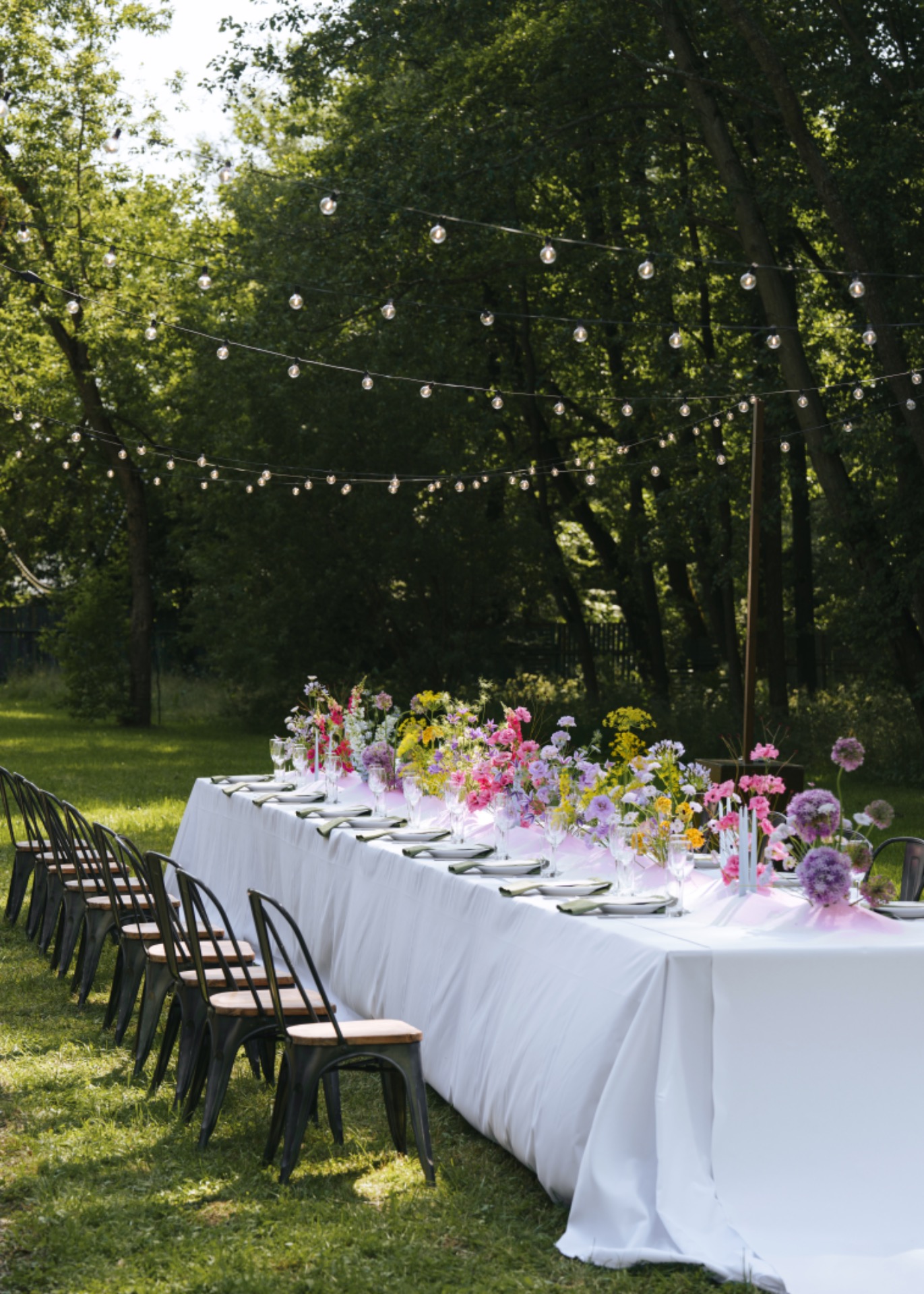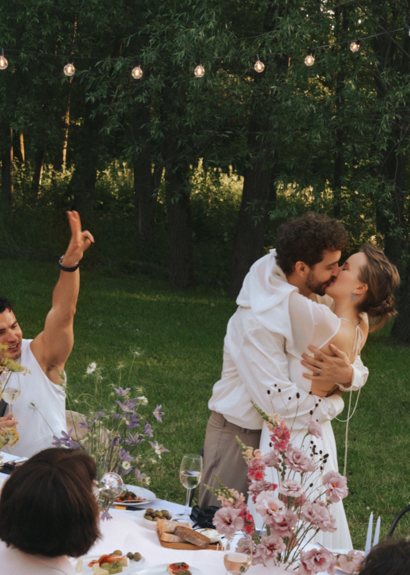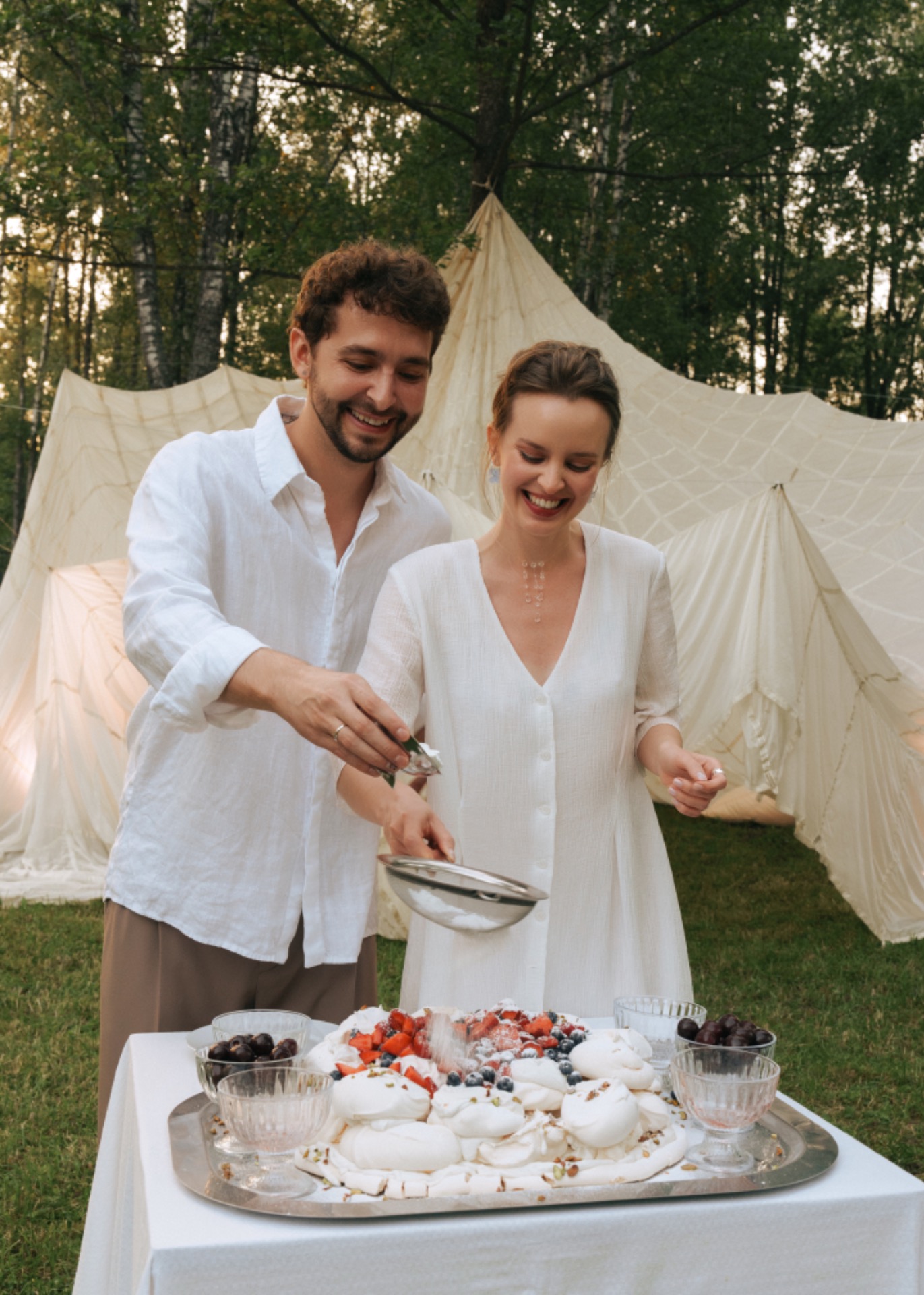 Подготовка заняла у нас 4 месяца. Нашим главным желанием было устроить праздник на природе: под открытым небом, за одним длинным столом вместе с нашими гостями. Мы хотели провести этот вечер в тёплой, расслабленной атмосфере, без строгого тайминга, чтобы полностью прочувствовать этот день.