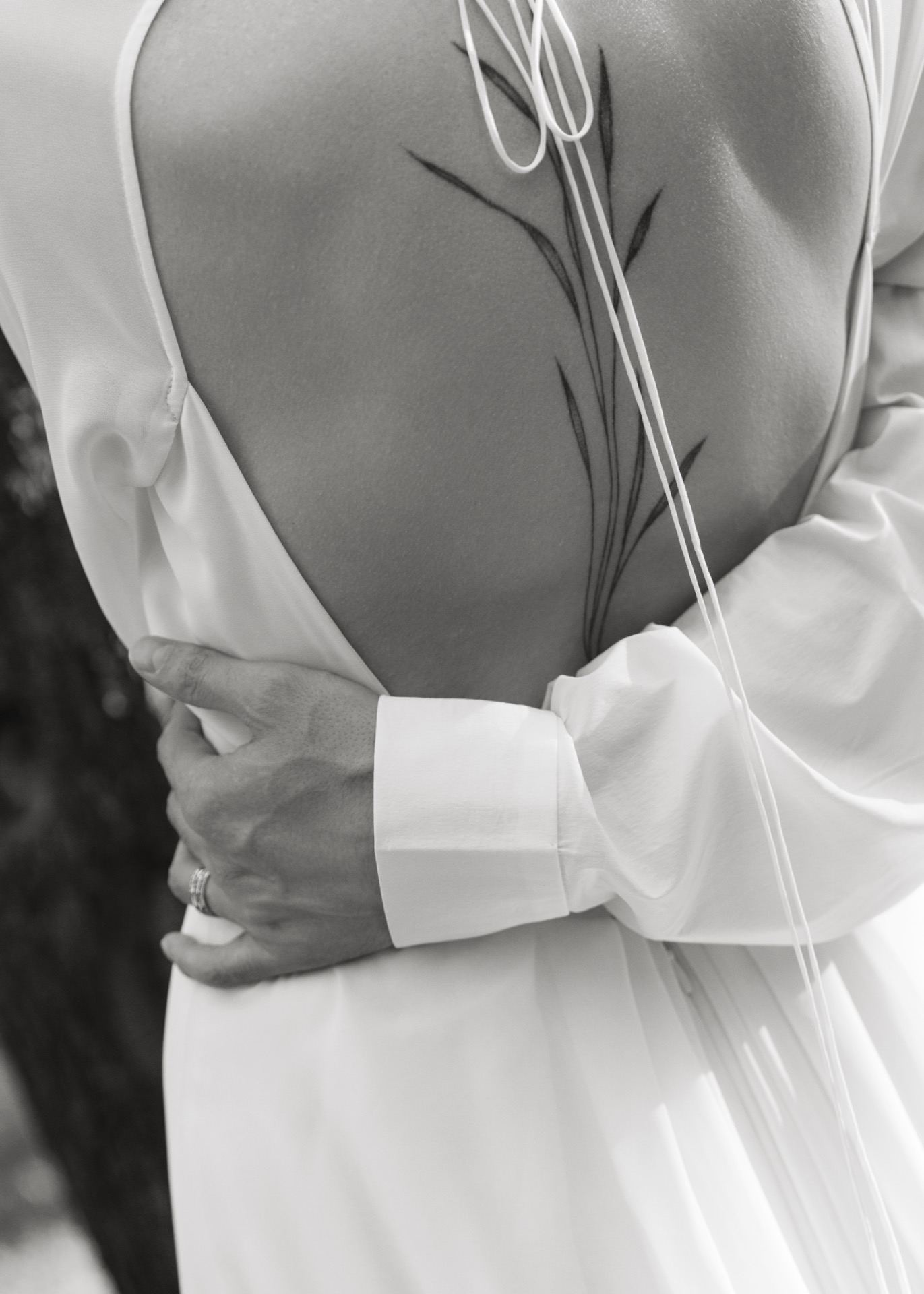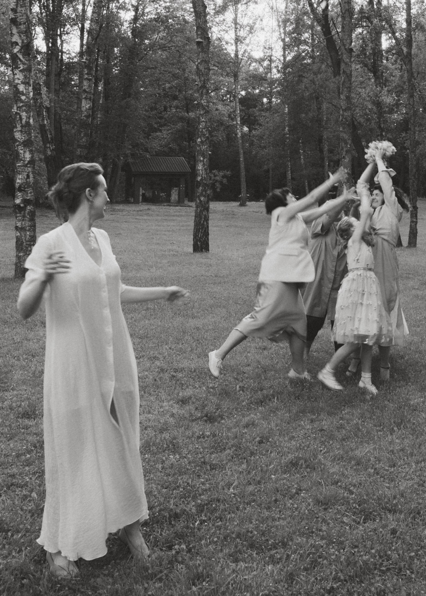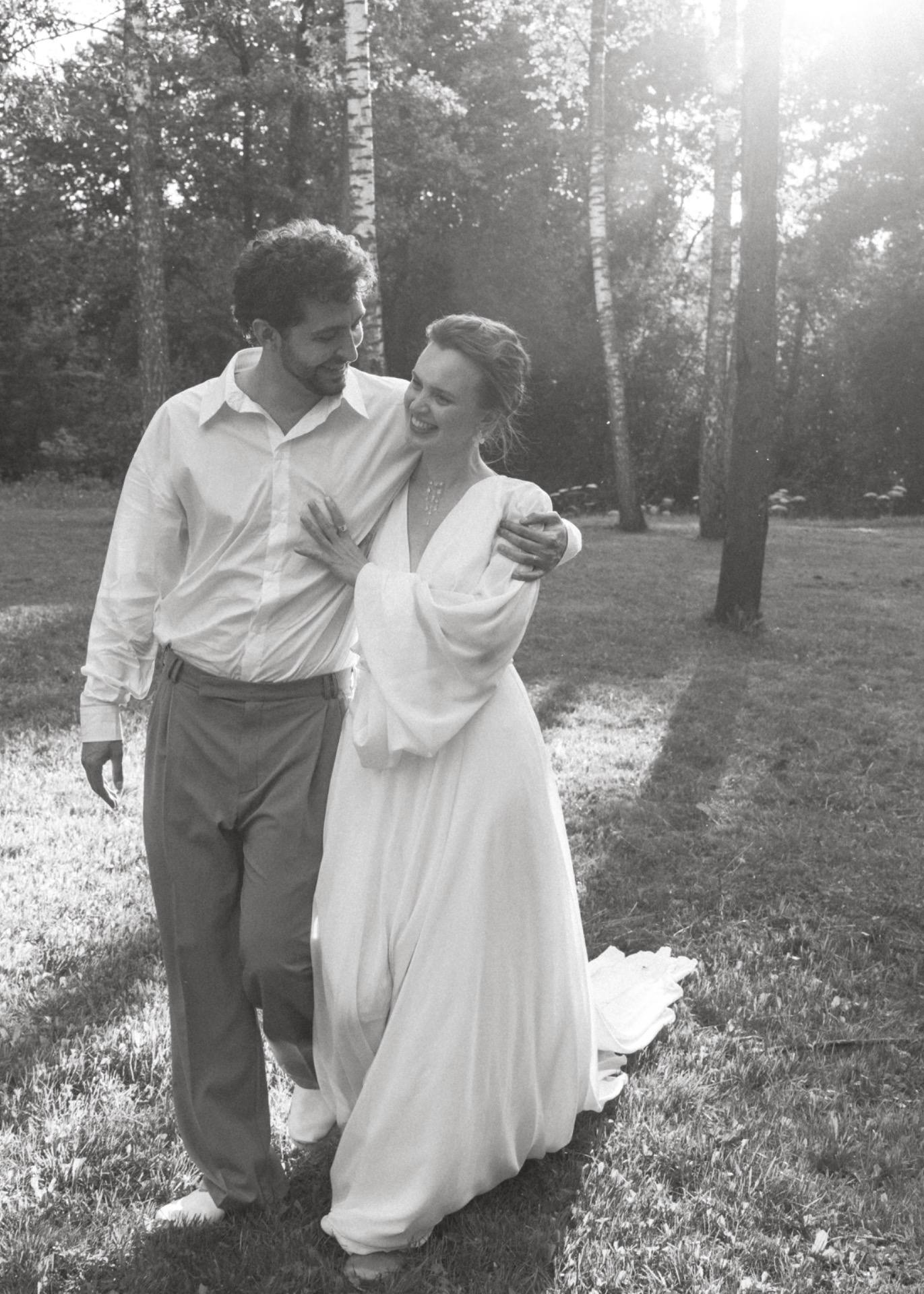 Параллельно я просматривала вечерние коллекции российских брендов, выбирая минималистичное, простое и элегантное. Так я нашла своё платье от бренда Murashka. Оно было таким, о котором я мечтала в детстве: воздушным, с длинным шлейфом и открытой спиной. Для завершающей части вечера я переоделась в лёгкое, полупрозрачное платье томского бренда If I do. Мой образ органично дополнило украшение в виде капель росы, которое я заказала по собственному эскизу у doroteya.jewelry, а серьги-цветы нашла у бренда Alvaar.