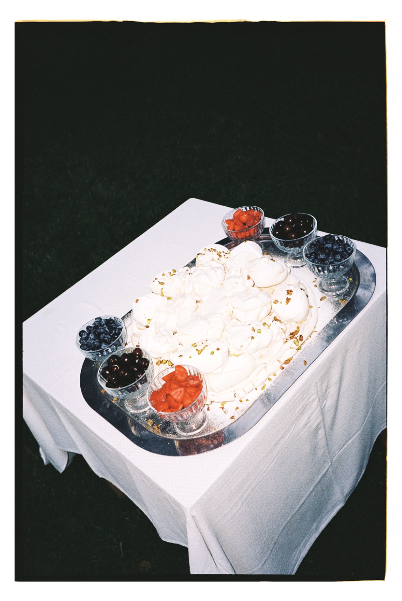 Мы решили отказаться от классического торта и придумали торт-безе с кокосовыми сливками и фисташками, который мы сами украсили ягодами перед подачей.