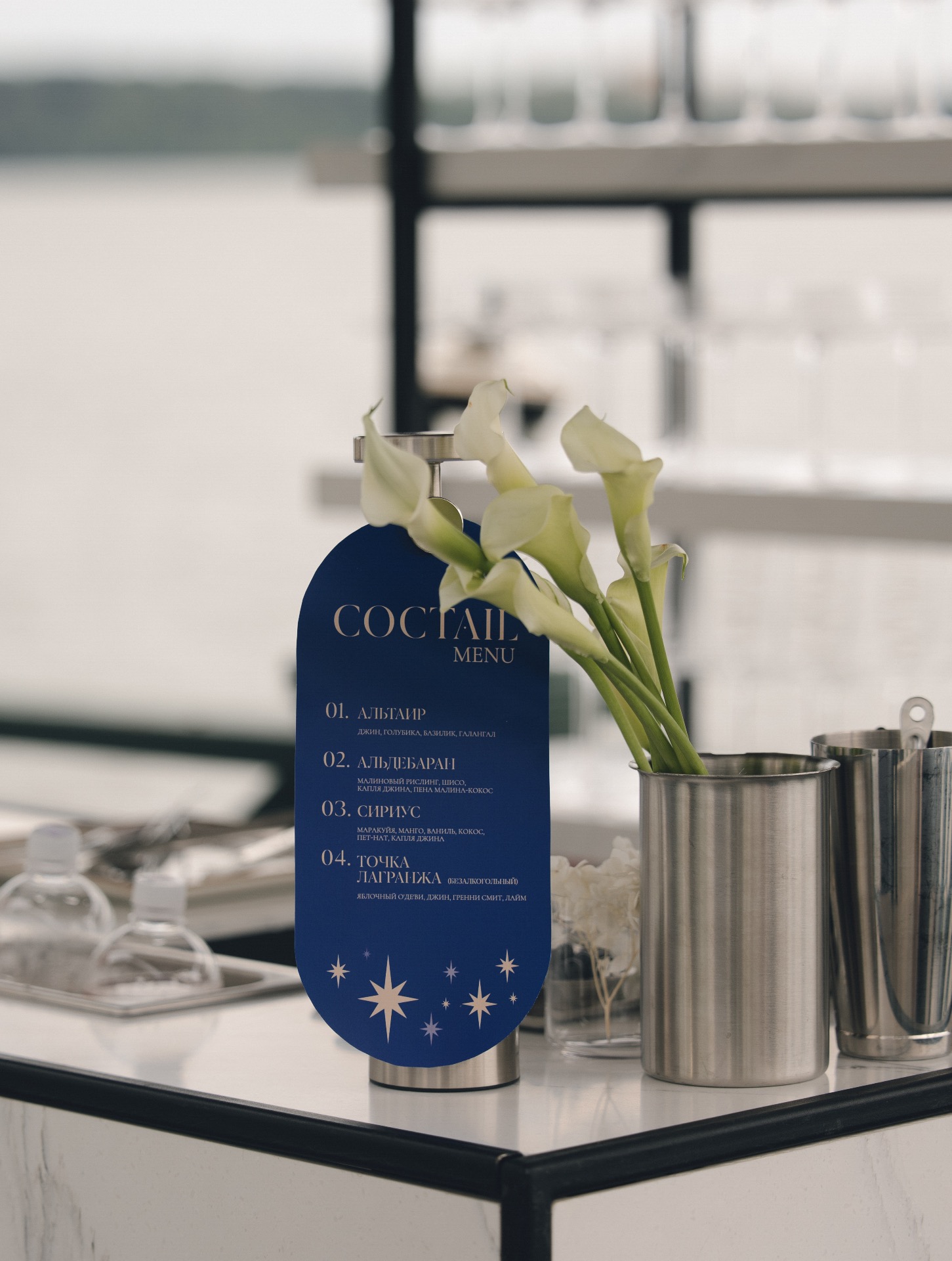 Тема звёзд также поддержана в баре с помощью названий коктейлей. Кроме того, на велкоме, в зоне встречи гостей, работали нумеролог и скетчист.
