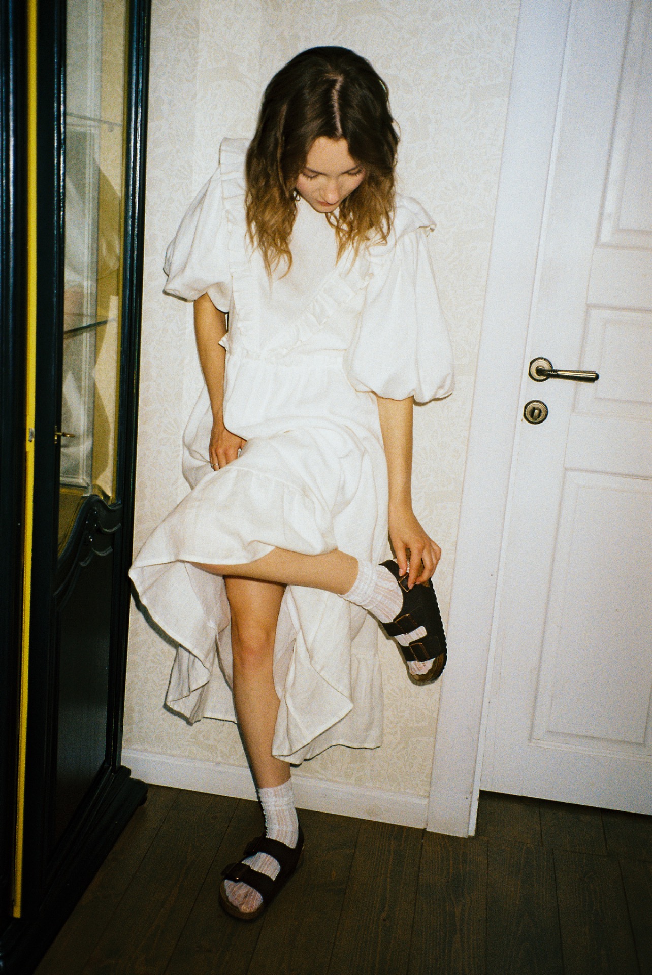 Обувь под мой наряд должна была быть удобной, так как основное празднество проходило в саду дома, поэтому мне показалось, что Birkenstock будет отличным вариантом. Я дополнила образ ажурными носочками, естественным макияжем и свободными локонами.