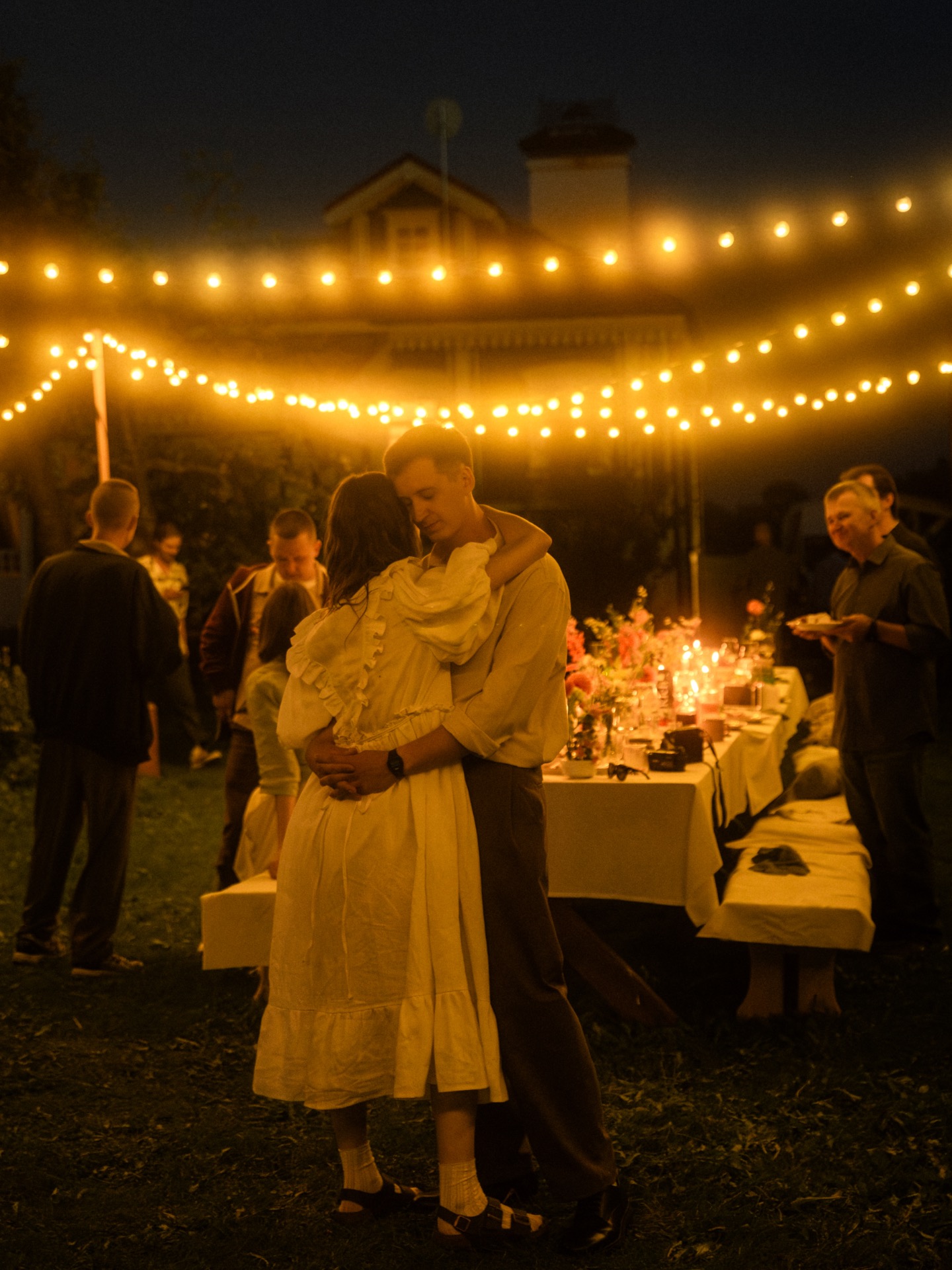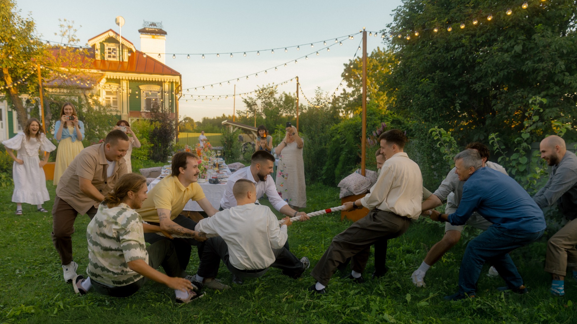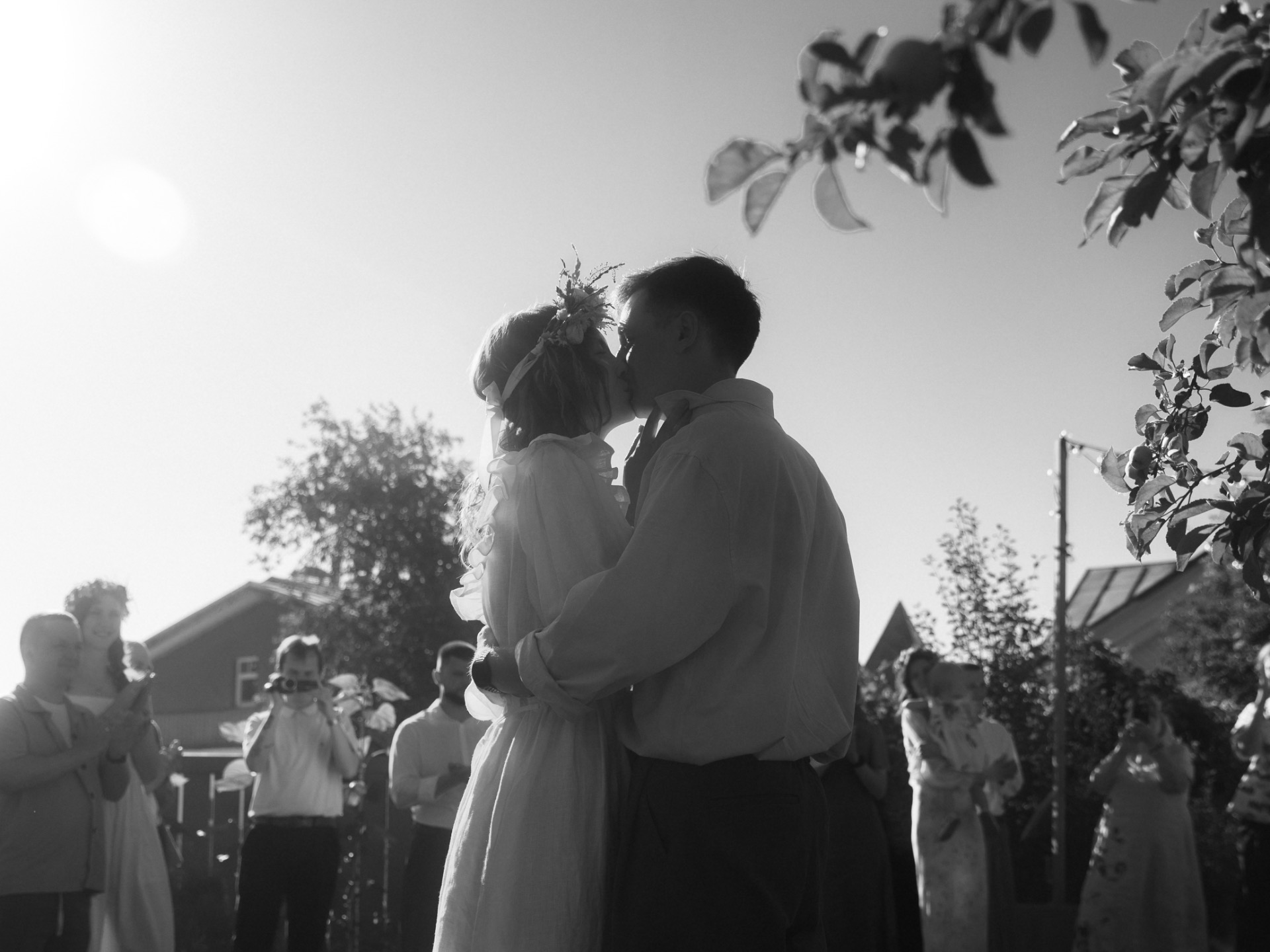 Вместо традиционного бросания подвязки Макс кинул дубовый банный веник. Гости остались от этой идеи в восторге. Вечер закончился при тёплом свете костра, с тортом и чаем из самовара.