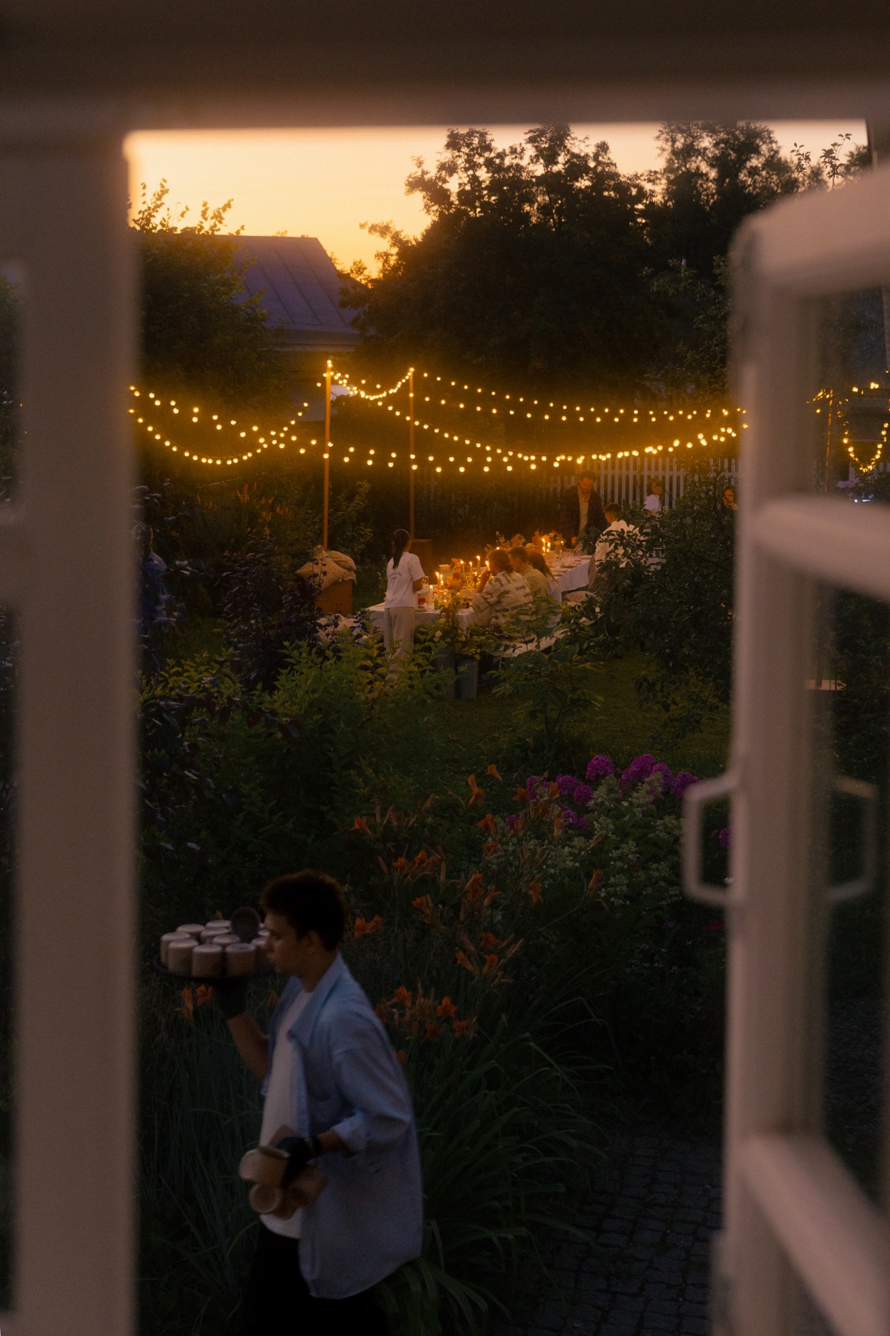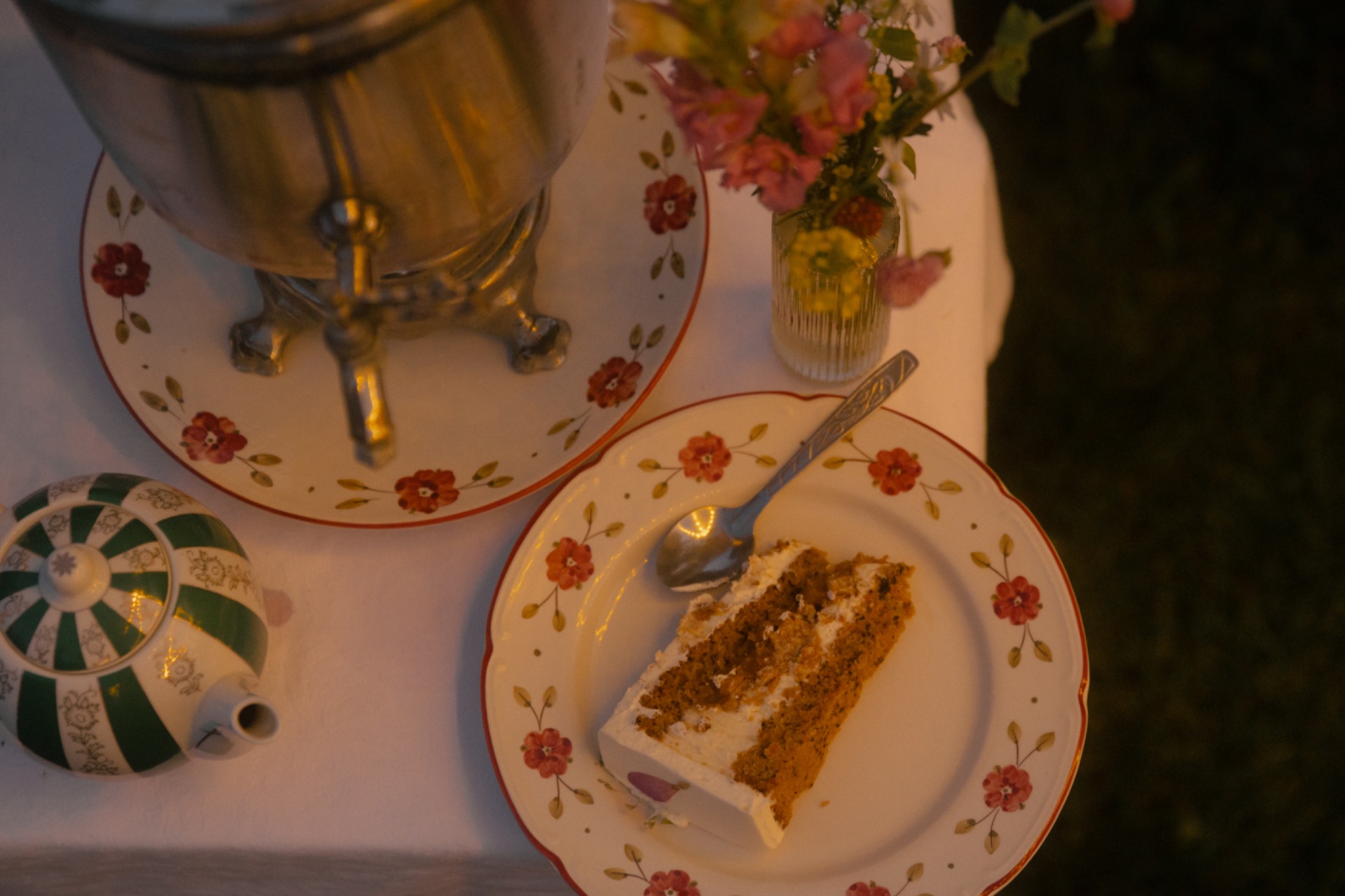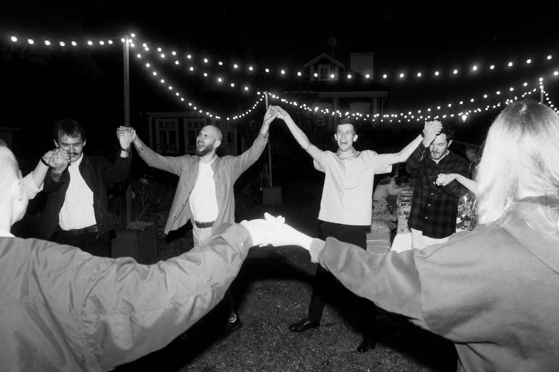Вместо традиционного бросания подвязки Макс кинул дубовый банный веник. Гости остались от этой идеи в восторге. Вечер закончился при тёплом свете костра, с тортом и чаем из самовара.