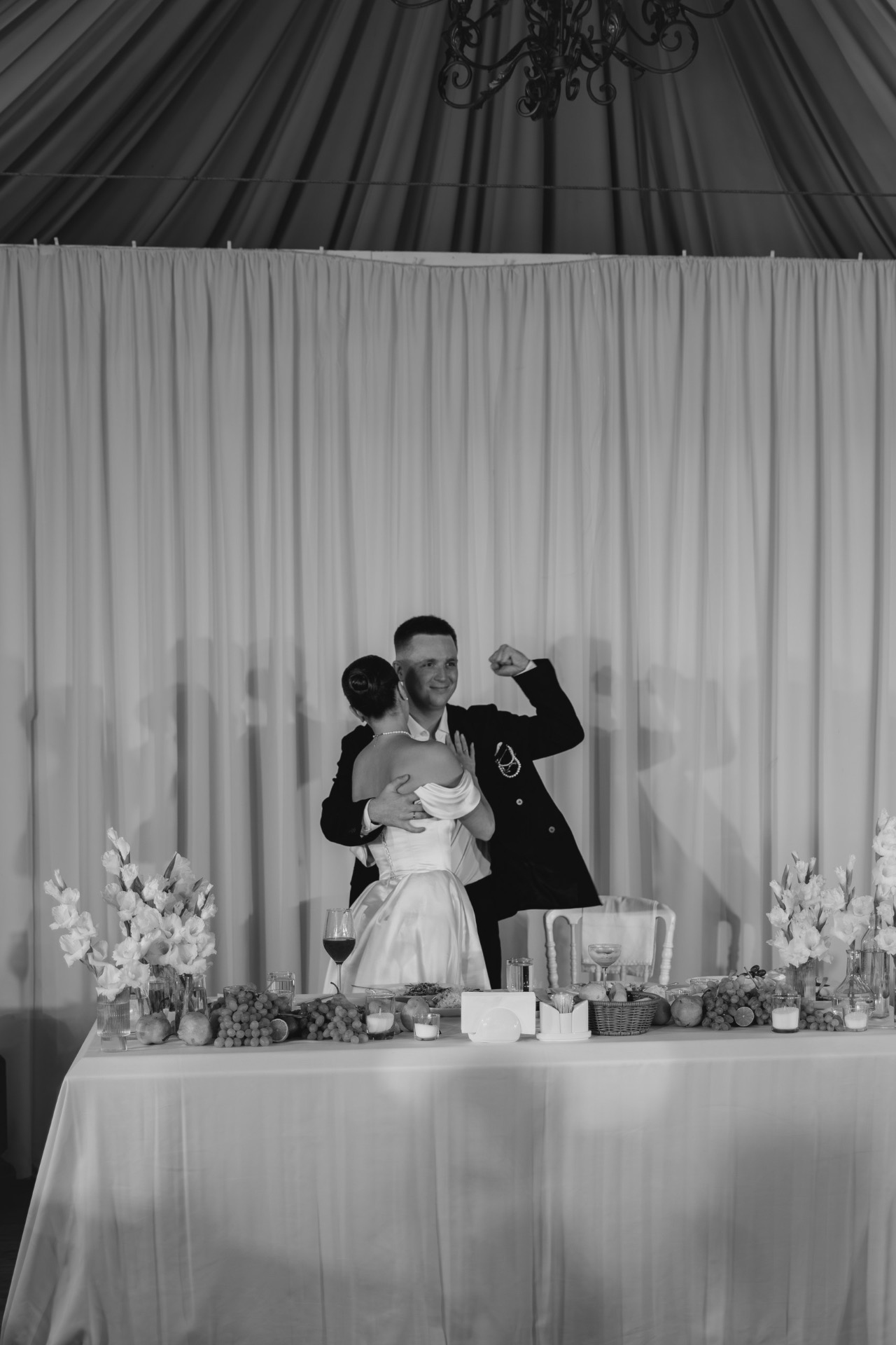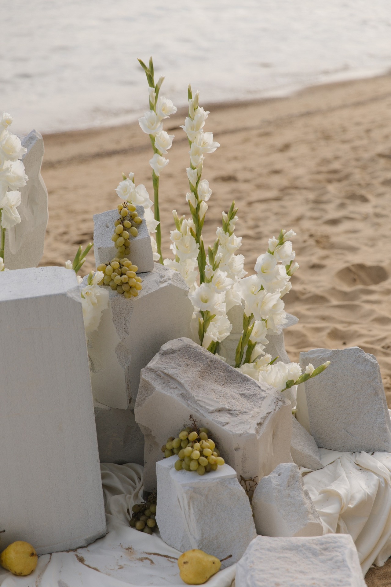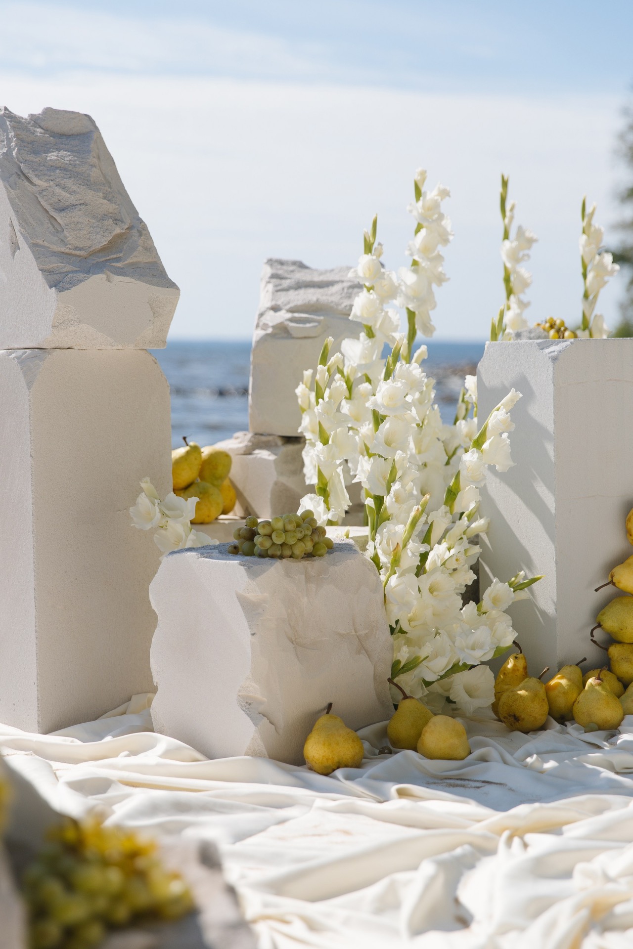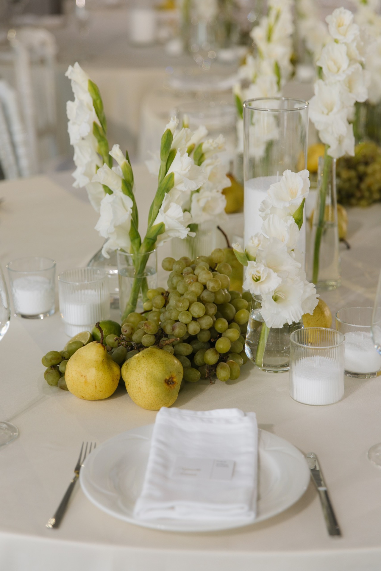 Также для украшения стола и выездной регистрации мы добавили груши и виноград — простые детали, которые создавали особую атмосферу.