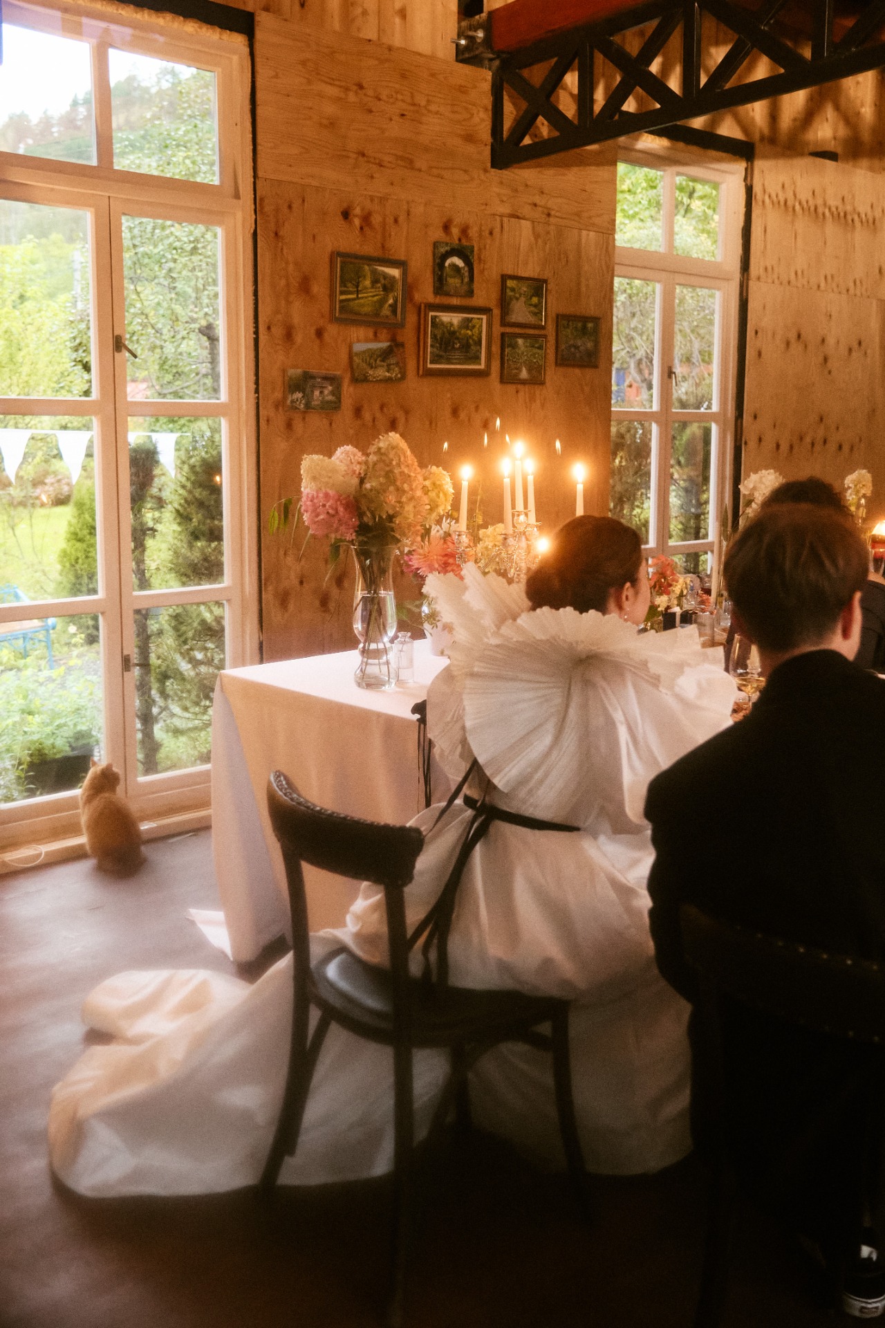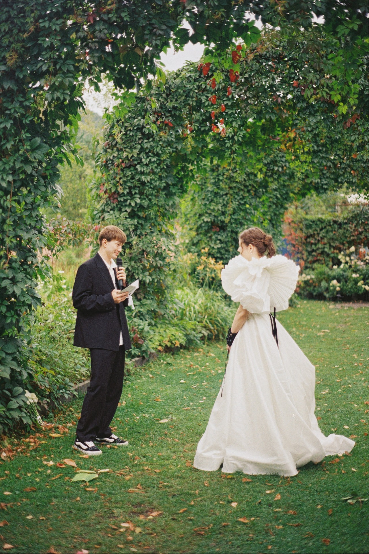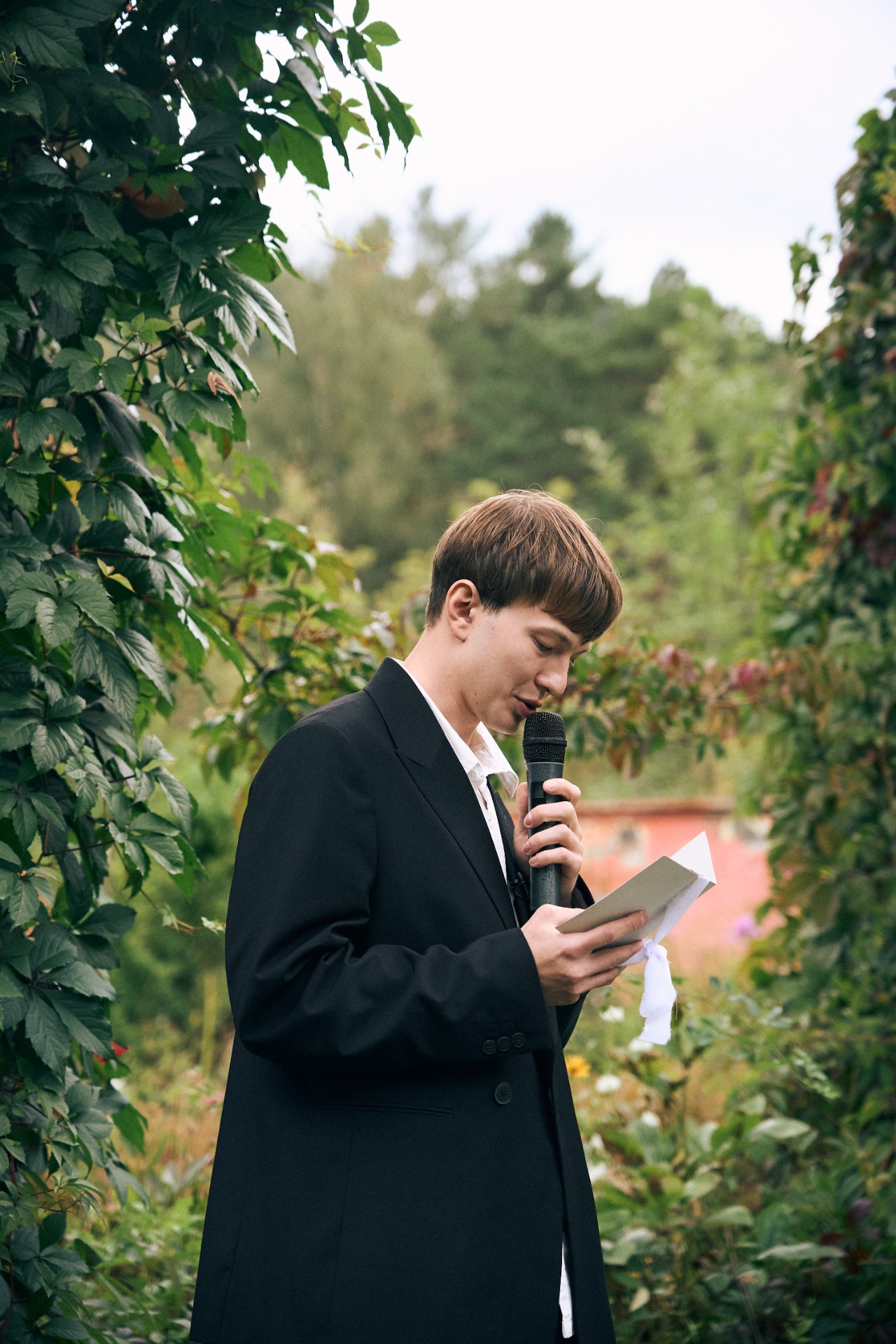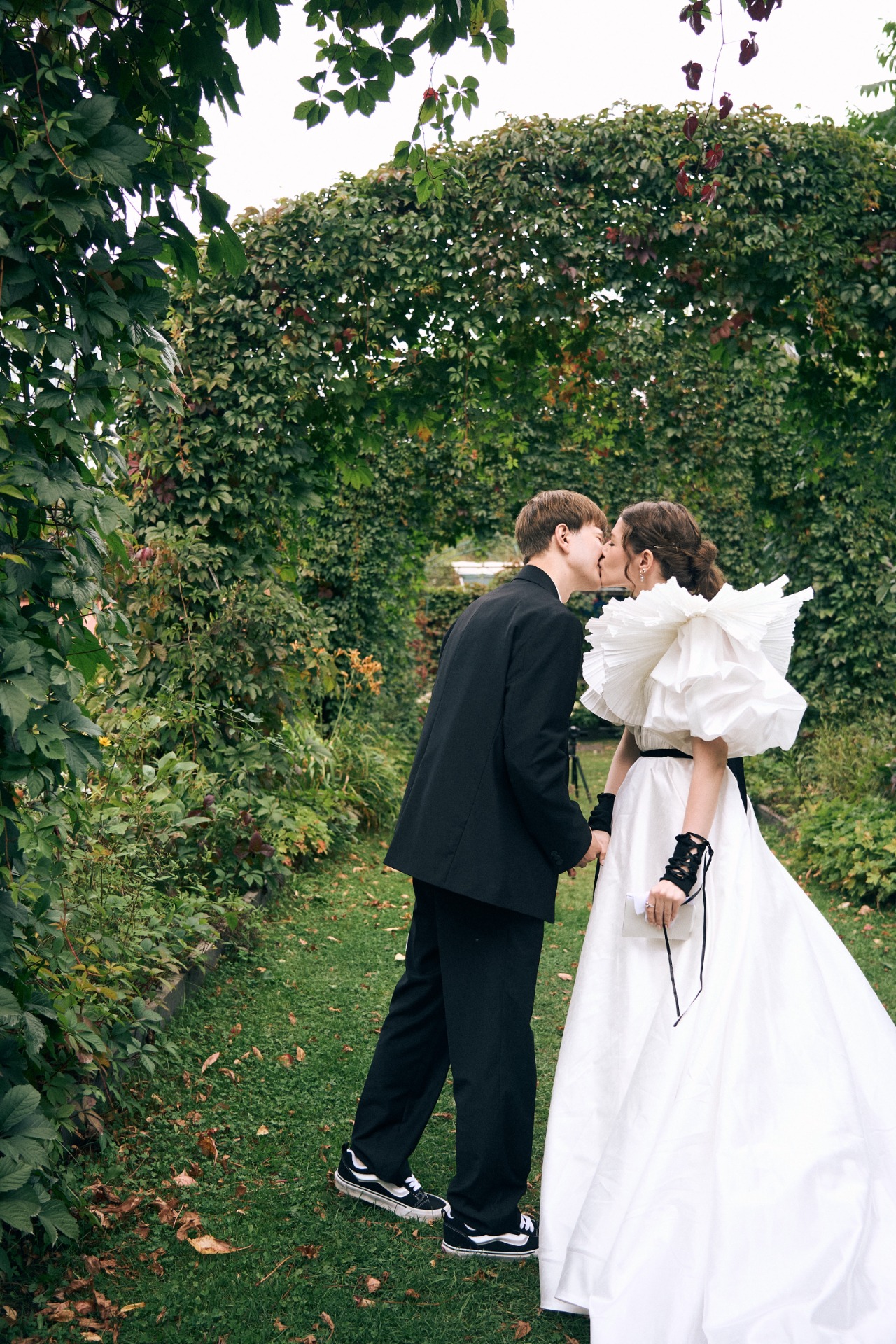 Серёжа выбрал чёрный костюм свободного кроя, в котором ему было комфортно и спокойно. Вместо бутоньерки я приколола к его лацкану брошь-ласточку — символ верности и дома. Эта брошь когда-то принадлежала моей близкой подруге и вдруг, в день свадьбы, оказалась у нас. А моё основное платье с его мягкими складками и разлетающимися слоями будто перекликалось с образом птичьих крыльев.