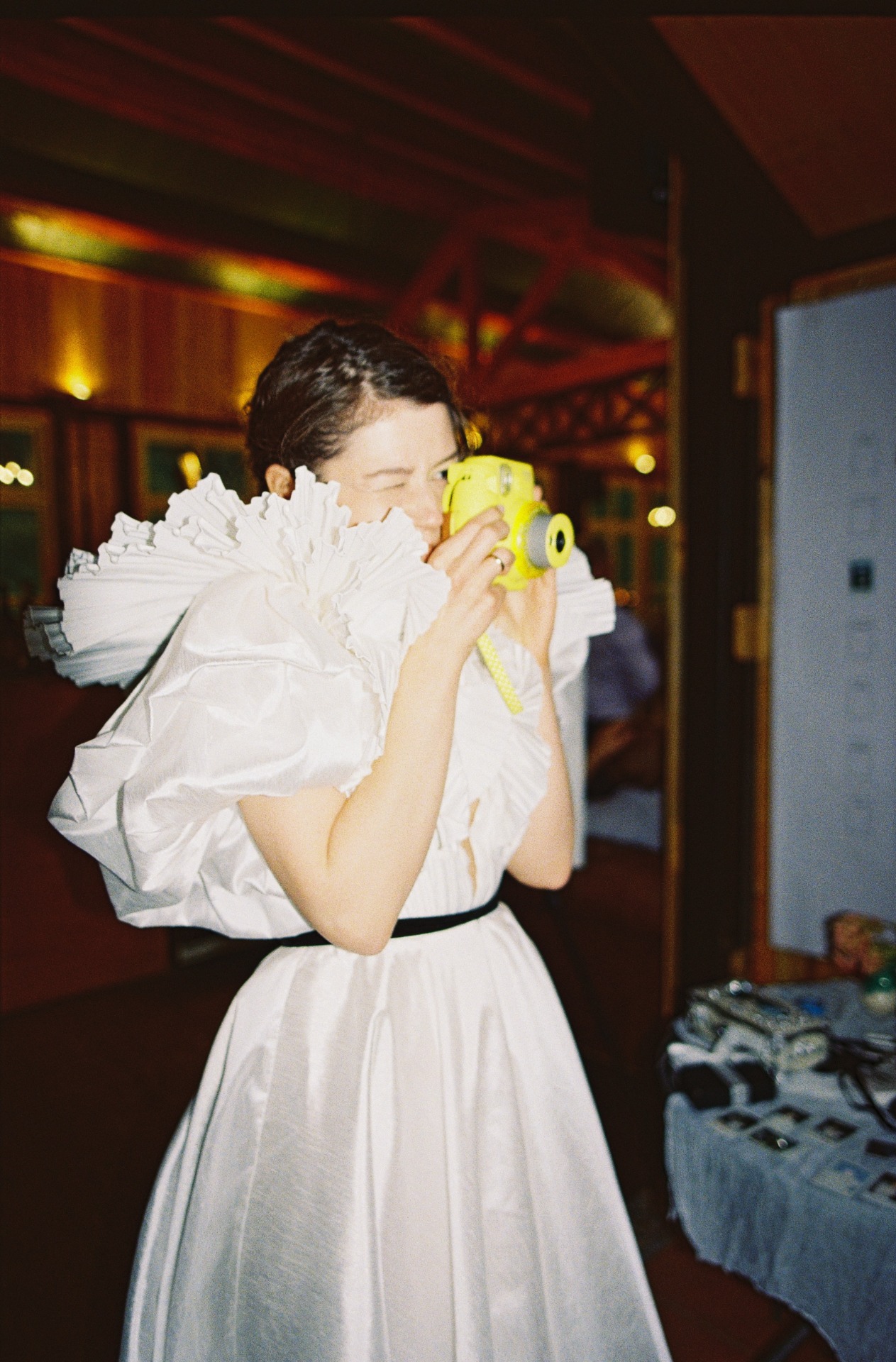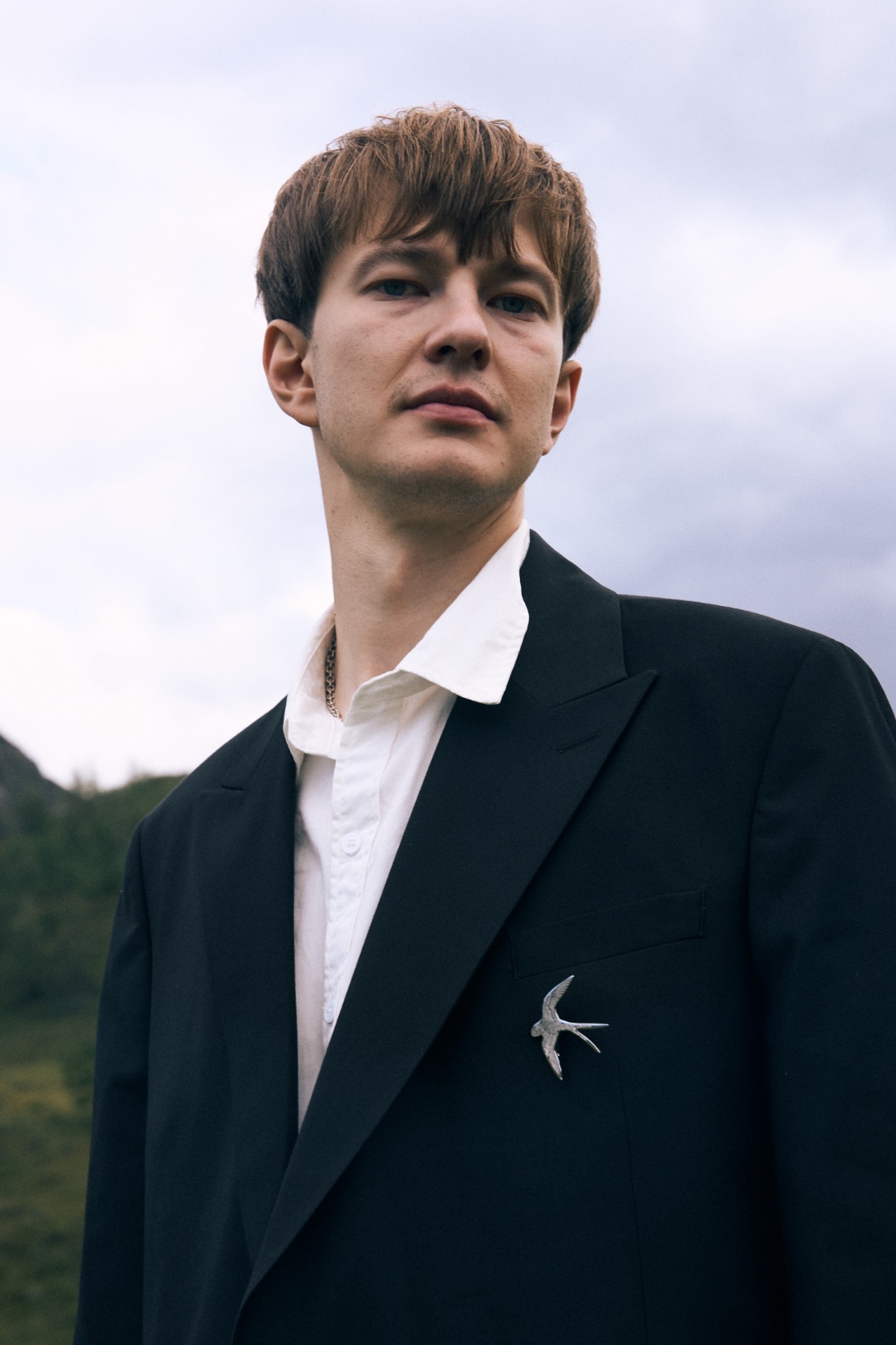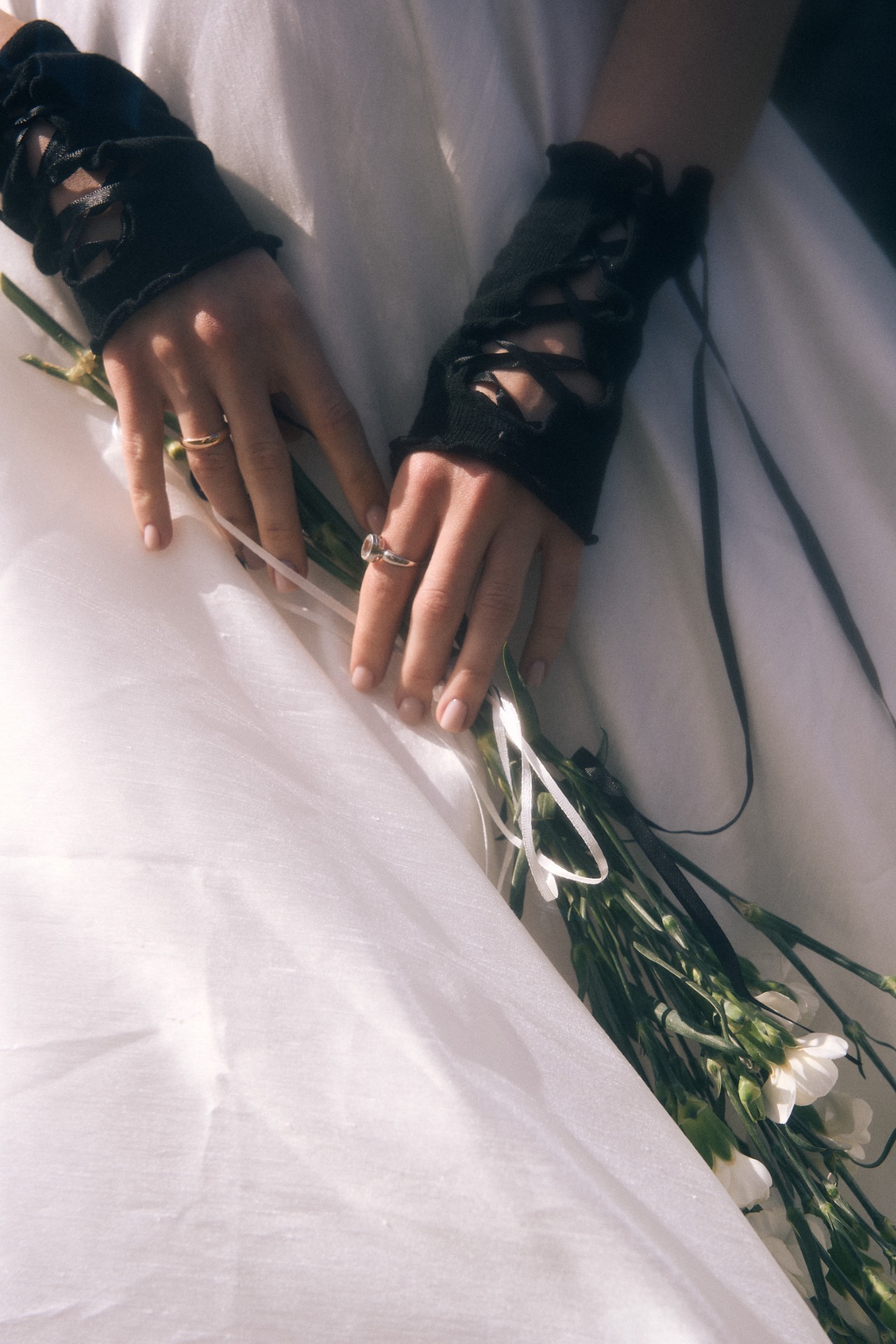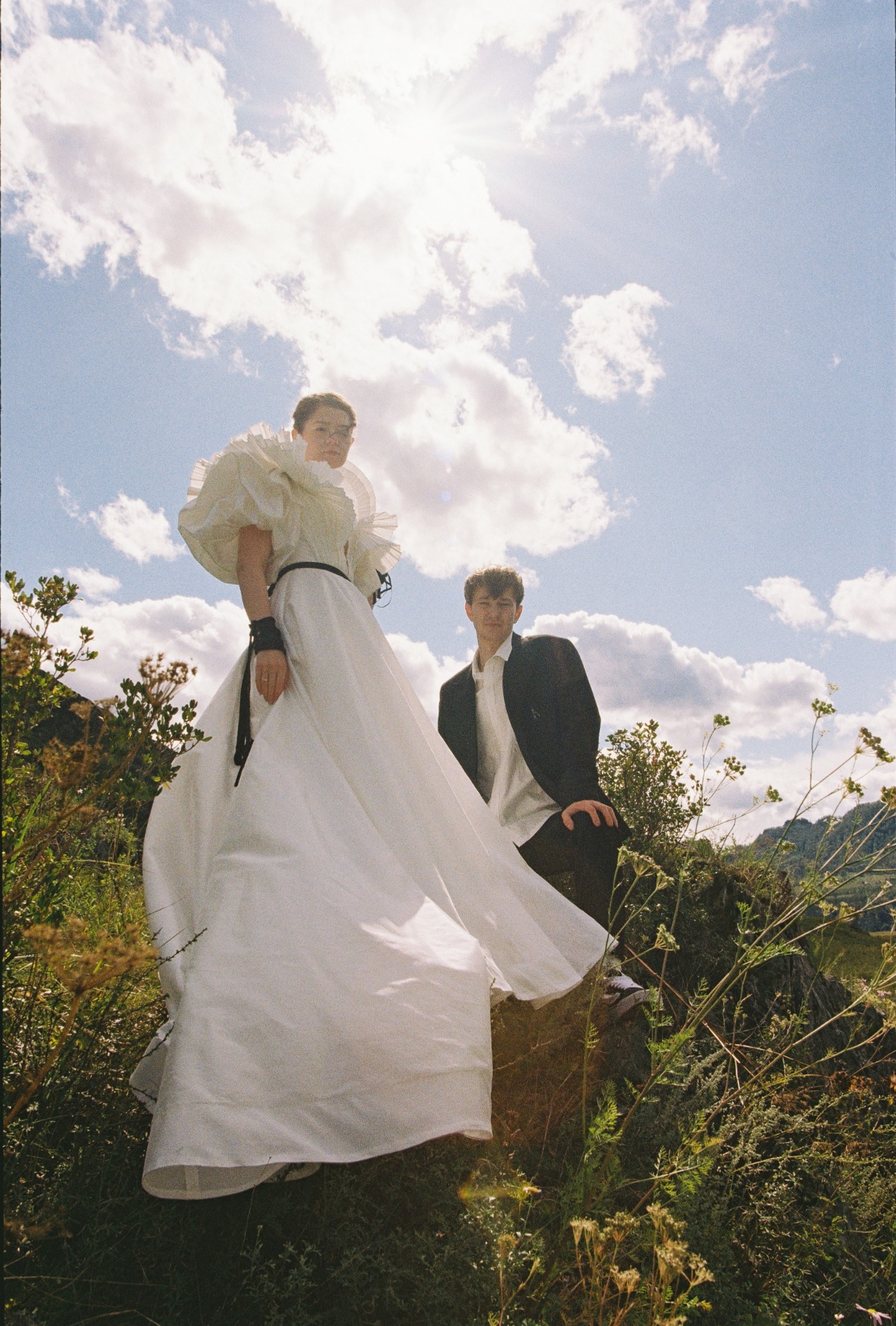 Серёжа выбрал чёрный костюм свободного кроя, в котором ему было комфортно и спокойно. Вместо бутоньерки я приколола к его лацкану брошь-ласточку — символ верности и дома. Эта брошь когда-то принадлежала моей близкой подруге и вдруг, в день свадьбы, оказалась у нас. А моё основное платье с его мягкими складками и разлетающимися слоями будто перекликалось с образом птичьих крыльев.
