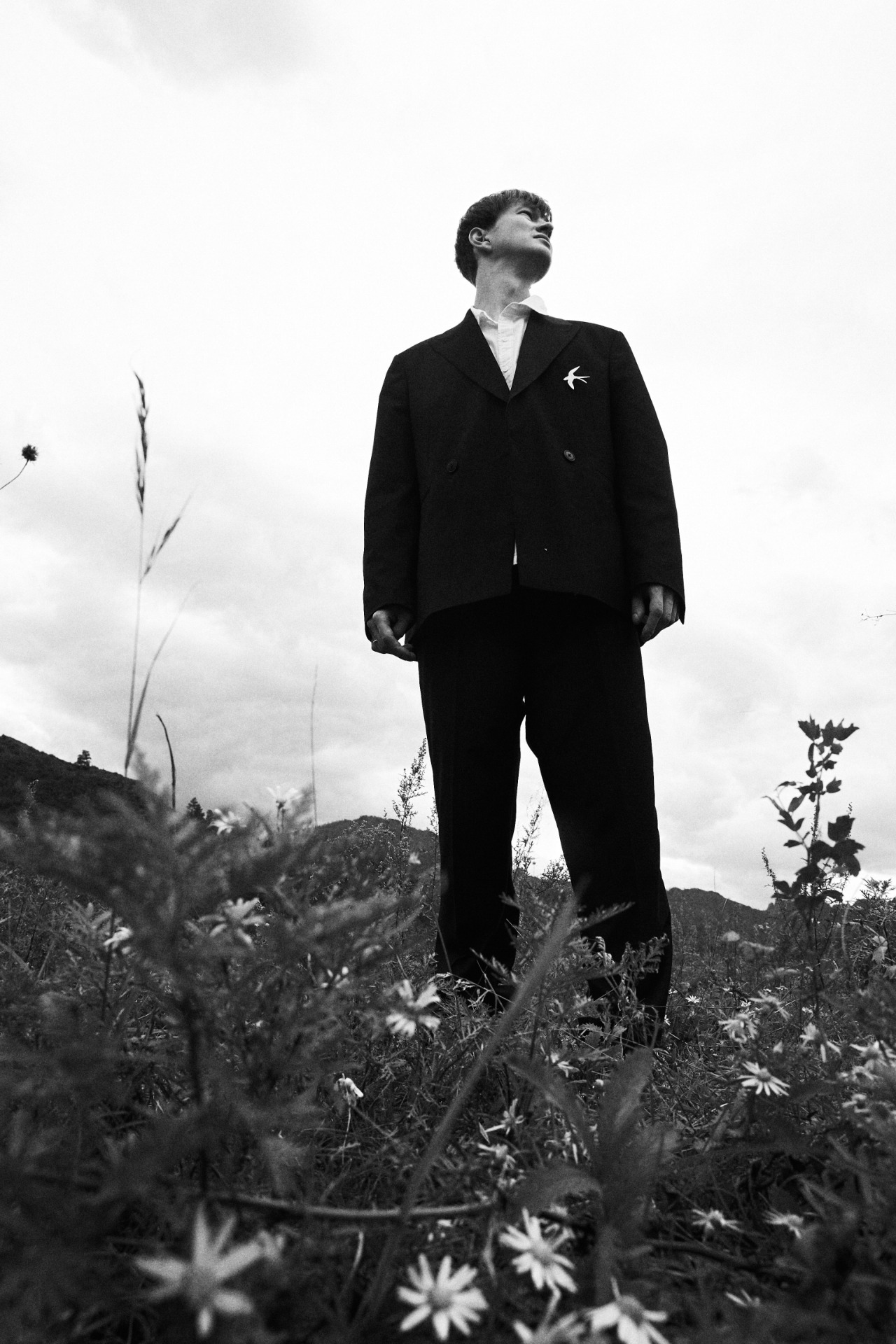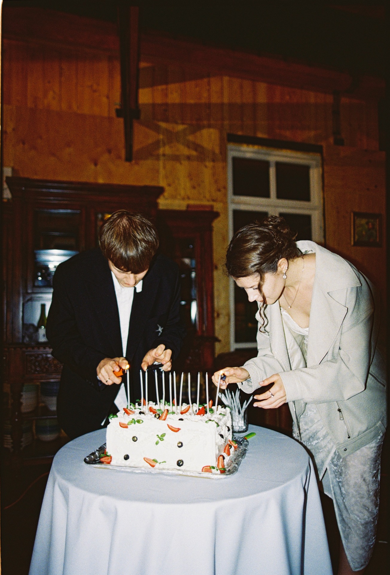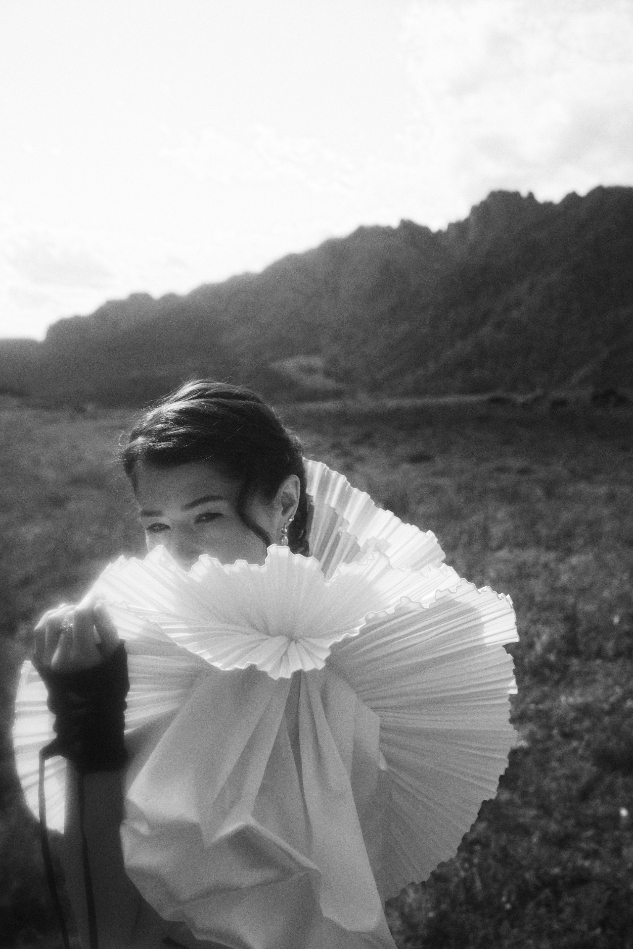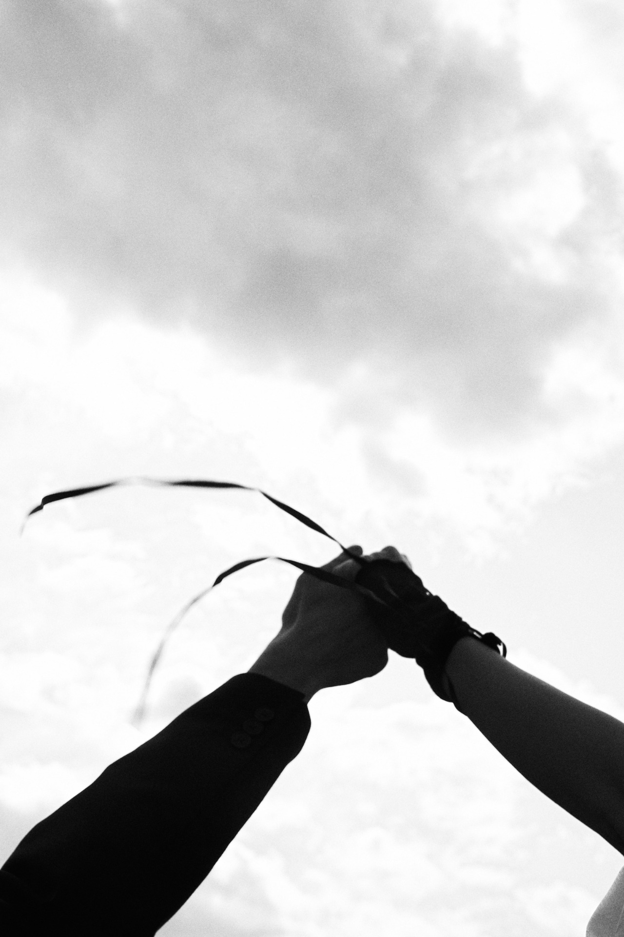 Серёжа выбрал чёрный костюм свободного кроя, в котором ему было комфортно и спокойно. Вместо бутоньерки я приколола к его лацкану брошь-ласточку — символ верности и дома. Эта брошь когда-то принадлежала моей близкой подруге и вдруг, в день свадьбы, оказалась у нас. А моё основное платье с его мягкими складками и разлетающимися слоями будто перекликалось с образом птичьих крыльев.