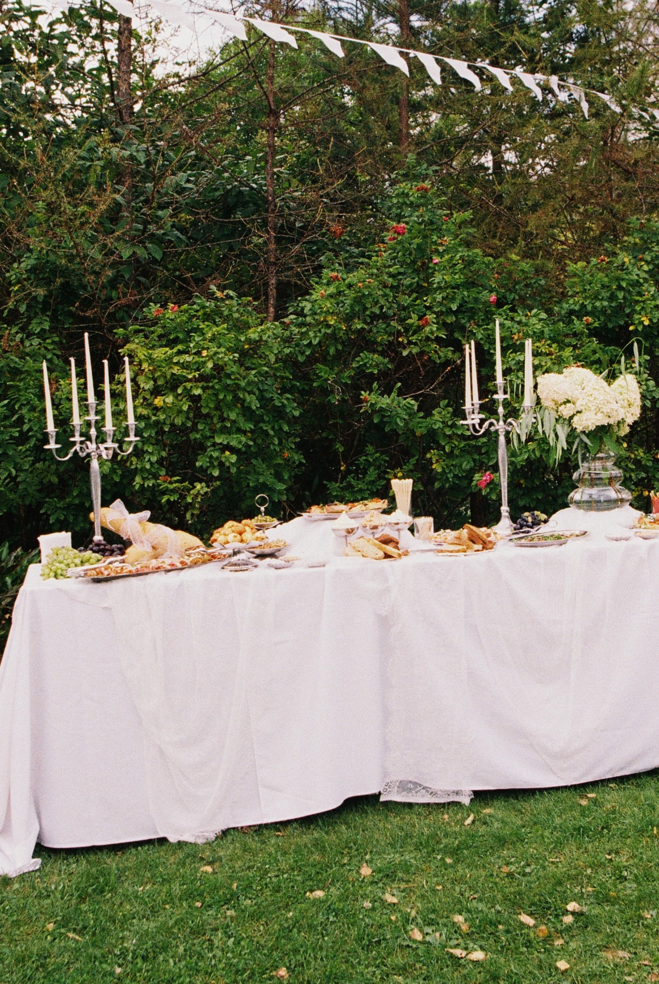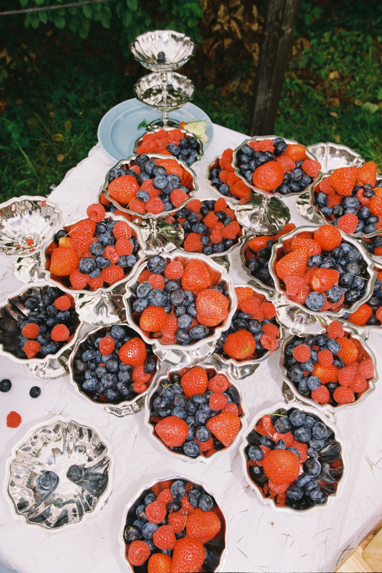 В декоре мы выбрали элегантную простоту, чтобы не спорить с красотой места. Церемония проходила под арками из живой зелени, в окружении полевых цветов, собранных утром в саду. Ничего лишнего — только свечи в старинных канделябрах, белые флажки, горка креманок с ягодами и запах свежей травы.