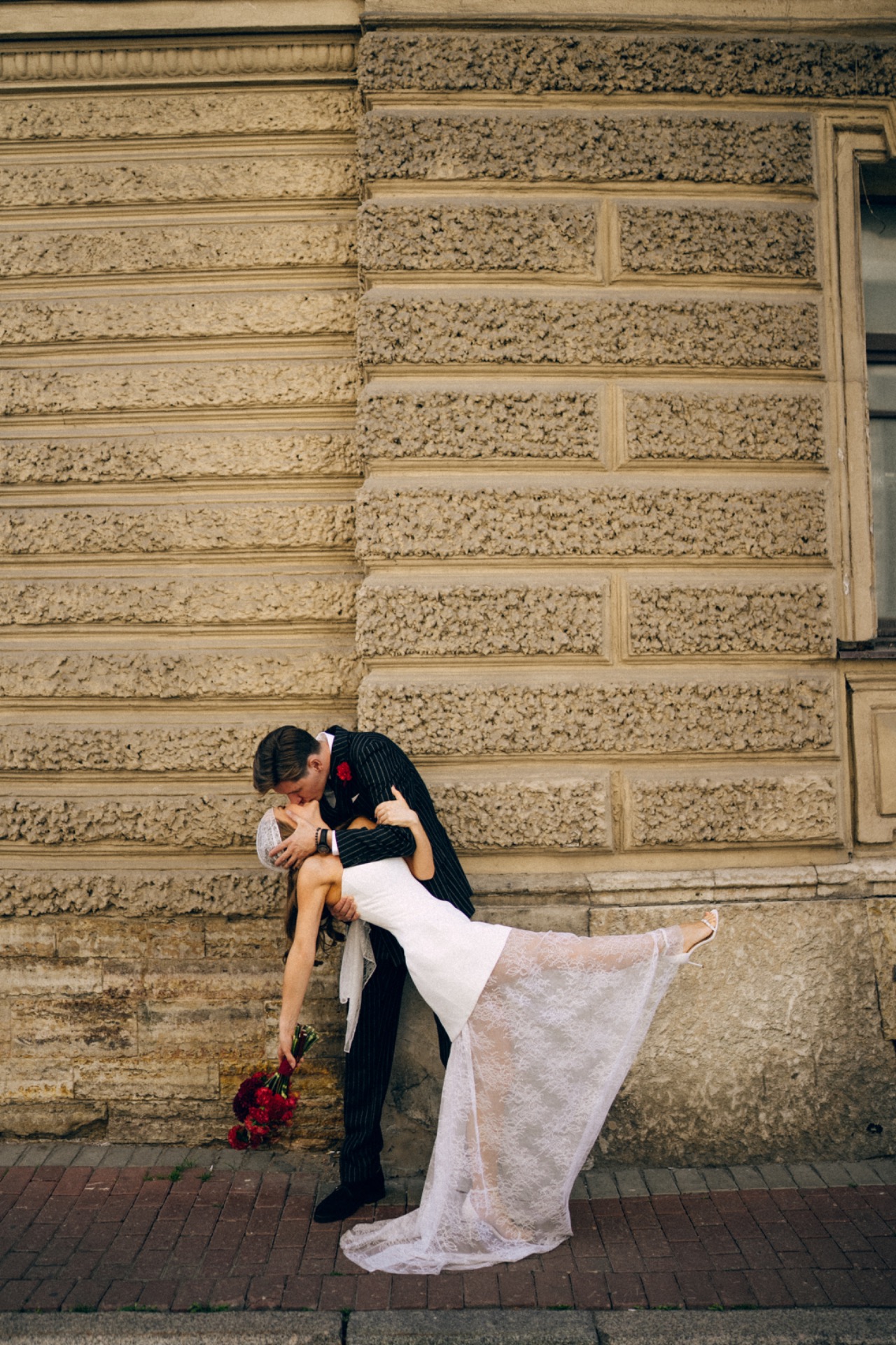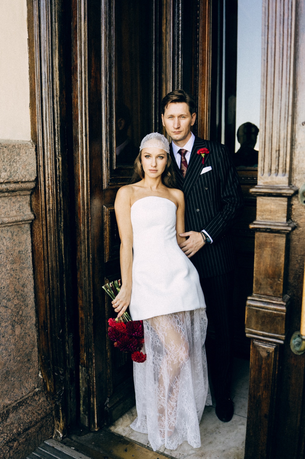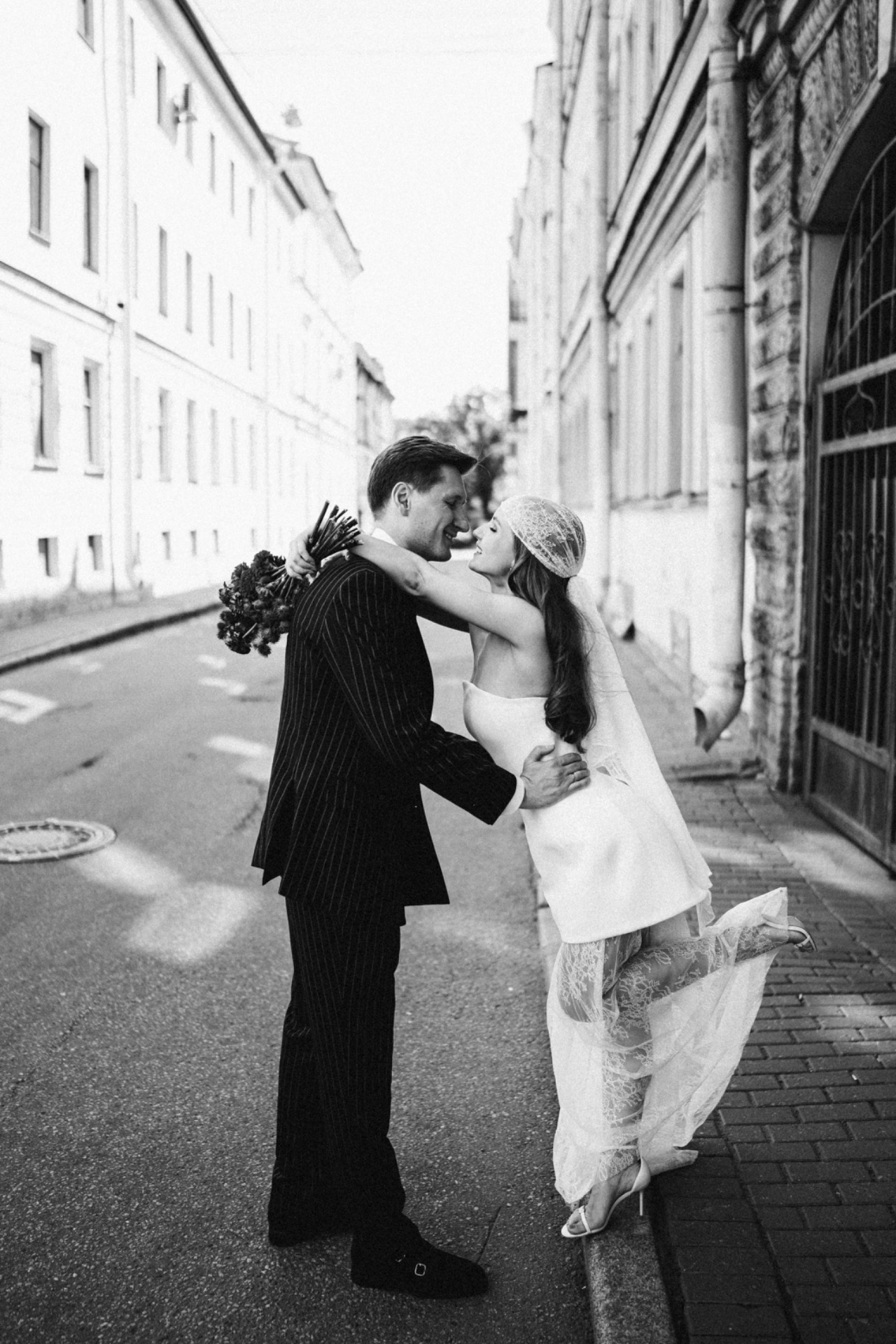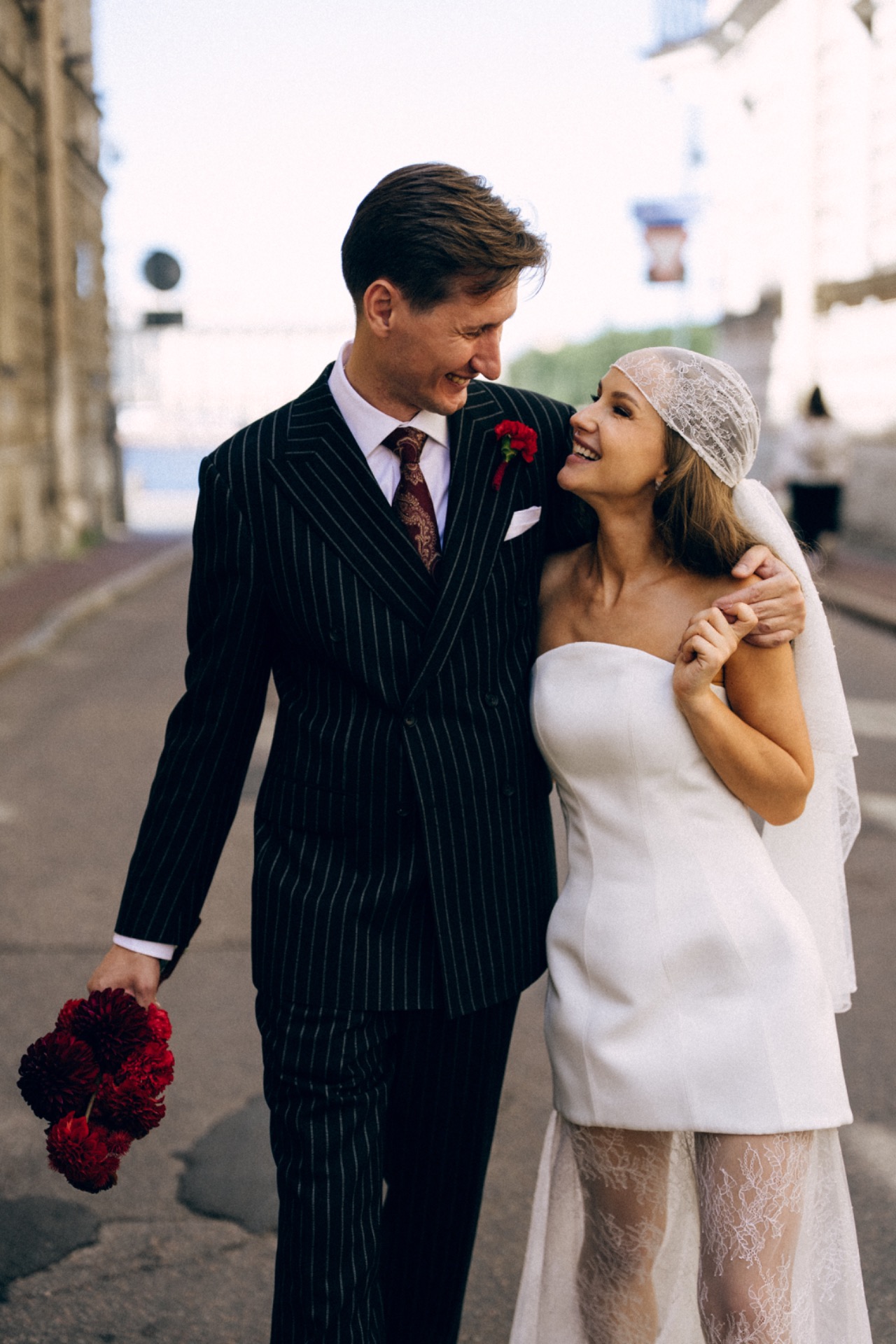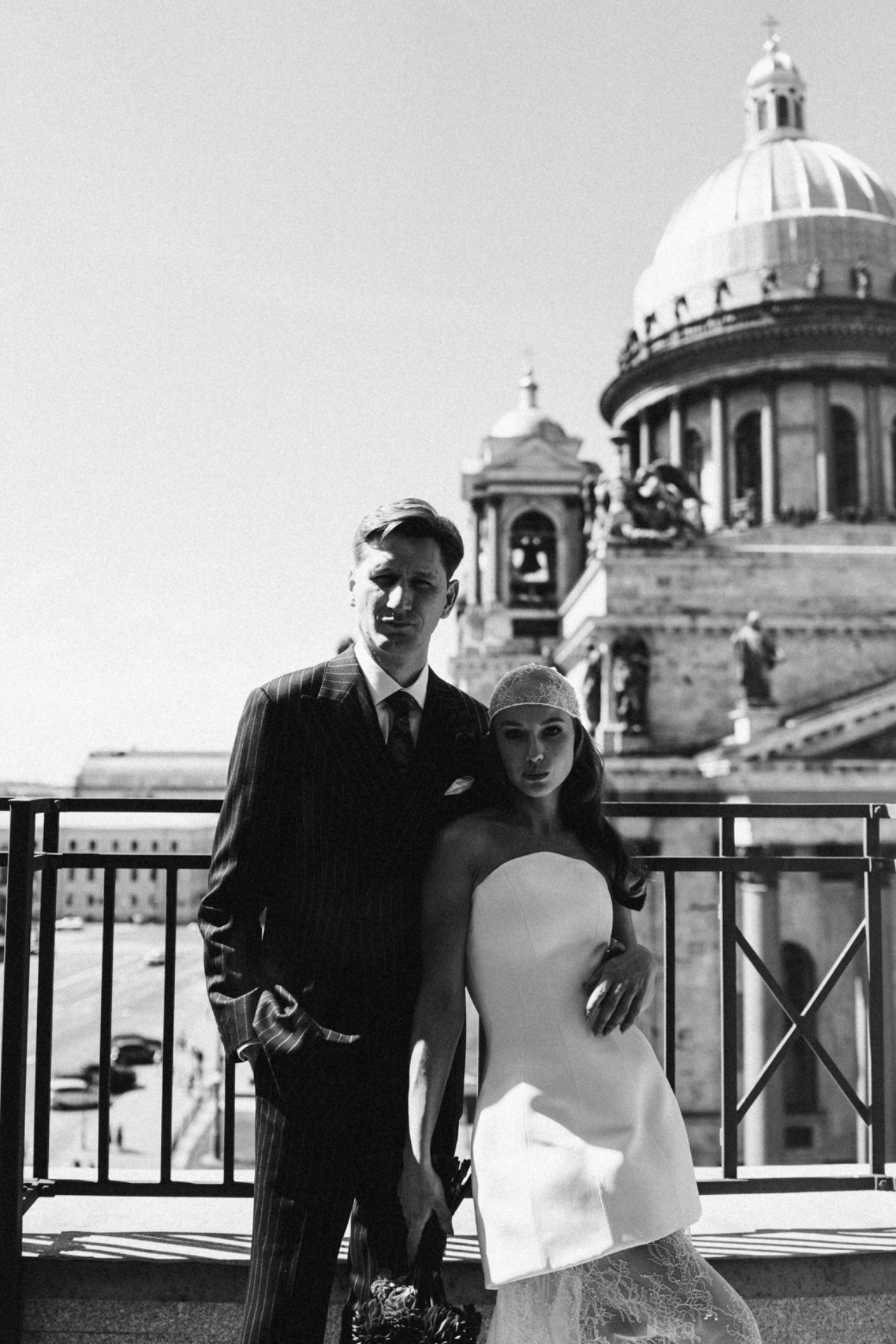 День свадьбы пролетел, думаю, как и у всех пар, за мгновение. У нас были неспешные сборы в отеле с потрясающим видом на Исаакиевский собор, а сама регистрация состоялась в загсе на Английской набережной, после которой гостей повезли в ресторан. А нас с Владимиром украл фотограф на небольшую фотосессию с неочевидным урбанистическим вайбом у ближайшего реконструируемого здания.