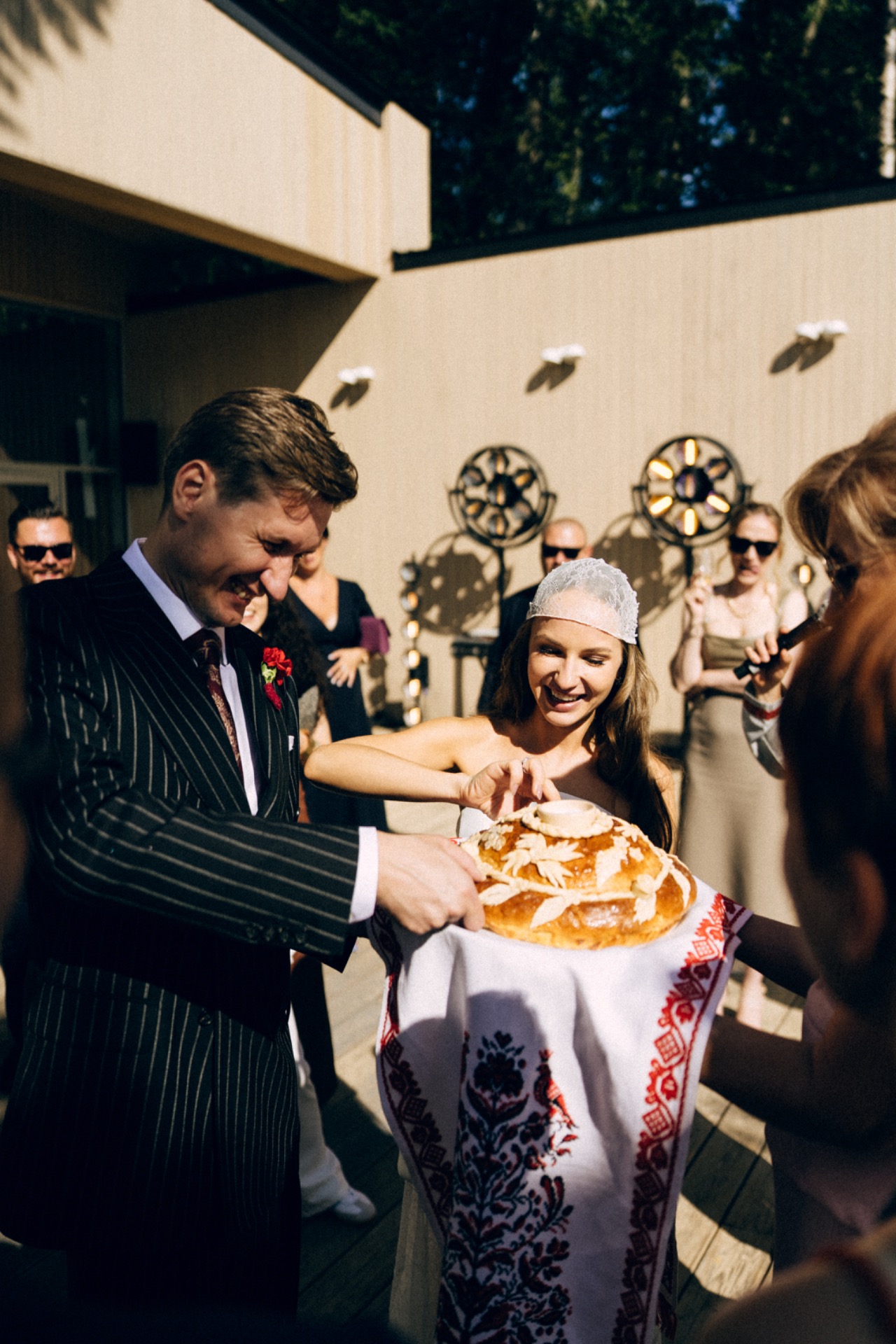 Праздничная вечеринка открылась выносом каравая на рушнике, который вышила бабушка Владимира специально ему на свадьбу задолго до нашего знакомства.