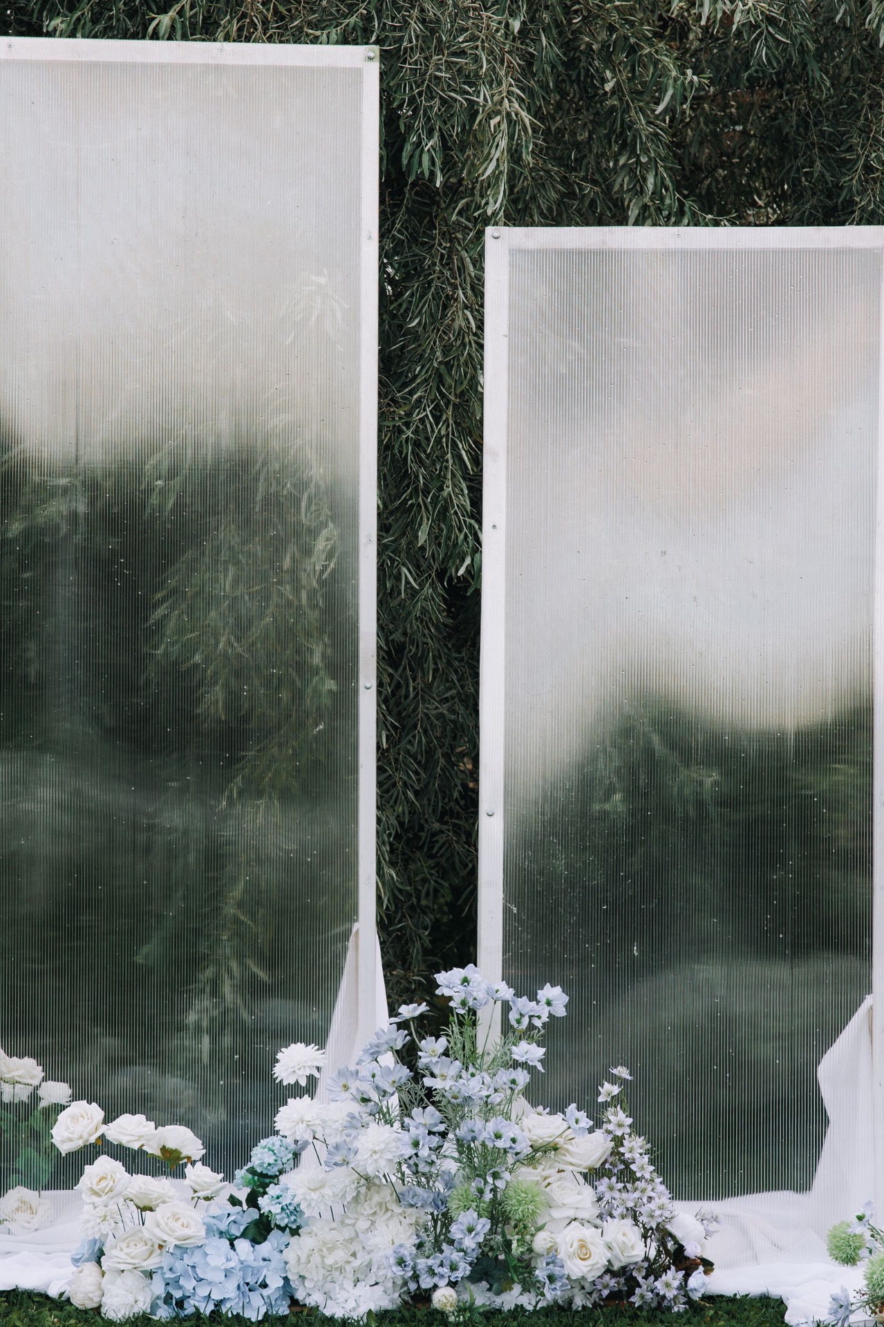 Команда организаторов предложила концепцию, вдохновлённую историей предложения. От неё мы и отталкивались при выборе оформления: белая палитра с лёгкими голубыми акцентами и арка для церемонии в форме глыб льда.