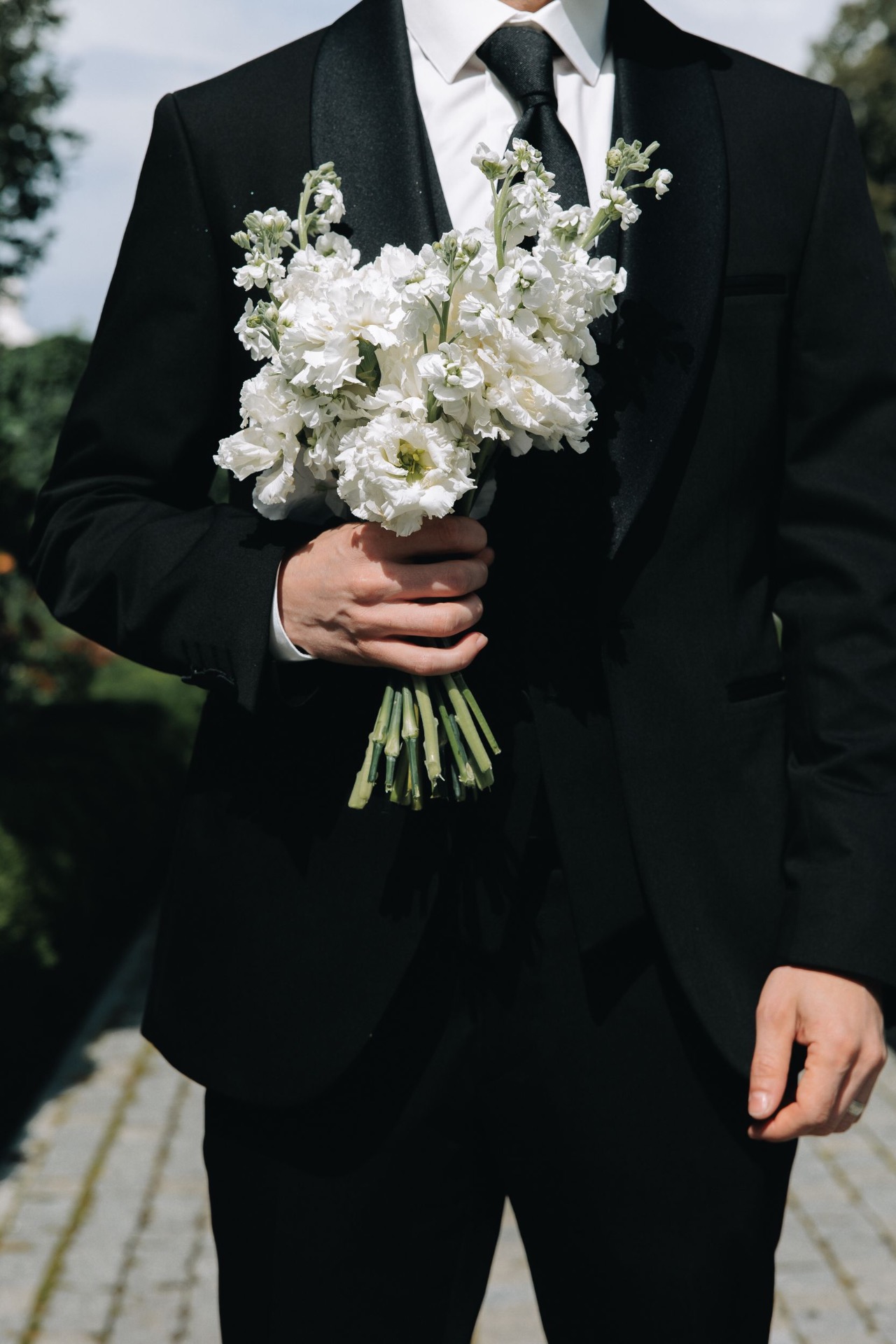Сергей выбрал для себя чёрный классический костюм. Его образ получился элегантным и строгим.