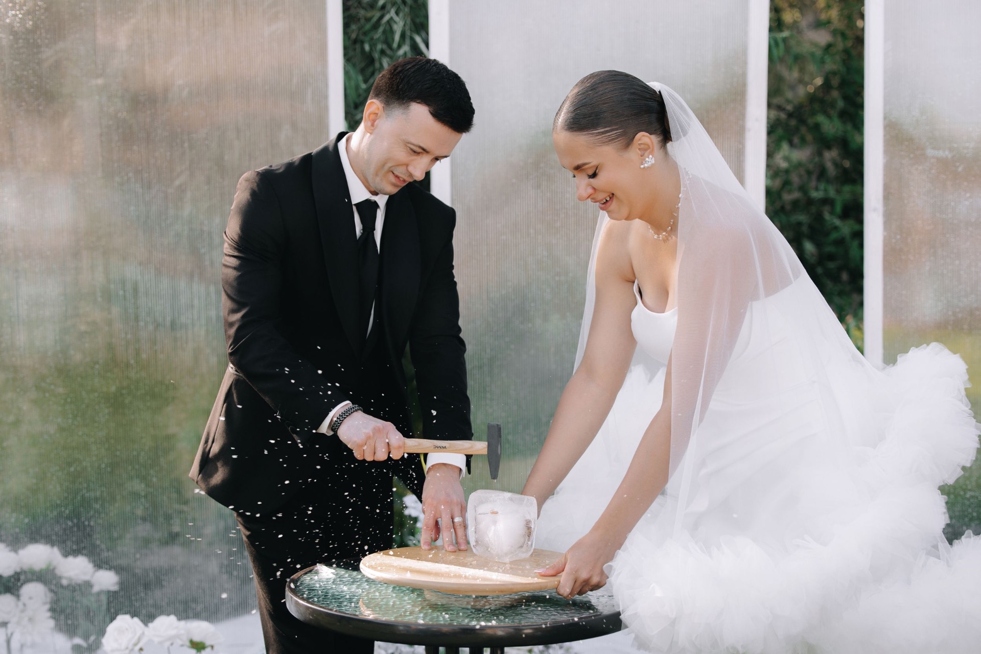 Для обмена кольцами нас ждало небольшое испытание. Кольца были заморожены во льду, и нам нужно было его разбить. Это символизировало наше намерение: лёд твёрдый, как решимость вступить в брак, но при этом хрупкий, как первые мгновения любви.