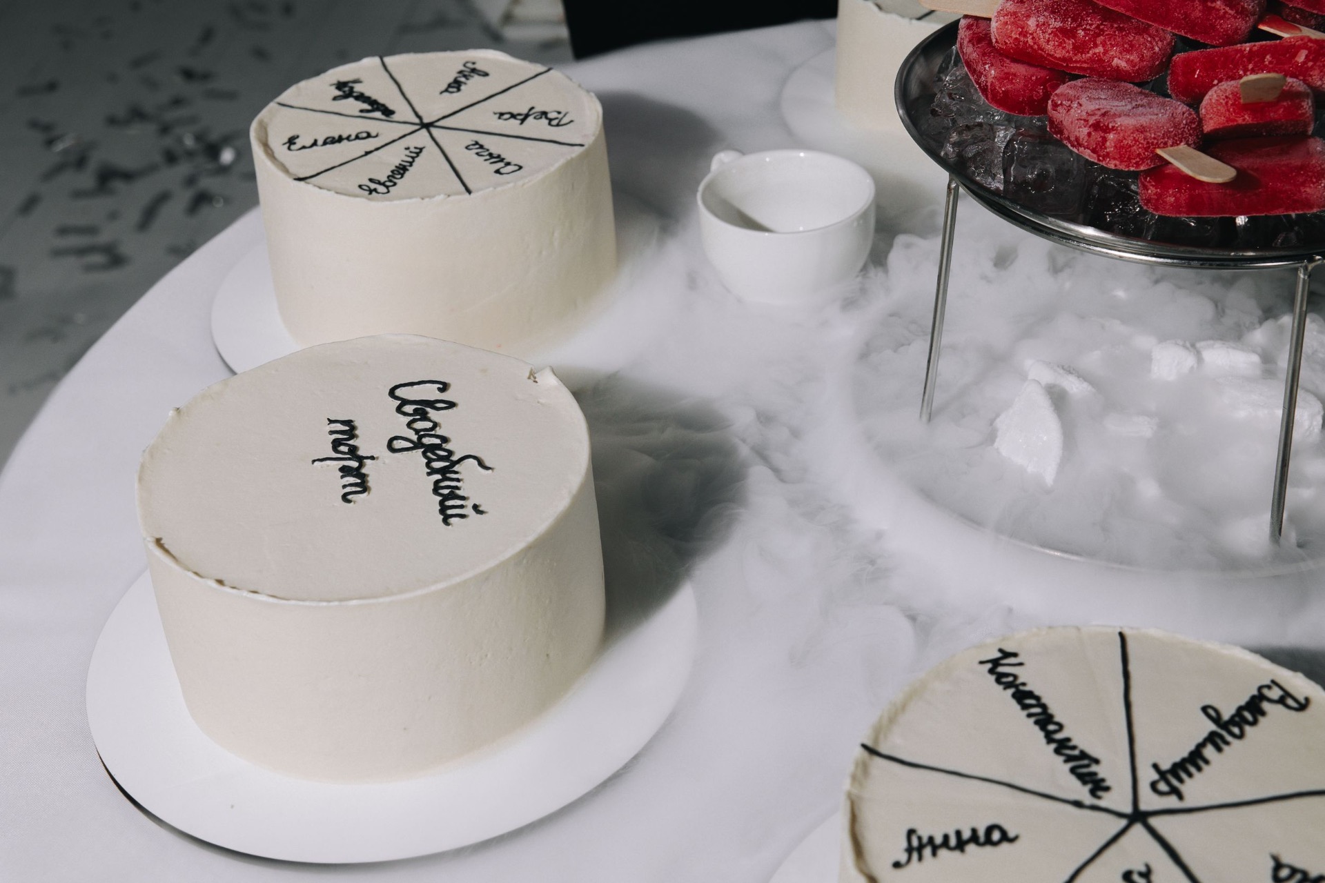 В рамках водной концепции мы отказались от классического торта. Для гостей подготовили десерты на каждом столе, а главным угощением стало мороженое: фруктовый лёд, поданный с сухим льдом. Эта подача стала эффектной и запоминающейся финальной точкой вечера.