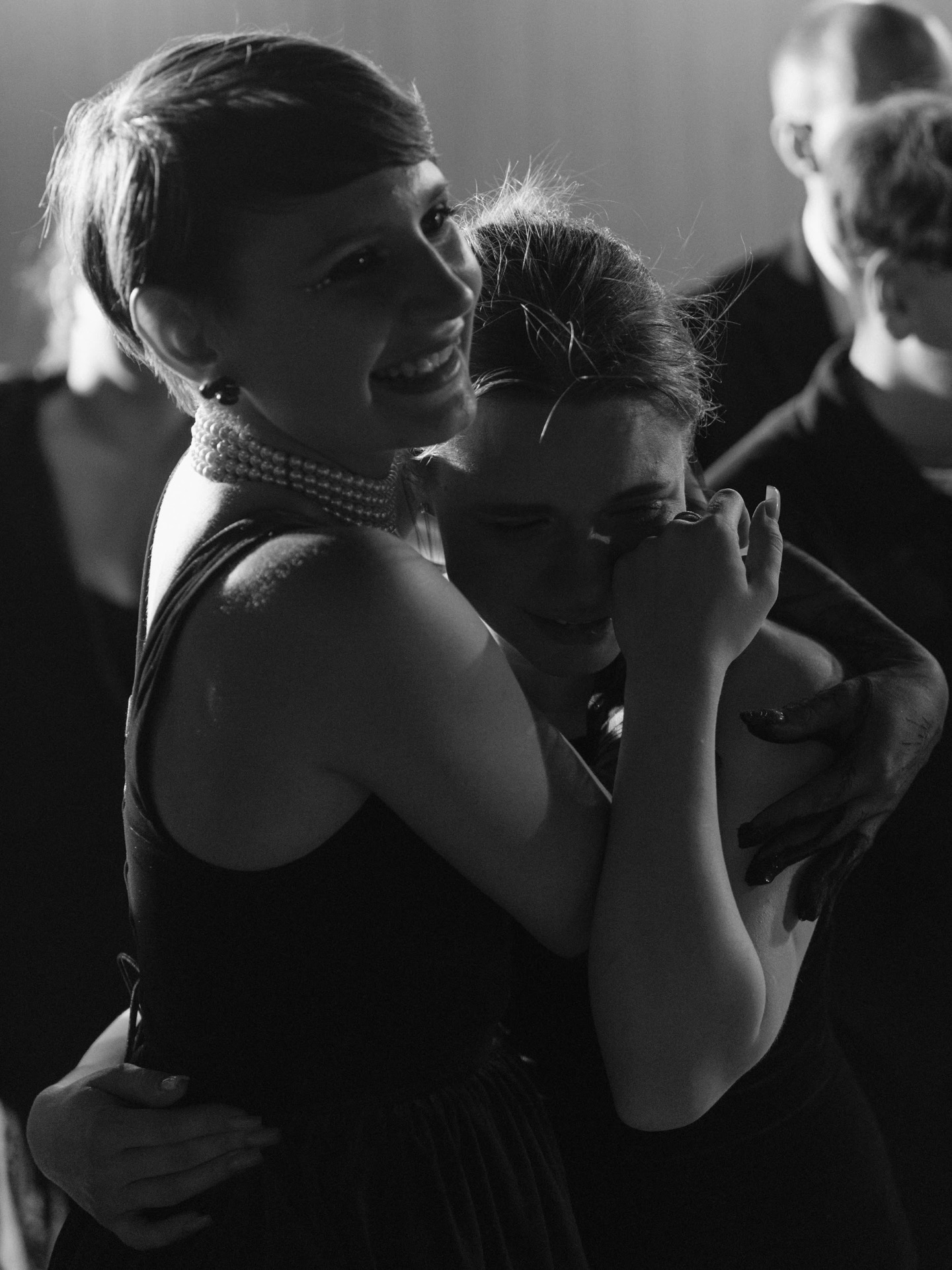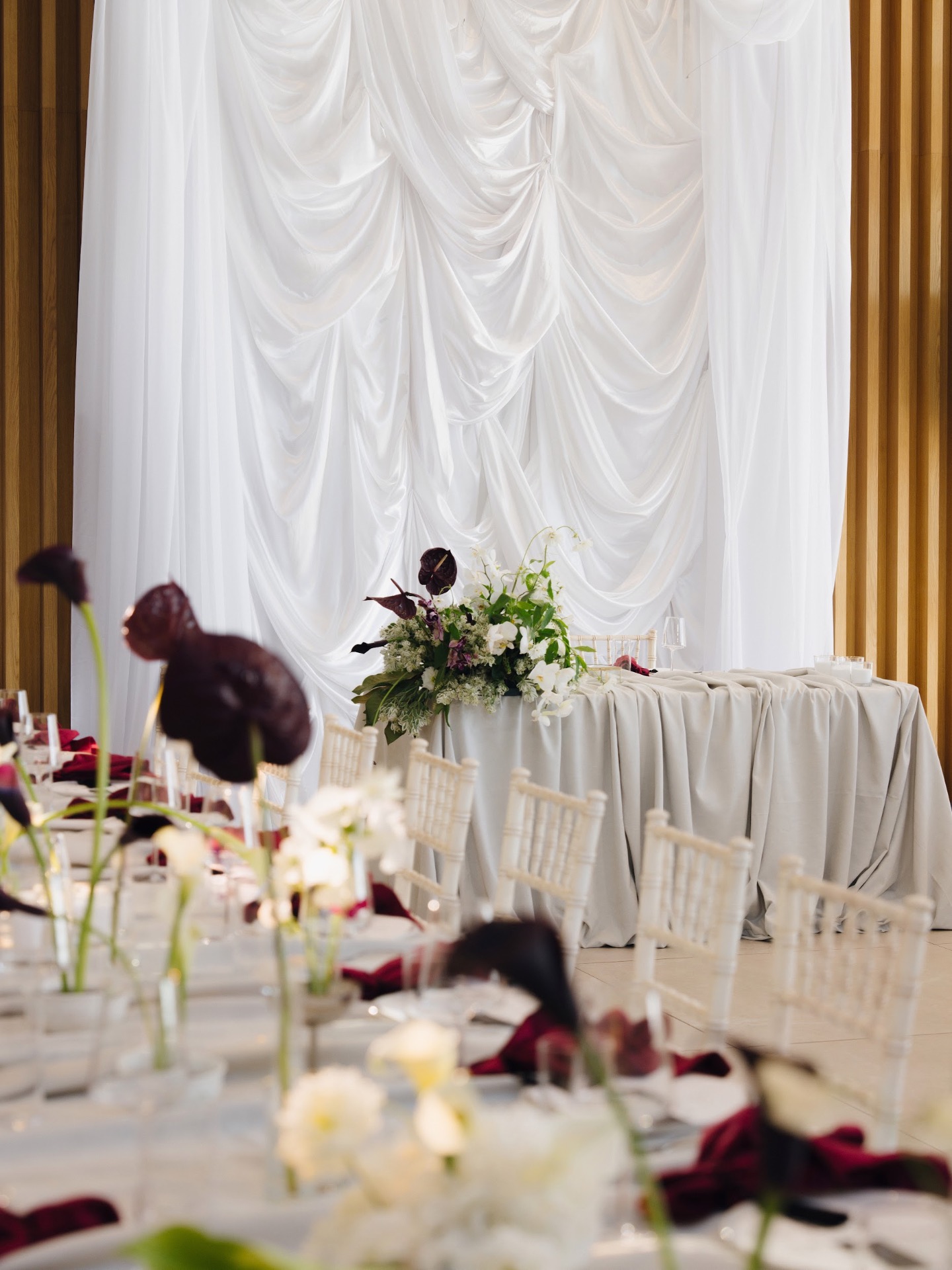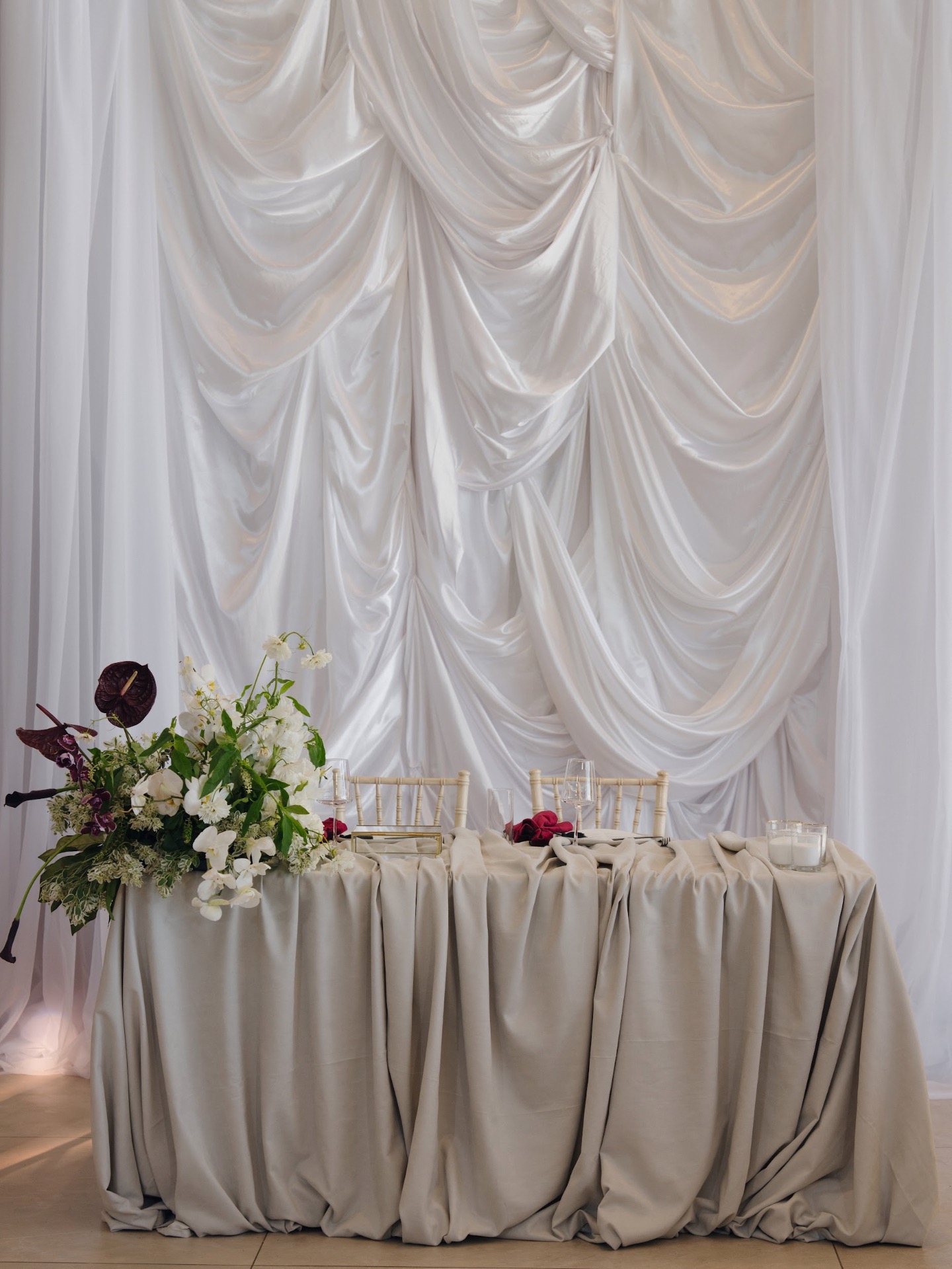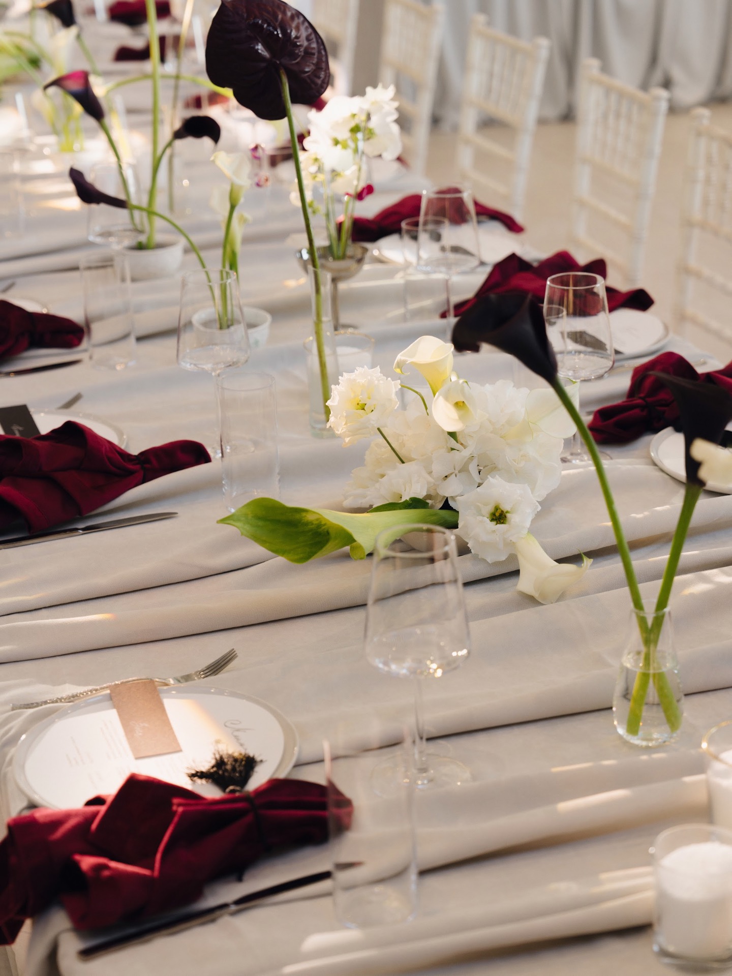 При выборе палитры мы отталкивались от немного дерзкой, «вампирской» эстетики. В итоге, остановились на сочетании: бордо, глубокий серый, серебро, светлый беж и чёрный. Обсуждение декора стало одним из самых важных и любимых этапов. Мы отдали предпочтение скатертям в пол, множеству свечей и живым цветам в оттенках свадебной палитры. В букете невесты мне хотелось видеть чёрные каллы и обязательно орхидею, ведь именно она стала символом начала наших отношений.