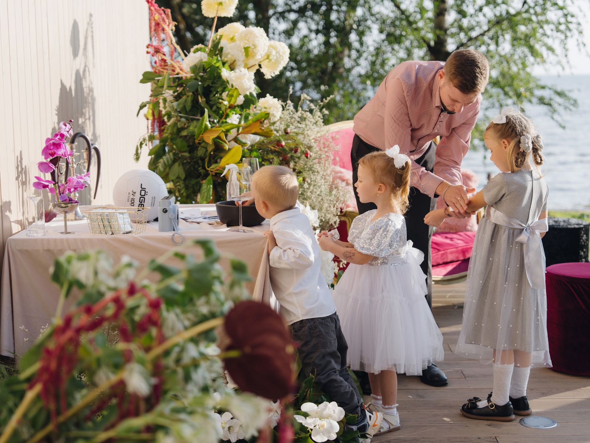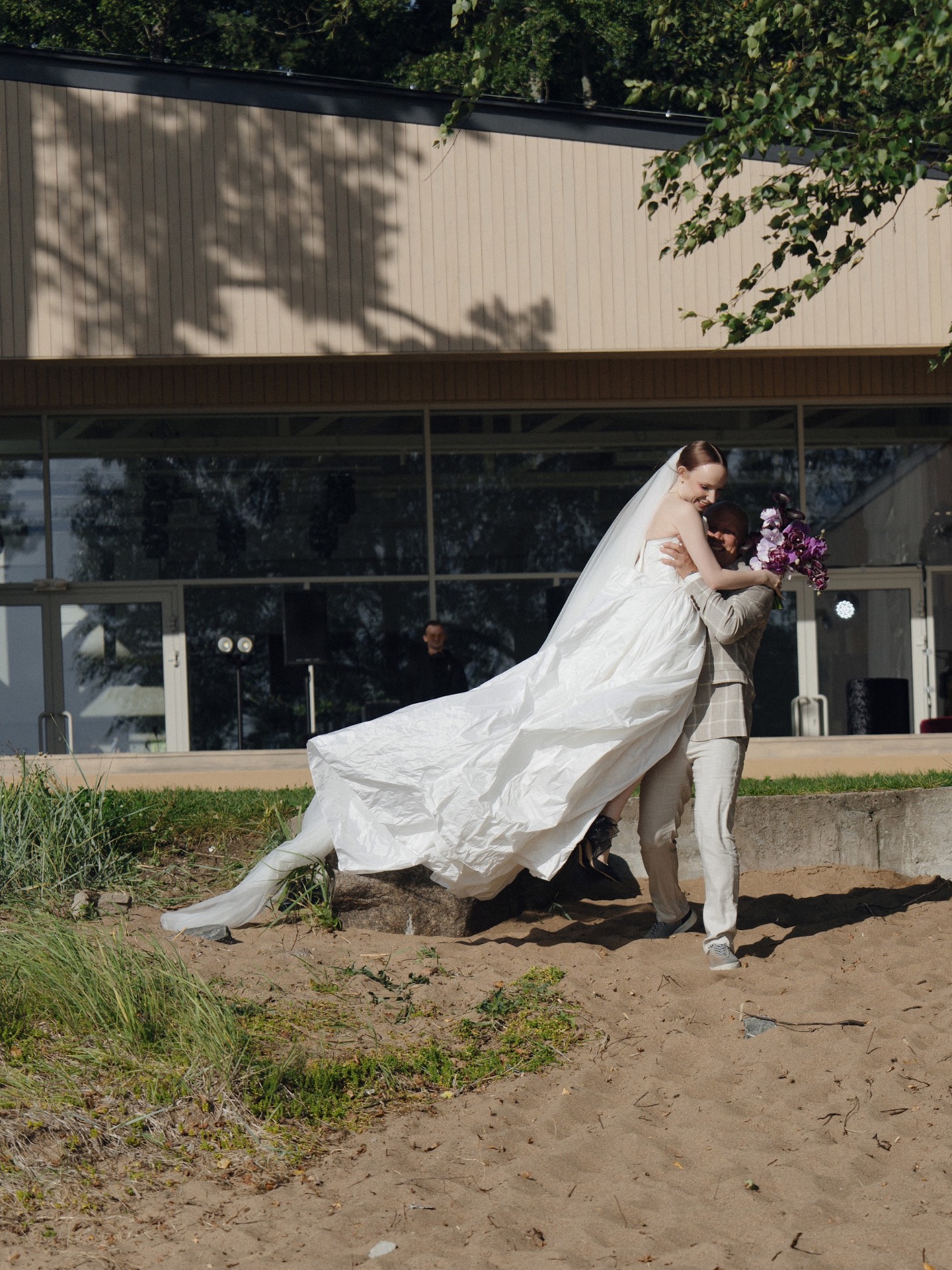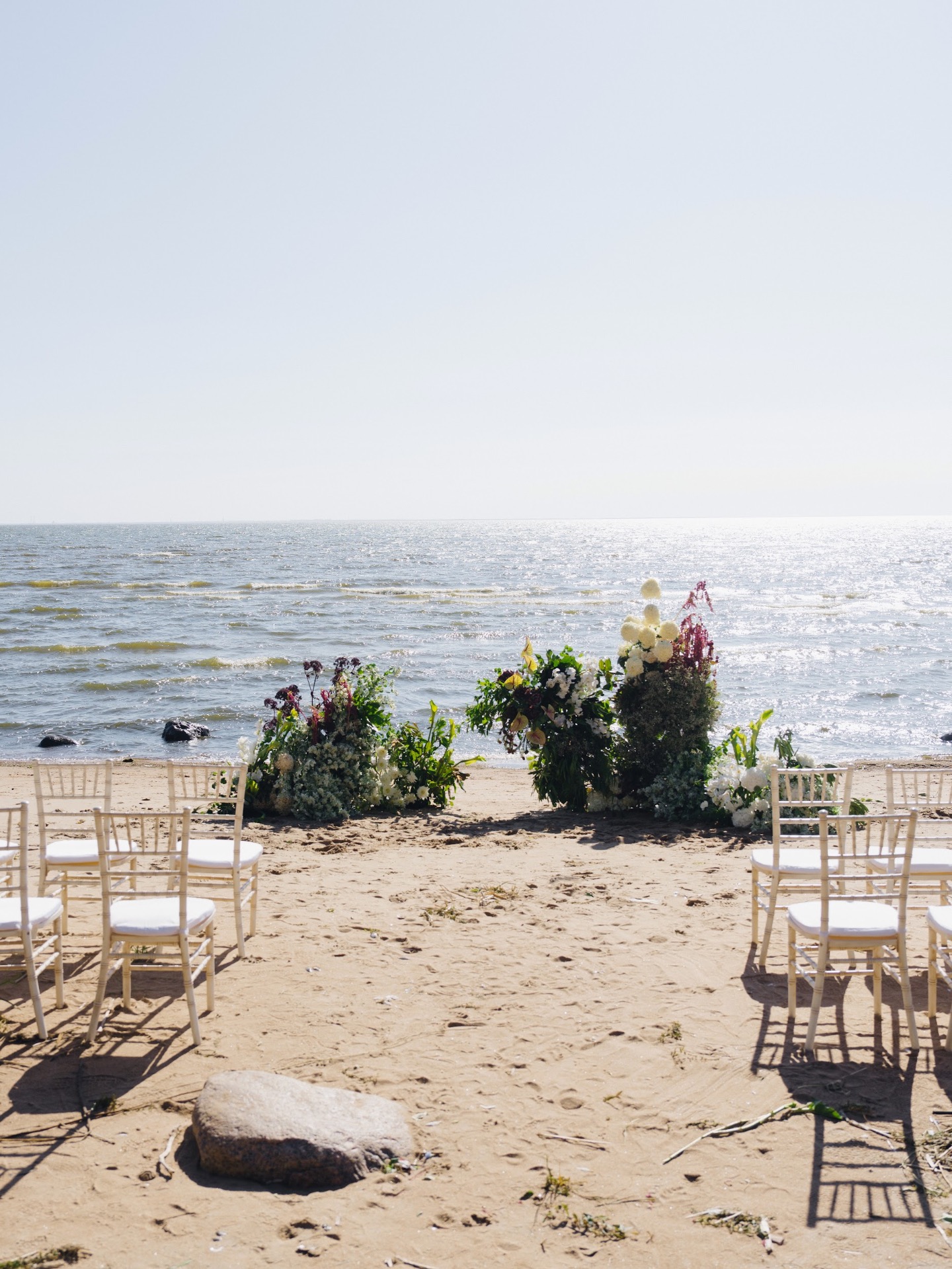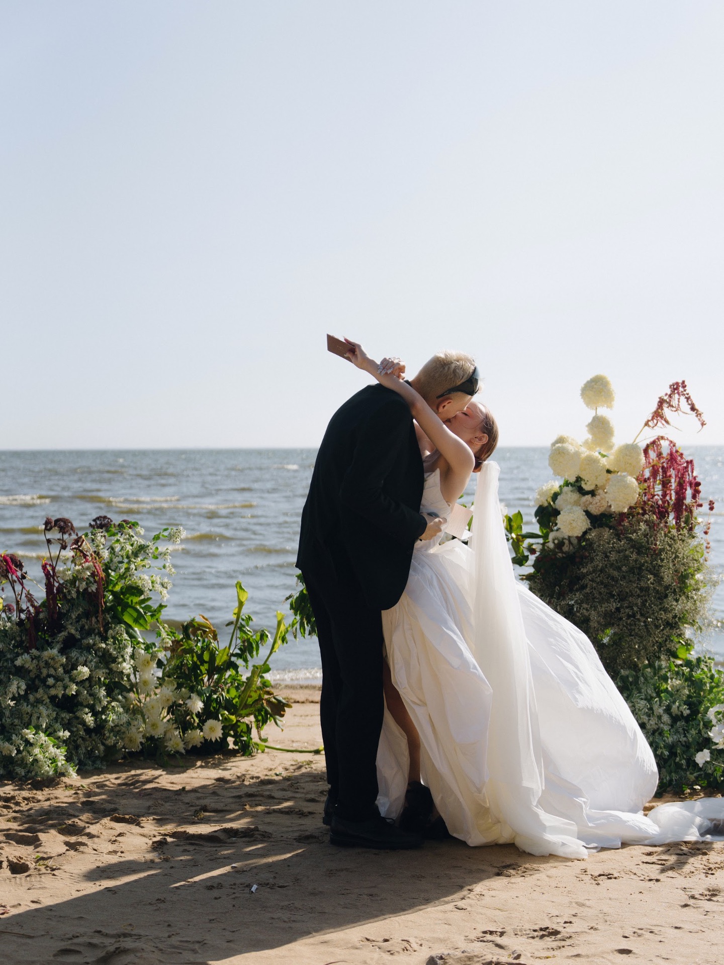 Церемонию мы представляли на фоне пляжа Финского залива, и выбранная нами локация позволила воплотить это в реальность. Единственная сложность заключалась в том, чтобы пройти по песку в туфлях на каблуках, но мой папа нашёл решение — он вынес меня на руках. Церемония получилась невероятно красивой. Особенно трогательным стал момент наших клятв. Мы сильно волновались, но, глядя друг другу в глаза, не колебались ни в одном слове.
