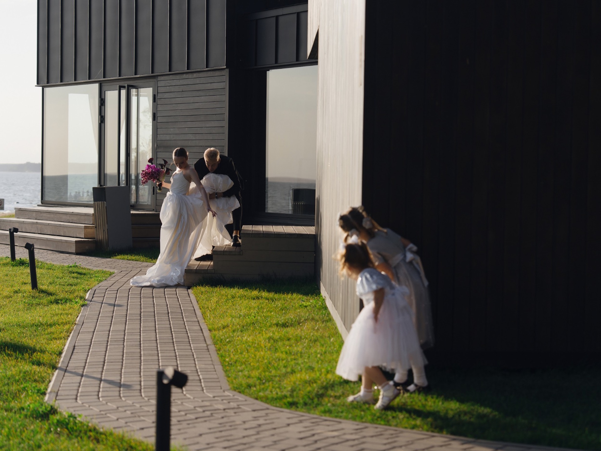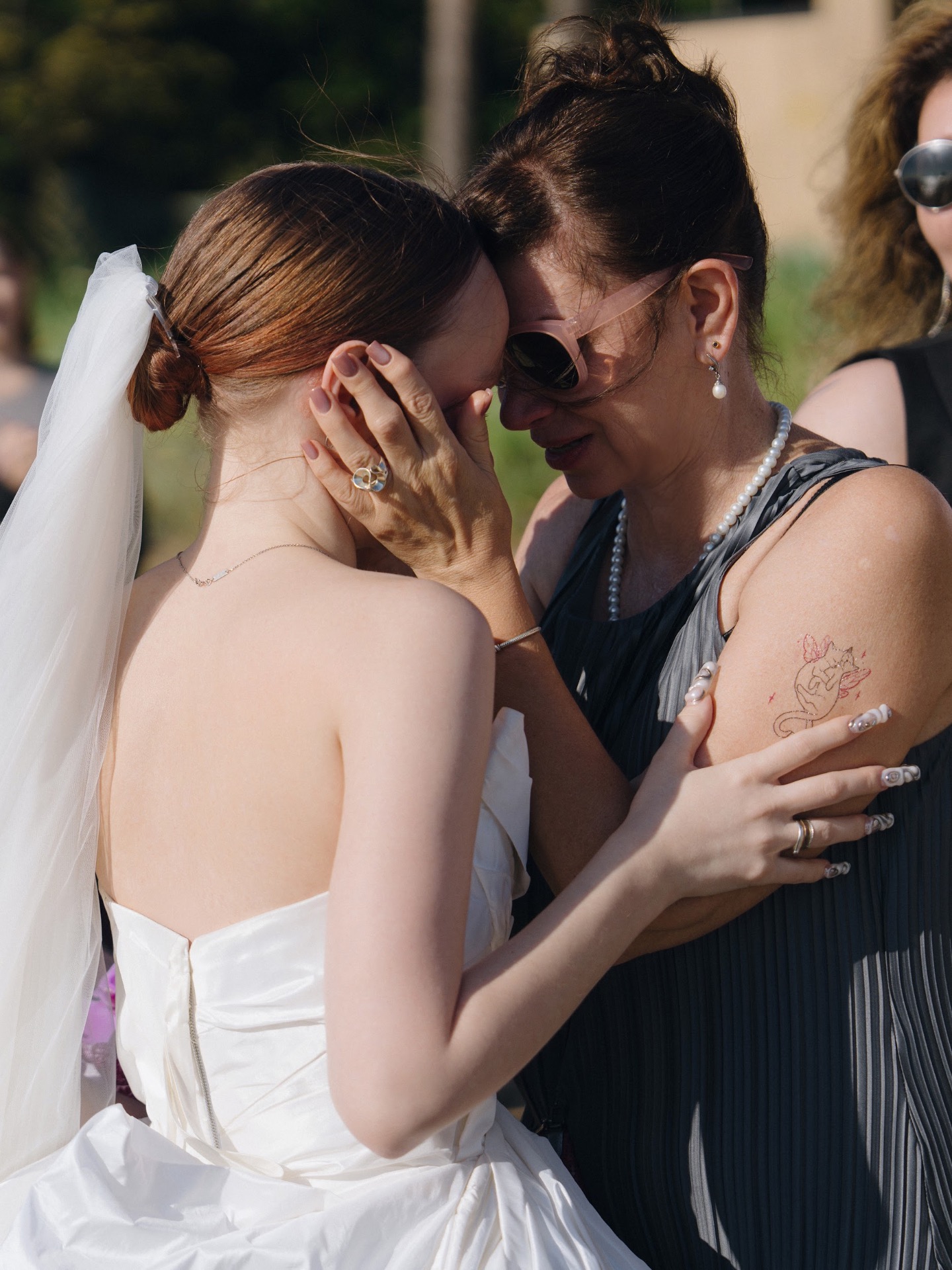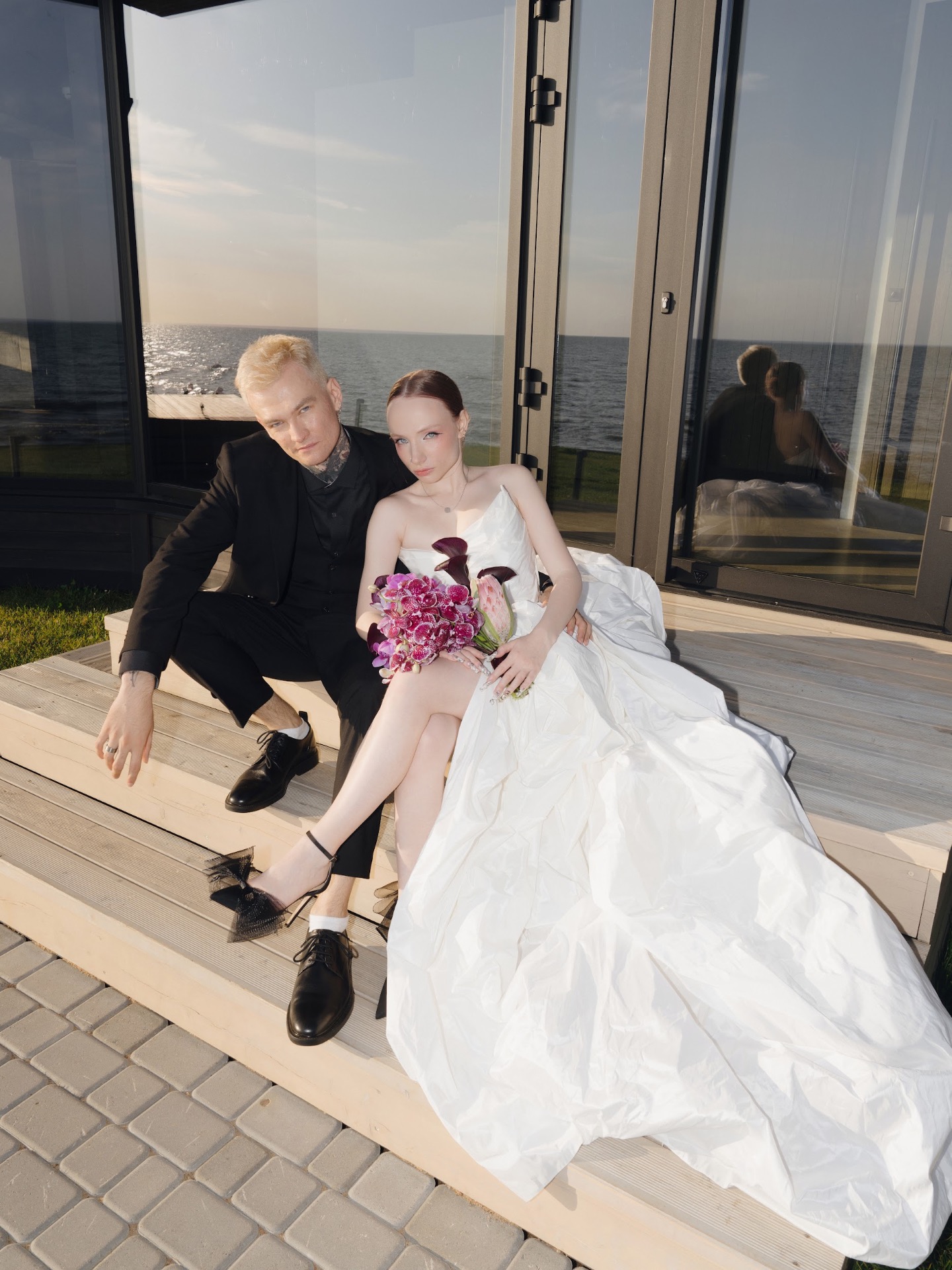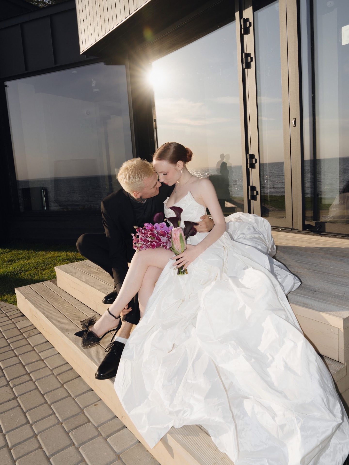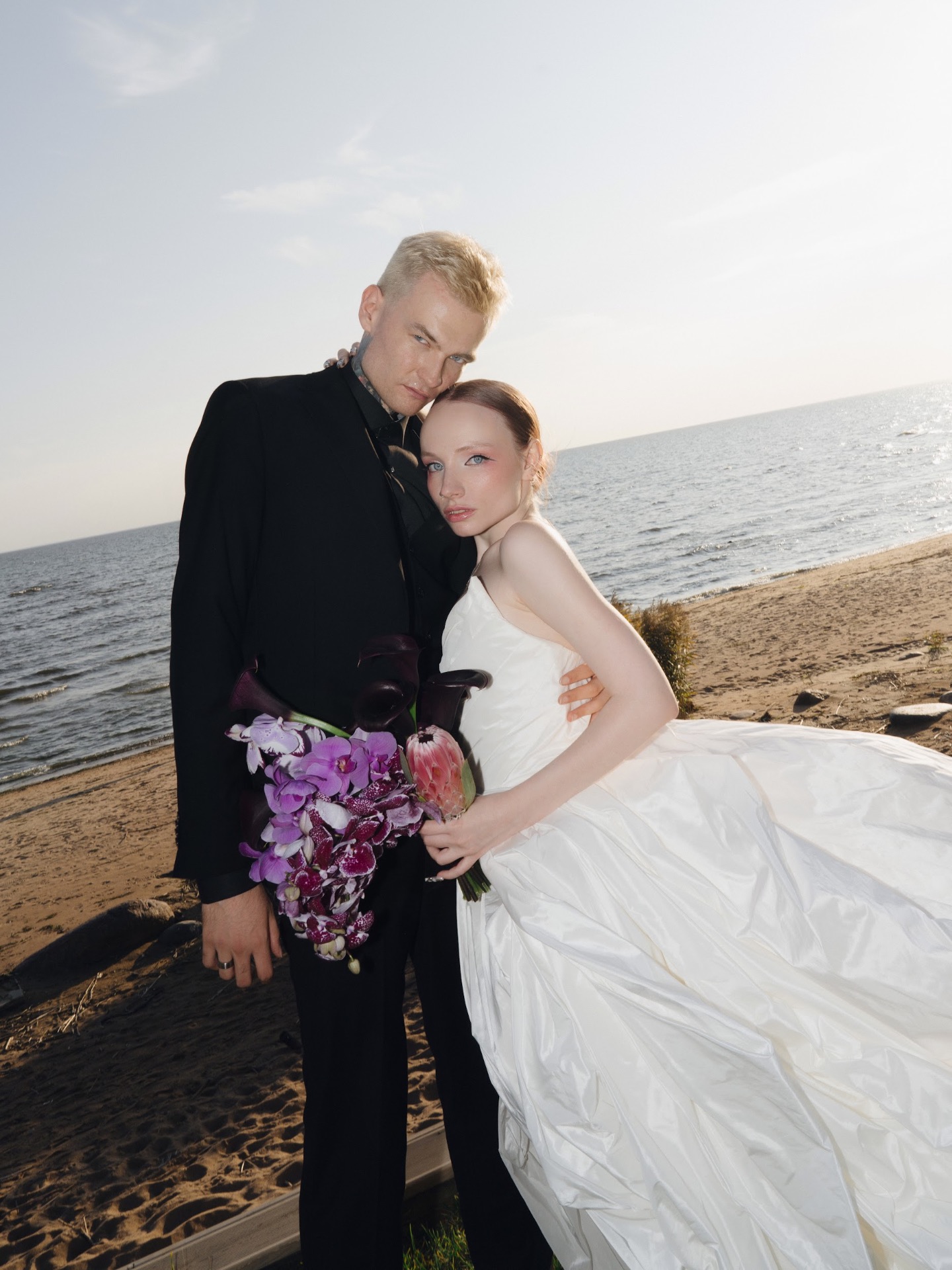 Церемонию мы представляли на фоне пляжа Финского залива, и выбранная нами локация позволила воплотить это в реальность. Единственная сложность заключалась в том, чтобы пройти по песку в туфлях на каблуках, но мой папа нашёл решение — он вынес меня на руках. Церемония получилась невероятно красивой. Особенно трогательным стал момент наших клятв. Мы сильно волновались, но, глядя друг другу в глаза, не колебались ни в одном слове.