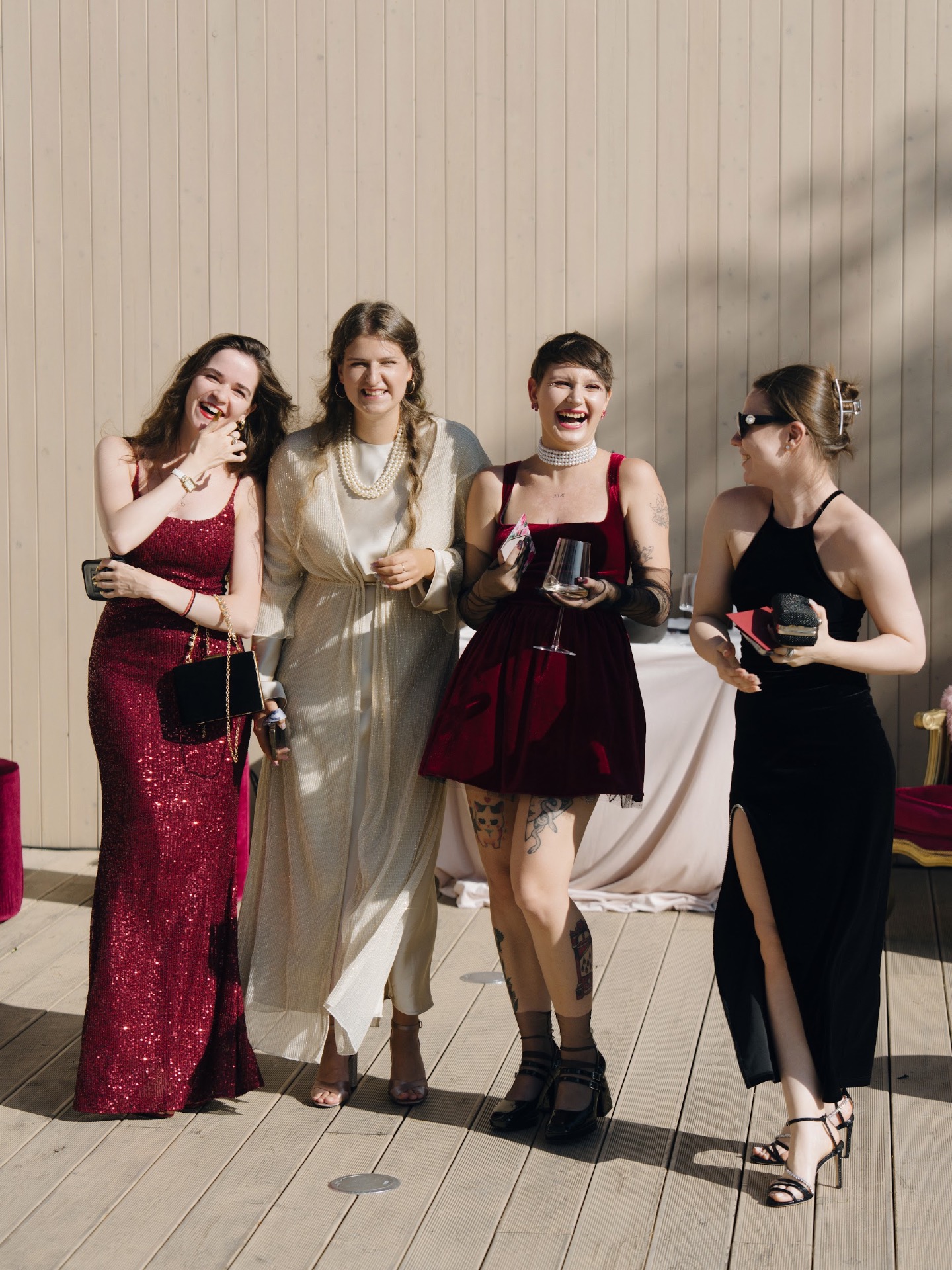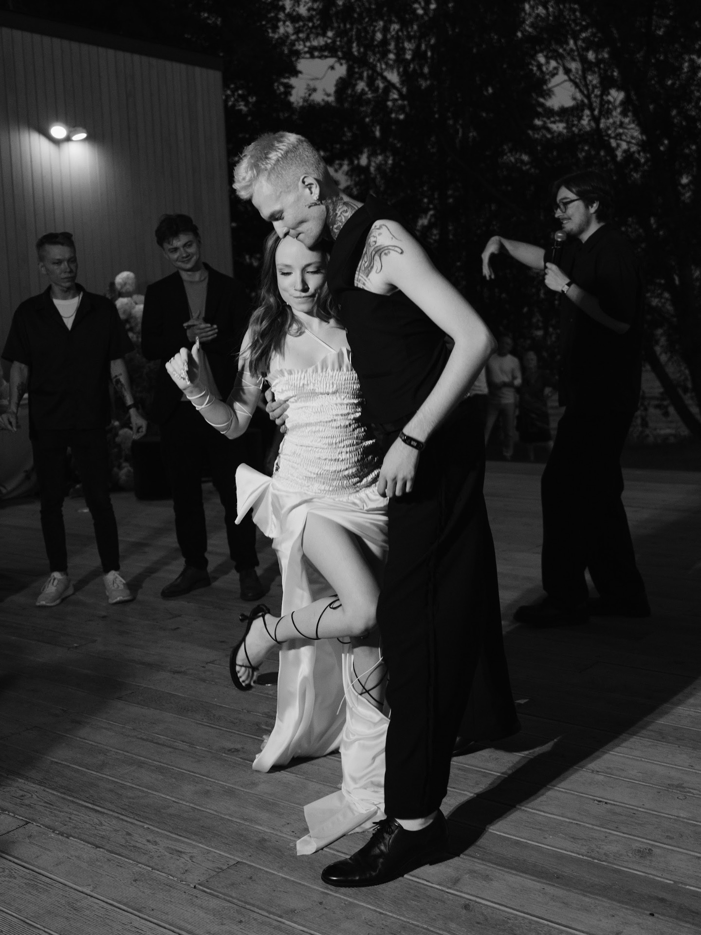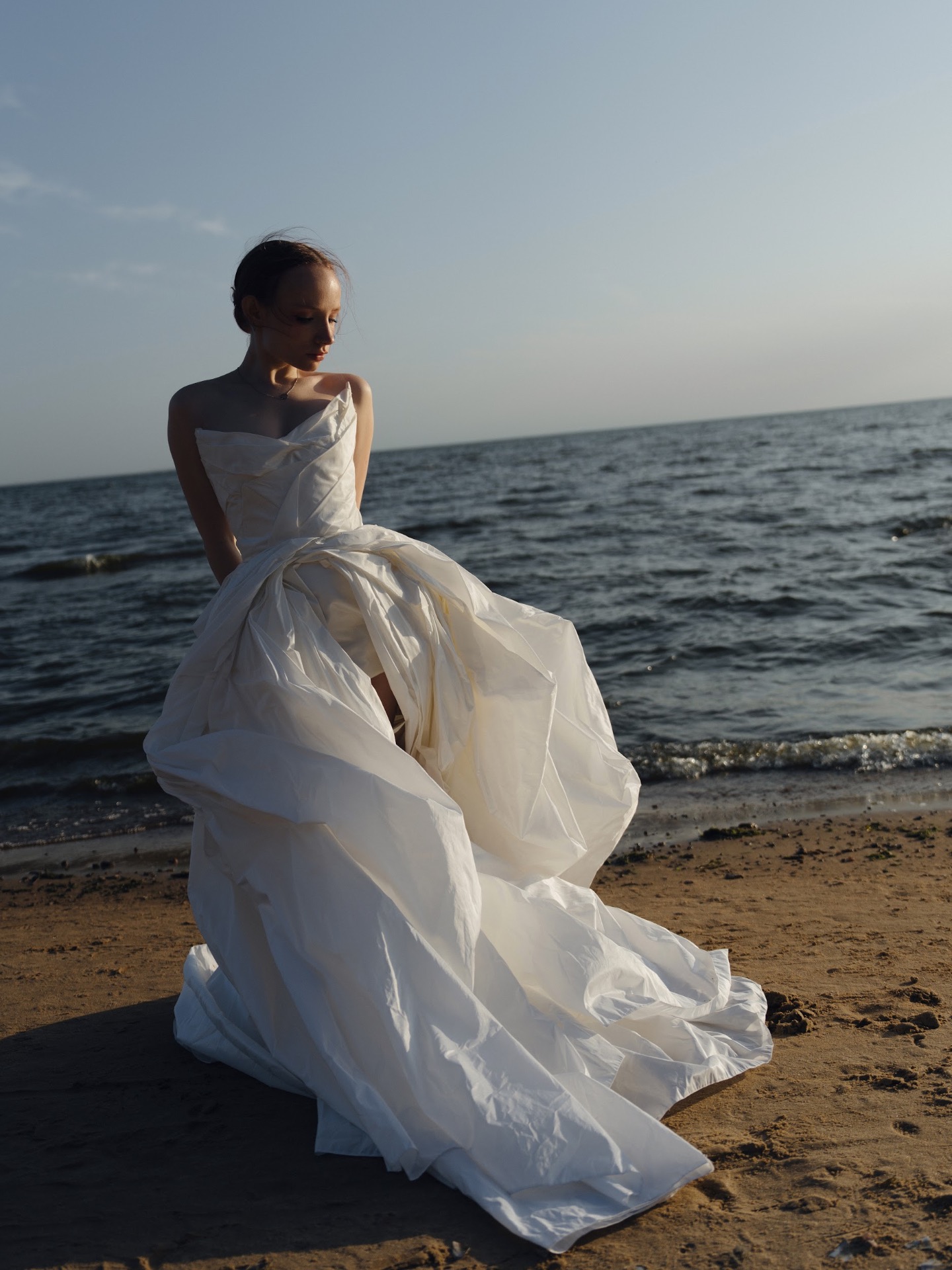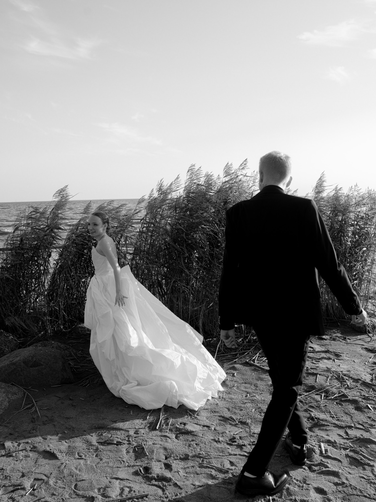 Церемонию мы представляли на фоне пляжа Финского залива, и выбранная нами локация позволила воплотить это в реальность. Единственная сложность заключалась в том, чтобы пройти по песку в туфлях на каблуках, но мой папа нашёл решение — он вынес меня на руках. Церемония получилась невероятно красивой. Особенно трогательным стал момент наших клятв. Мы сильно волновались, но, глядя друг другу в глаза, не колебались ни в одном слове.