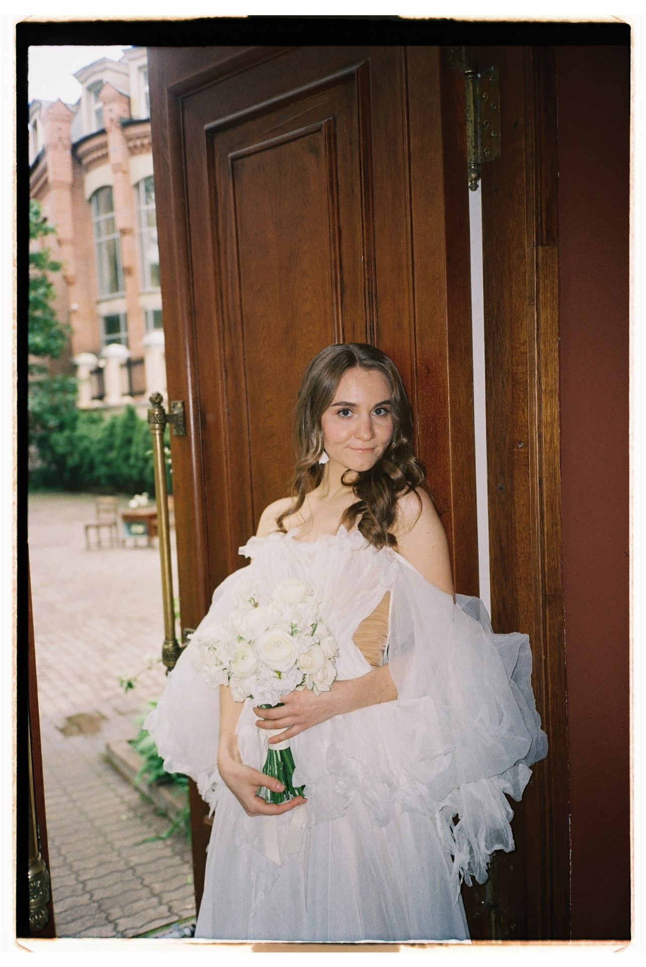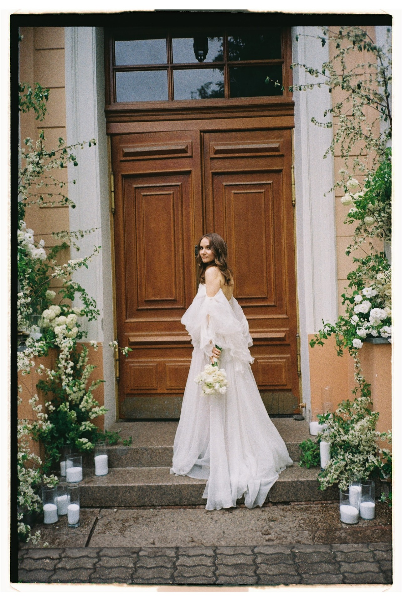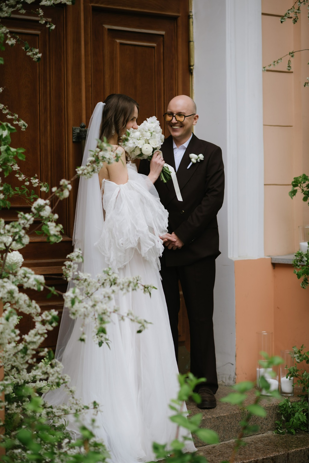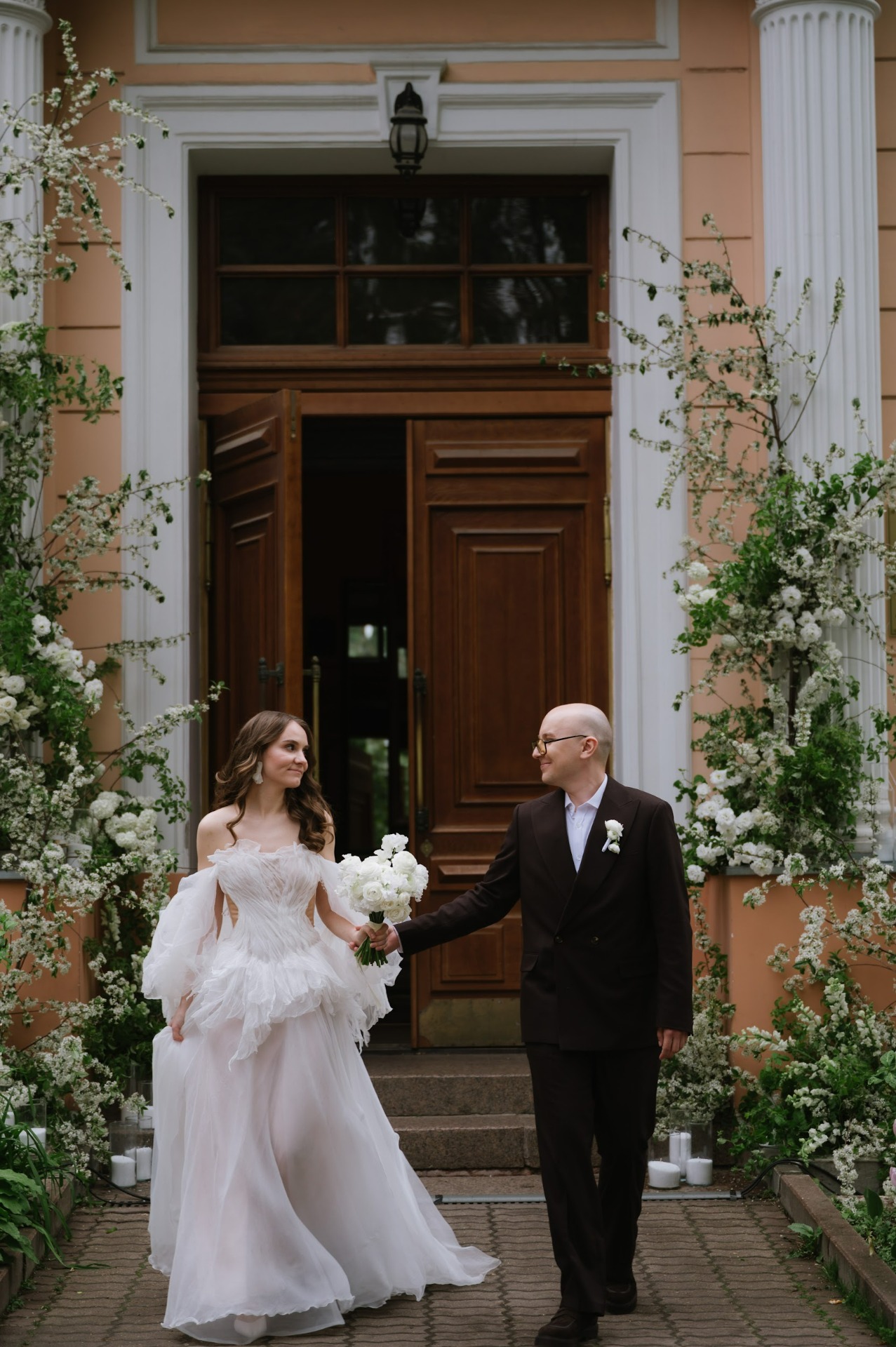 У меня было два платья: короткое — для росписи и танцев и длинное, со шлейфом — для церемонии и второго дня. Поиски основного наряда были долгими, но когда в одном из салонов я надела необычное платье из натурального шёлка, то сразу поняла: это оно. В нём я чувствовала себя сказочной нимфой — лёгкой и воздушной. Этот образ идеально вписался в концепцию нашей свадьбы.