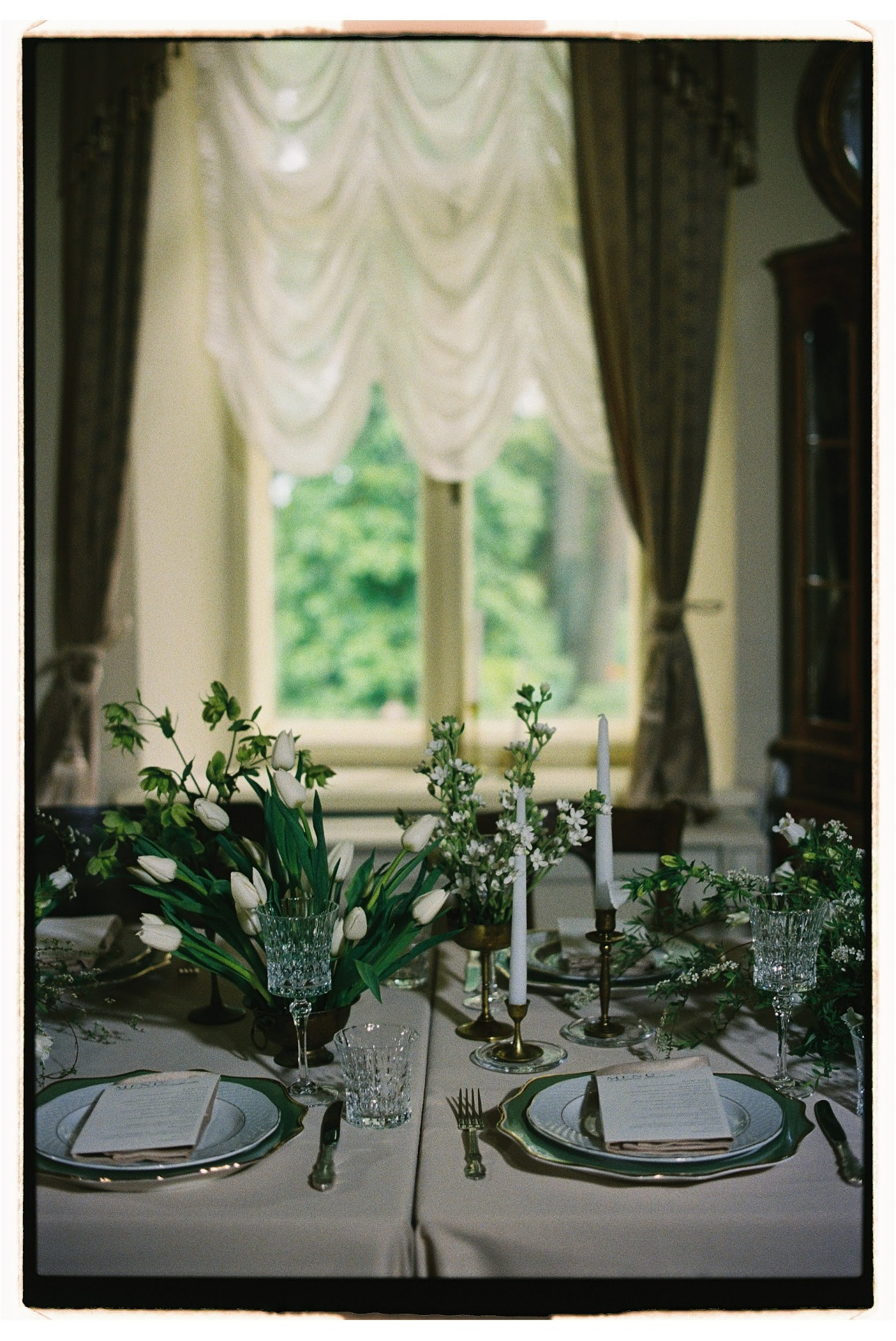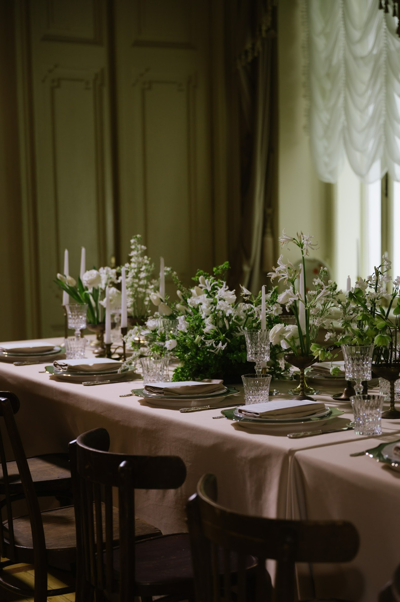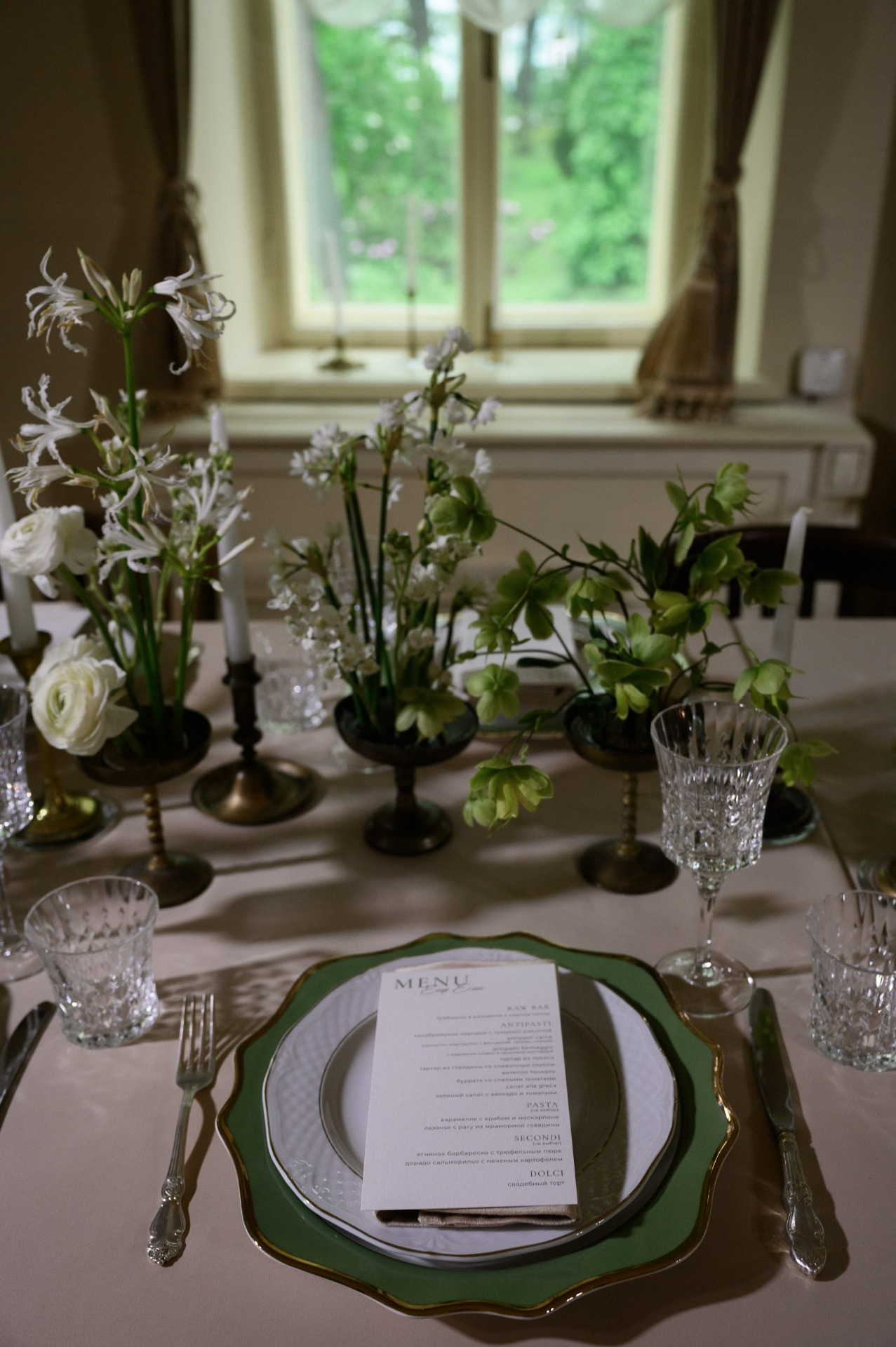 Вход в зал мы украсили живыми растениями и использовали его как место для церемонии, а в качестве украшений на стол добавили много зелени и белых цветов. Декор отлично соответствовал тематике северного лета, которое мы с Кириллом так любим.
