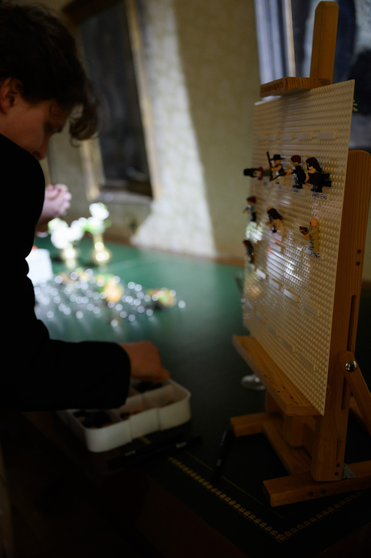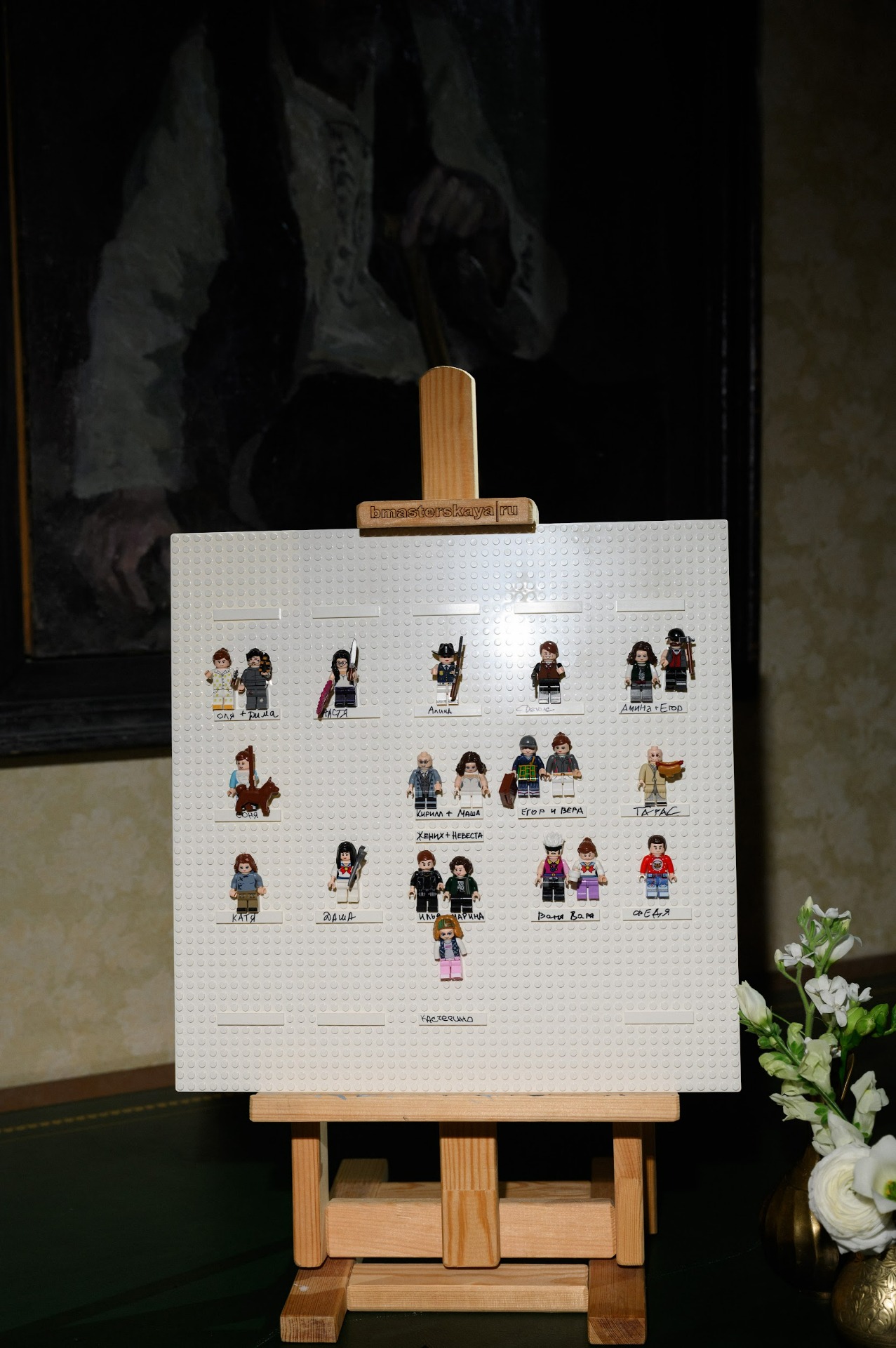 Мы с Кириллом большие фанаты LEGO, поэтому на welcome-зоне мы организовали станцию, где каждый гость мог собрать миниатюрную копию самого себя и прикрепить её на специальную доску. Так появился наш гестбук. А вместо классических канапе мы заказали наши любимые тако из бара «Кнорозов».