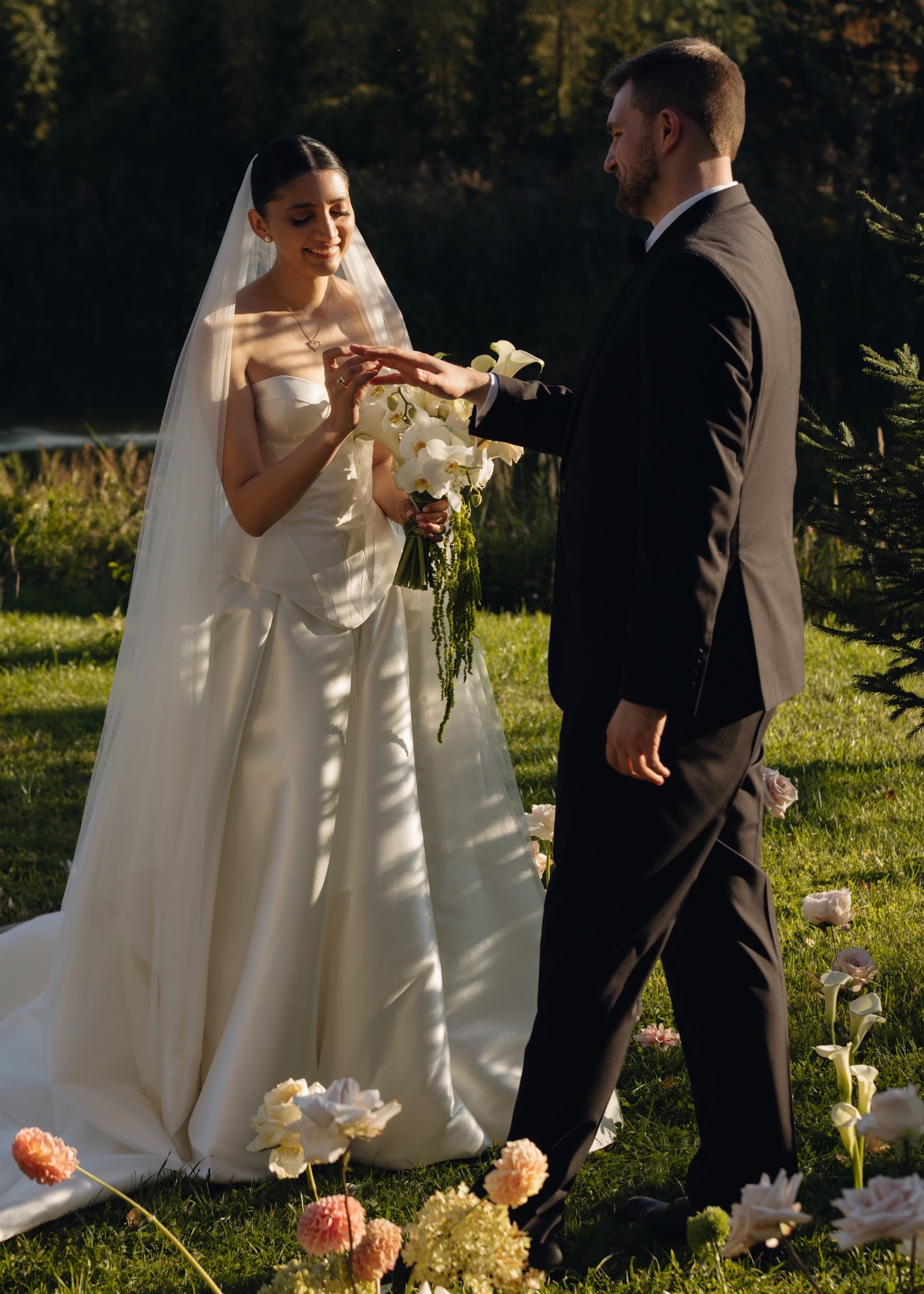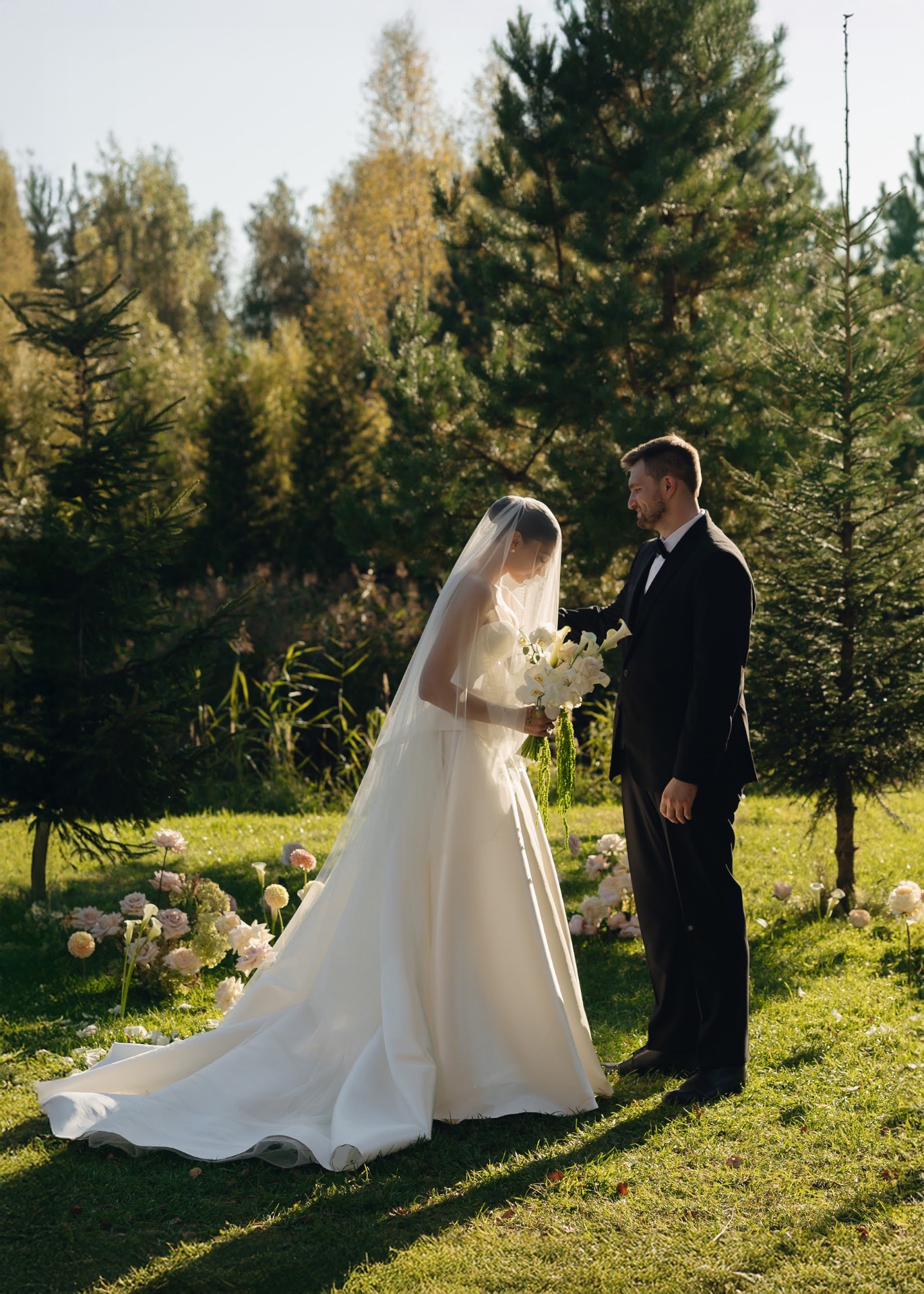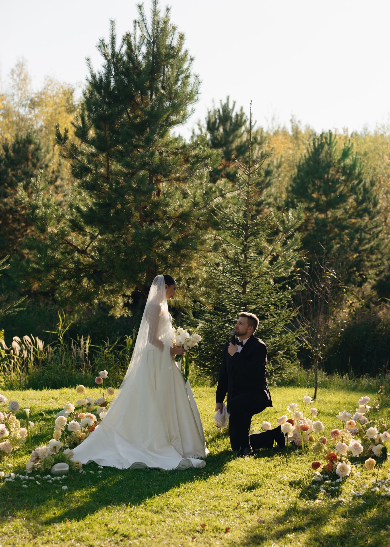 Для зоны церемонии нам очень не хотелось ставить арку. Поэтому мы придумали идеальный вариант в виде цветочной поляны. К тому же нам очень повезло с погодой. Поскольку свадьба была в сентябре, цветы мы выбирали в соответствии с сезоном.
