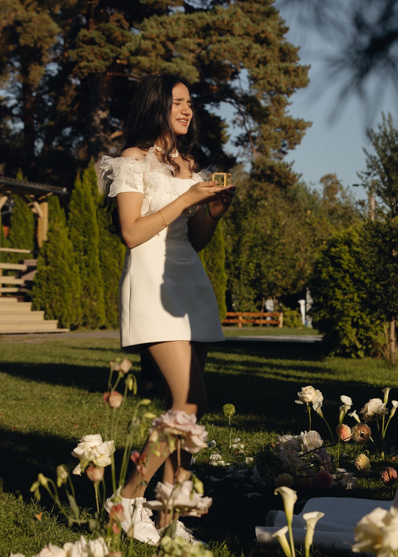 Когда мы приехали на площадку, моё сердце замерло: всё оказалось даже лучше, чем мы себе представляли. Церемония, цветы, зонтики для гостей, маленькие конвертики с салфетками, фотоаппарат моментальной печати, рамка с нашим фото, на которой друзья оставляли пожелания — всё выглядело как на наших референсах.