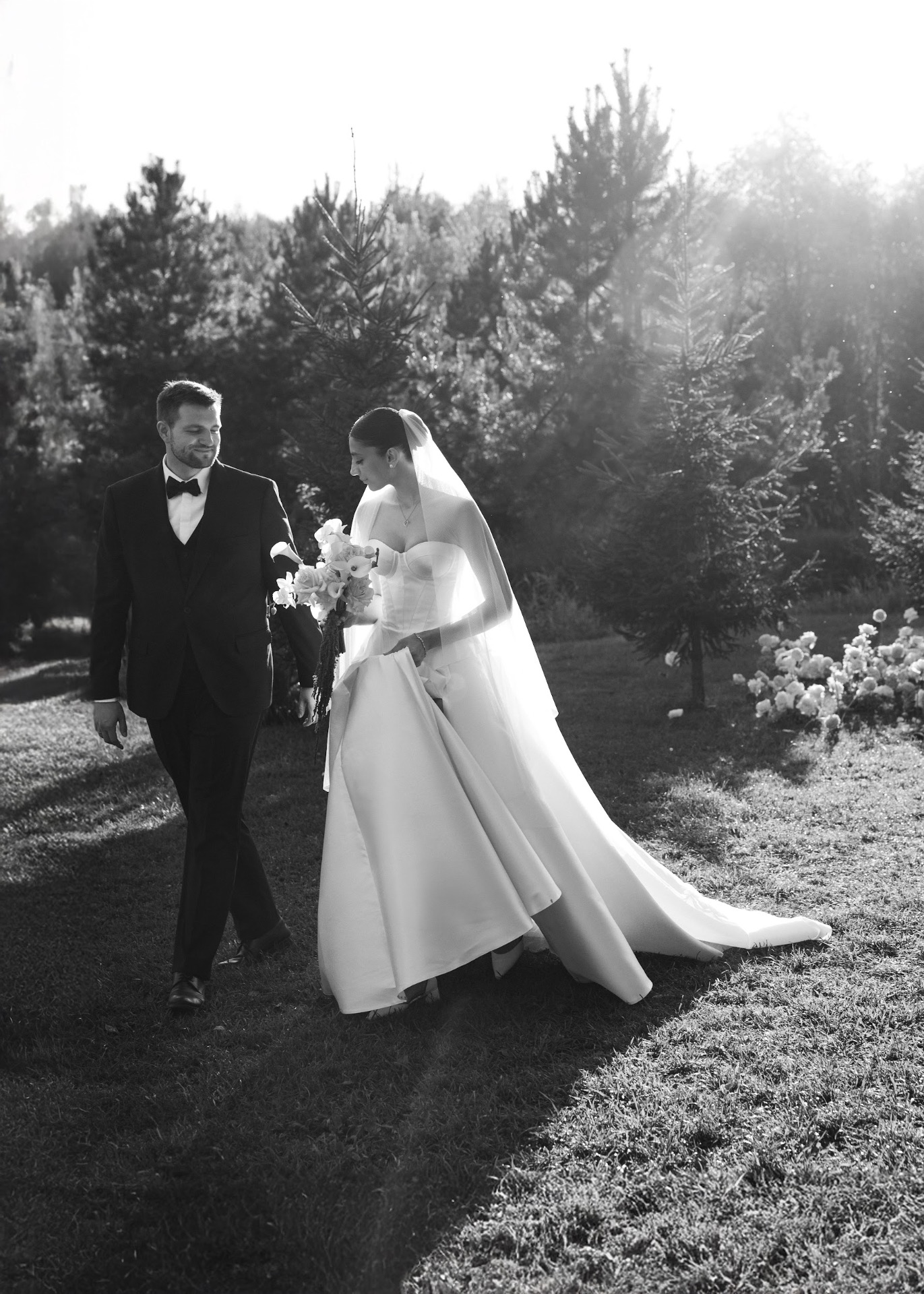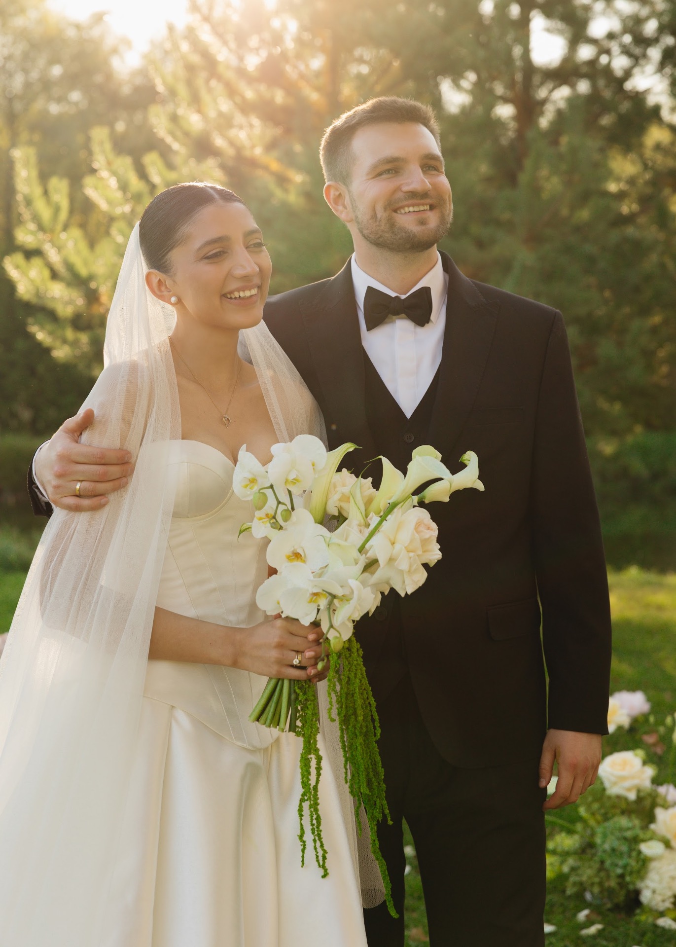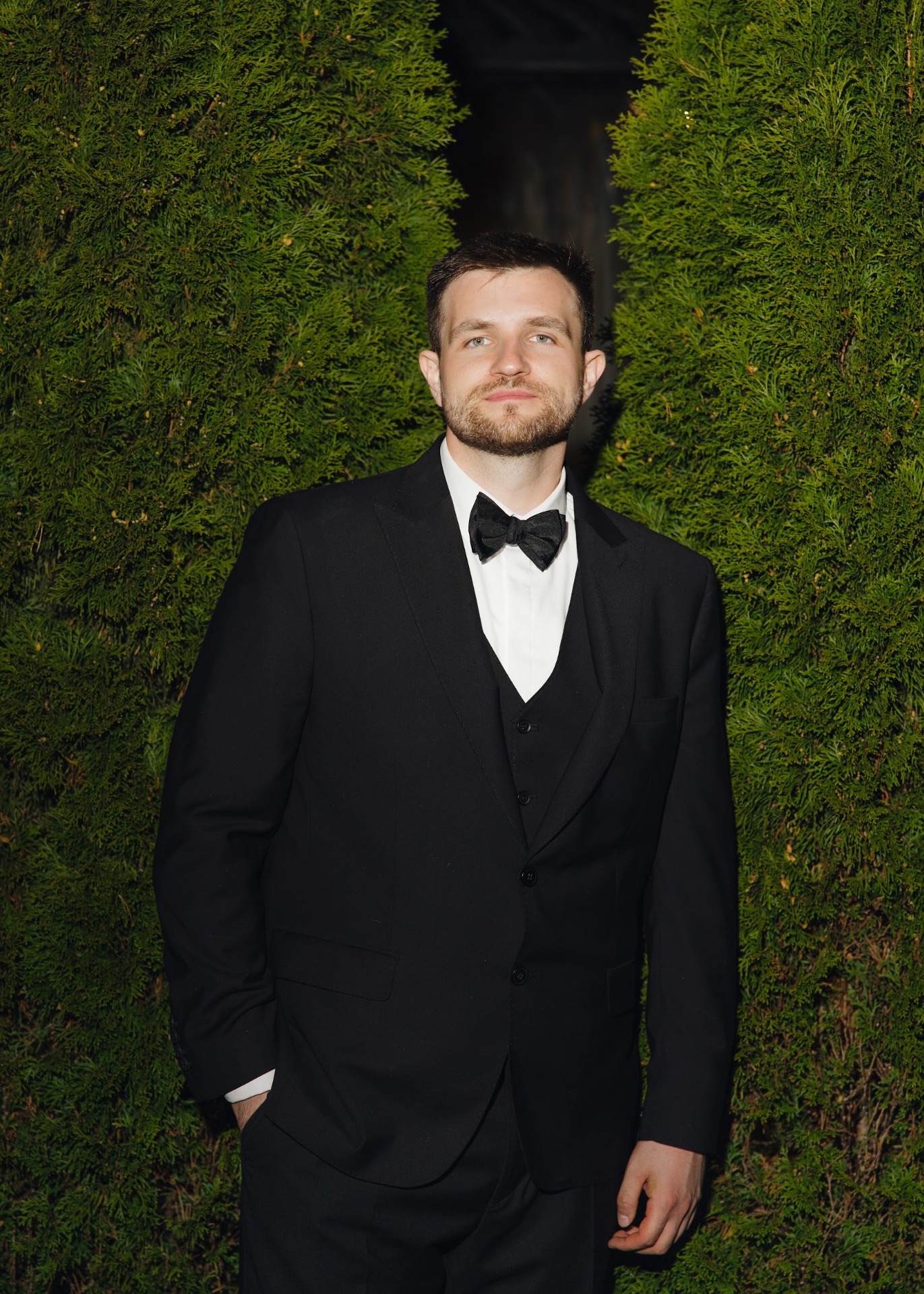 С костюмом Сергея всё оказалось гораздо сложнее, чем мы думали. Мы ездили по магазинам, примеряли десятки вариантов — и только за месяц до росписи нашли тот самый классический чёрный костюм с жилетом и бабочкой в магазине Brand Club.