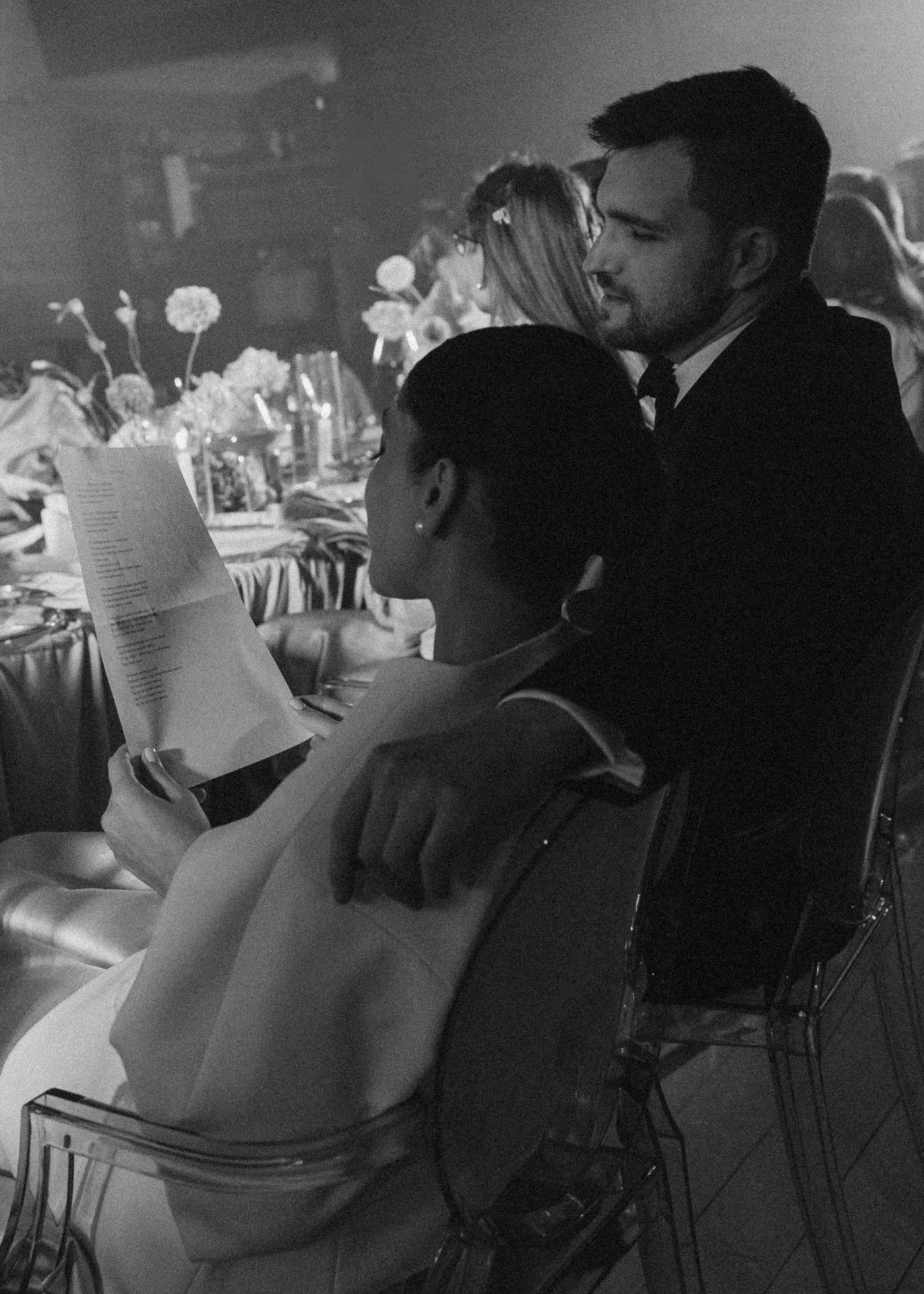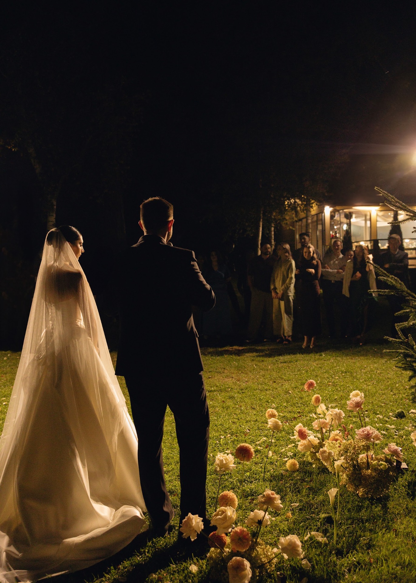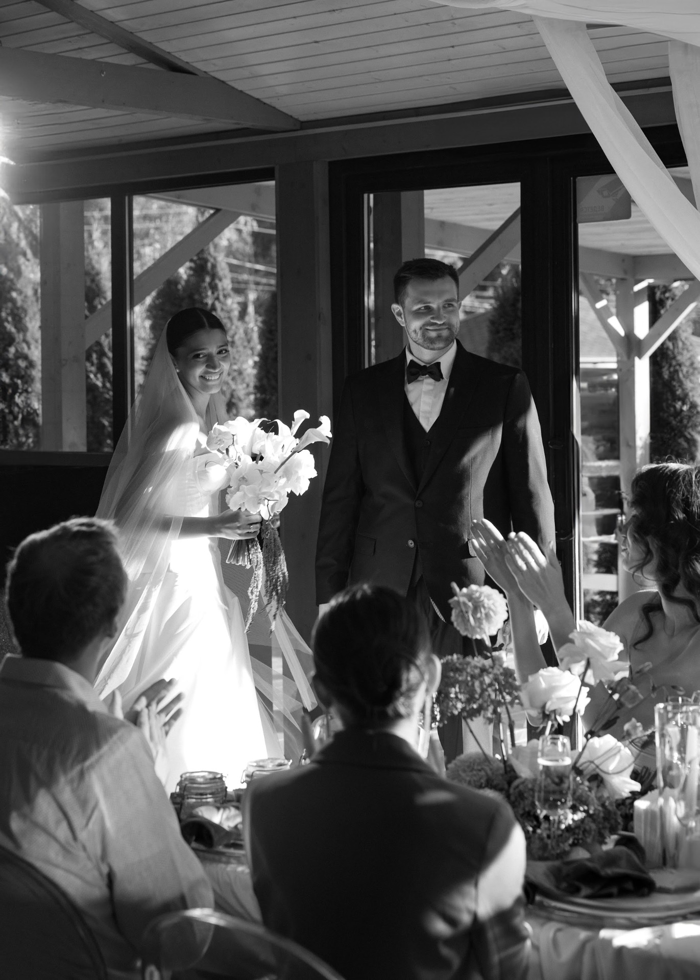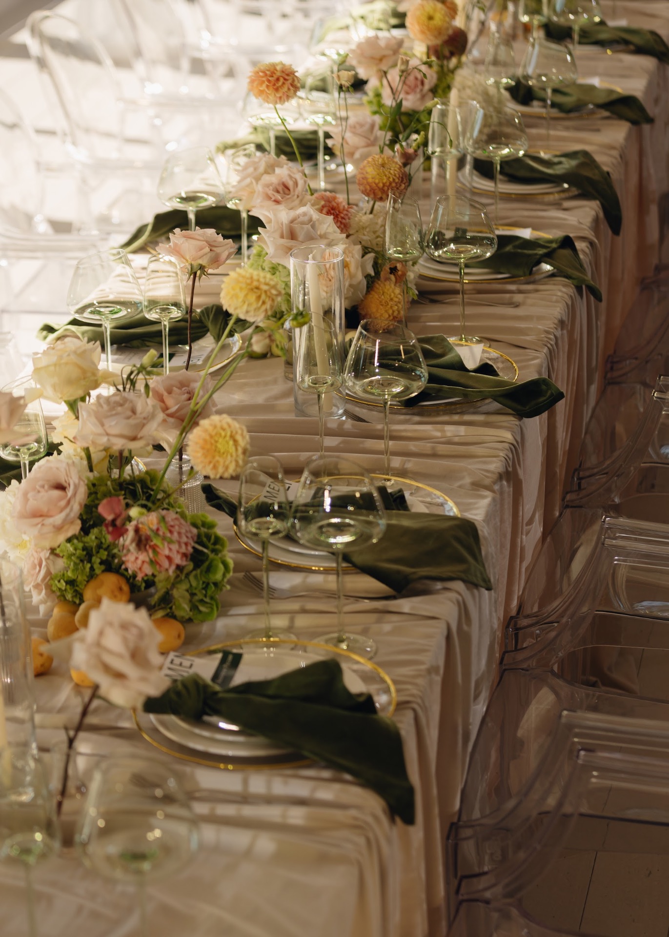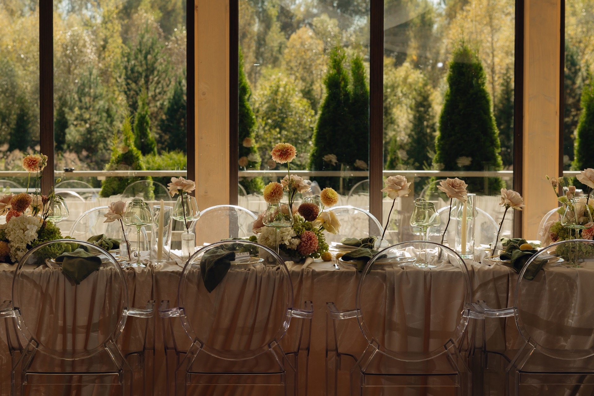 После церемонии был банкет за одним большим общим столом, как мы и мечтали. Декор, свет, музыка — всё выглядело гармонично и уютно.