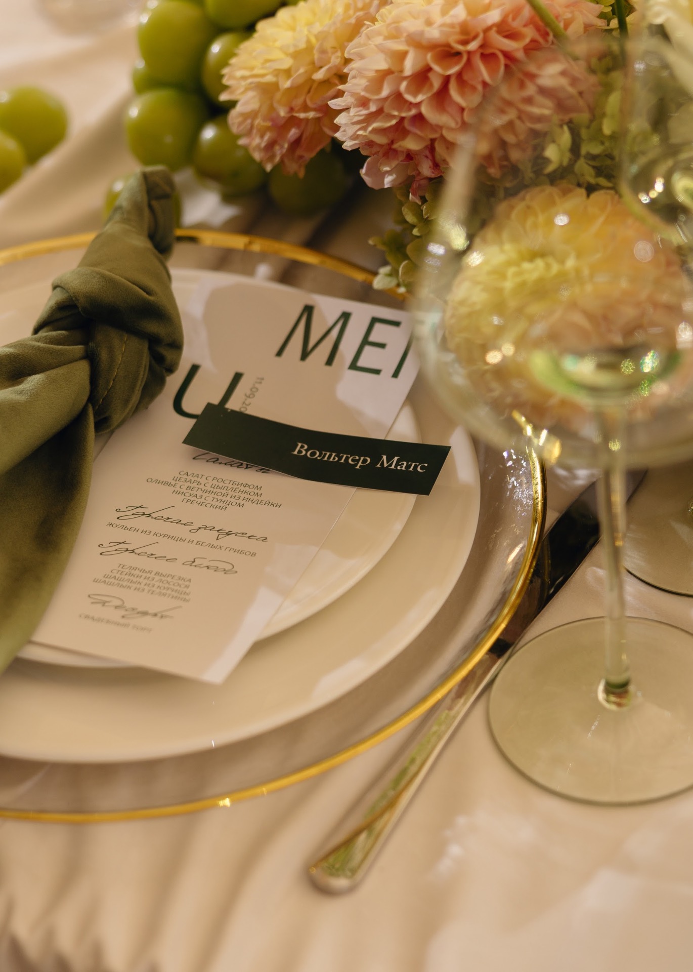 Цвета нашей свадьбы тоже появились сами собой. Мы решили остановиться на наших любимых оттенках — молочном и тёмно-зелёном.
