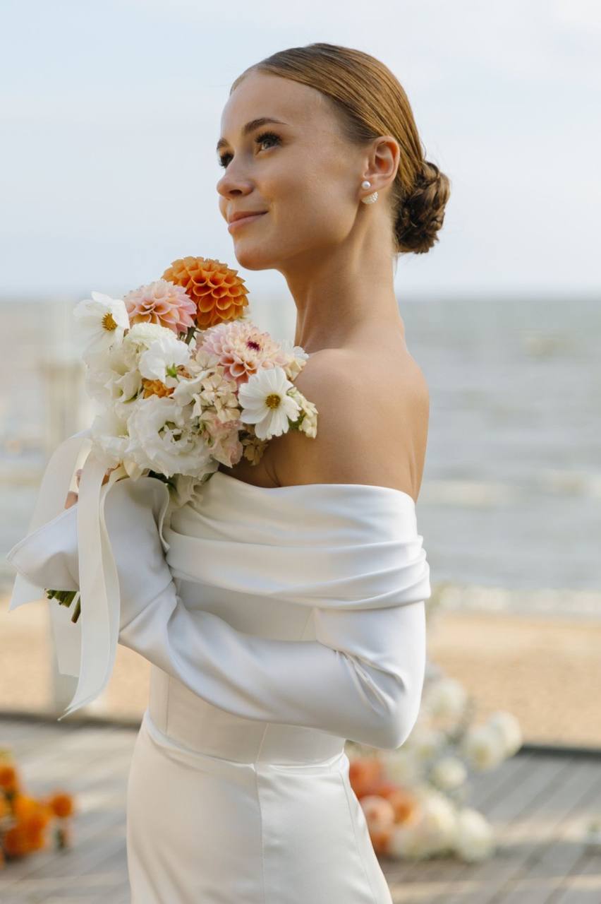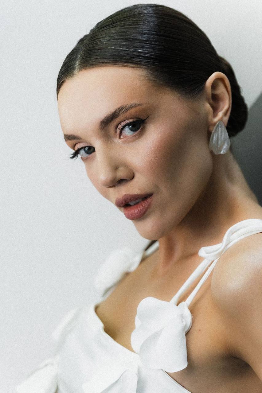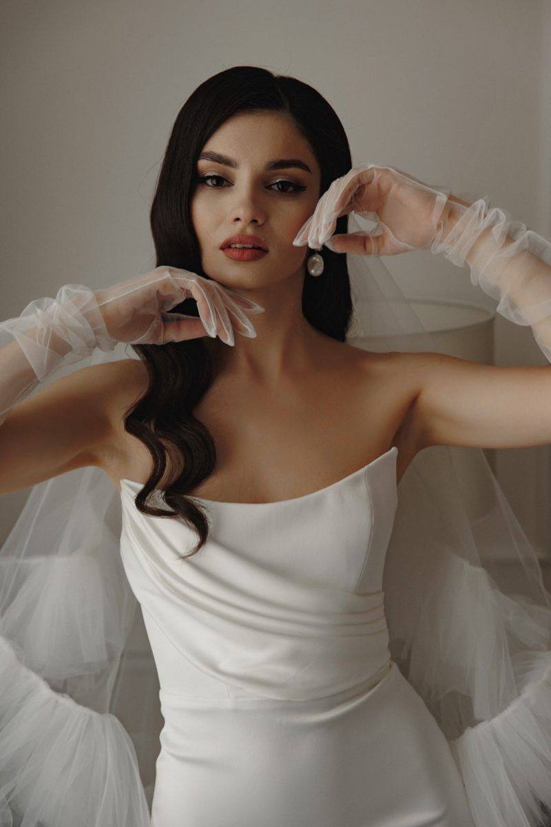 Такая причёска подчёркивает женственность и элегантность, делает акцент на чертах лица и прекрасно сочетается с утончёнными свадебными платьями — особенно с корсетами, открытыми плечами или классической фатой.