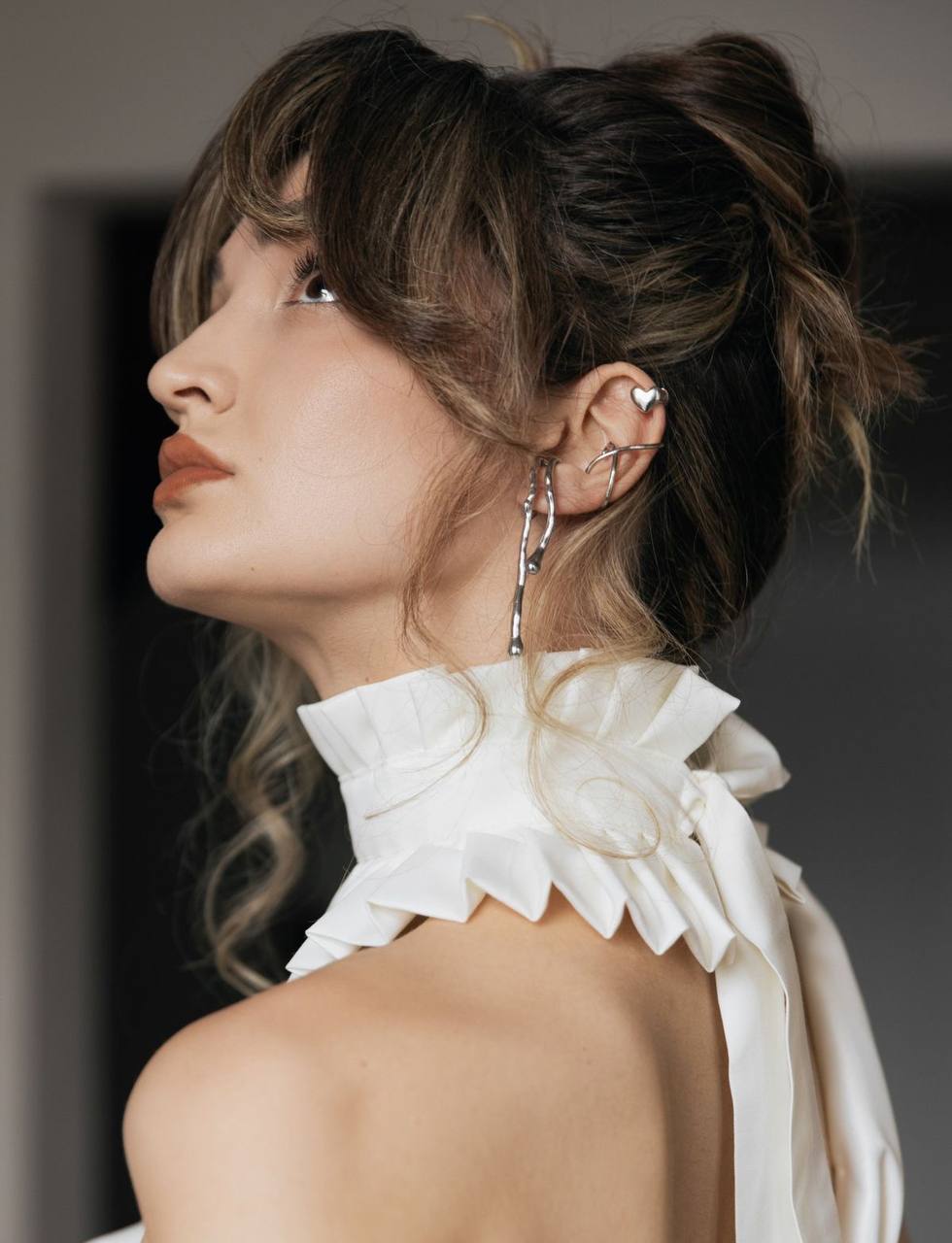 Чёлка мягко обрамляет лицо и делает взгляд более выразительным. Для свадебной причёски с чёлкой чаще выбирают распущенные волны или объёмный высокий пучок.