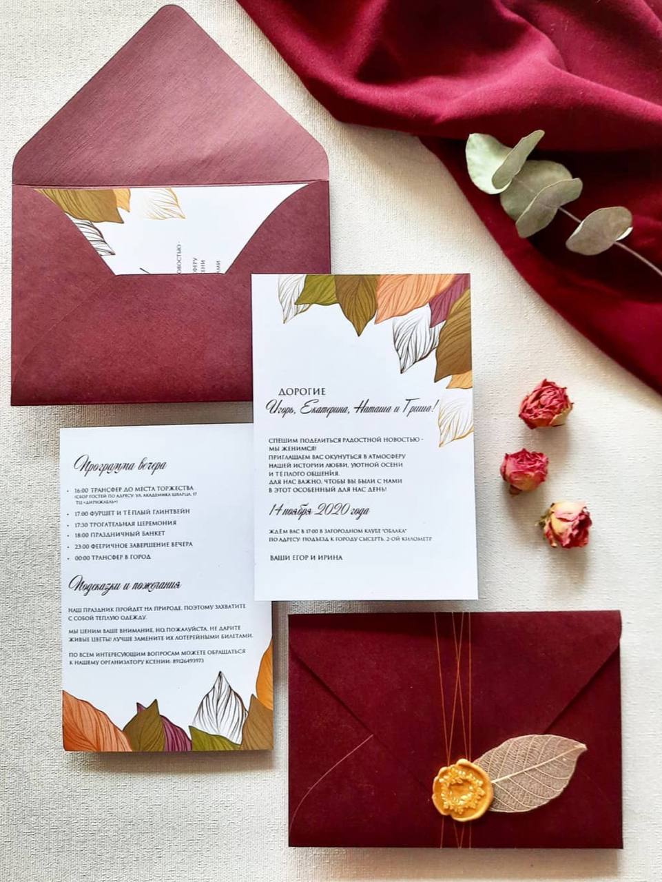 В осенних приглашениях преобладают тёплые оттенки оранжевого, бордового и золотого, листья и текстуры дерева — всё то, что передаёт уютную атмосферу осени.