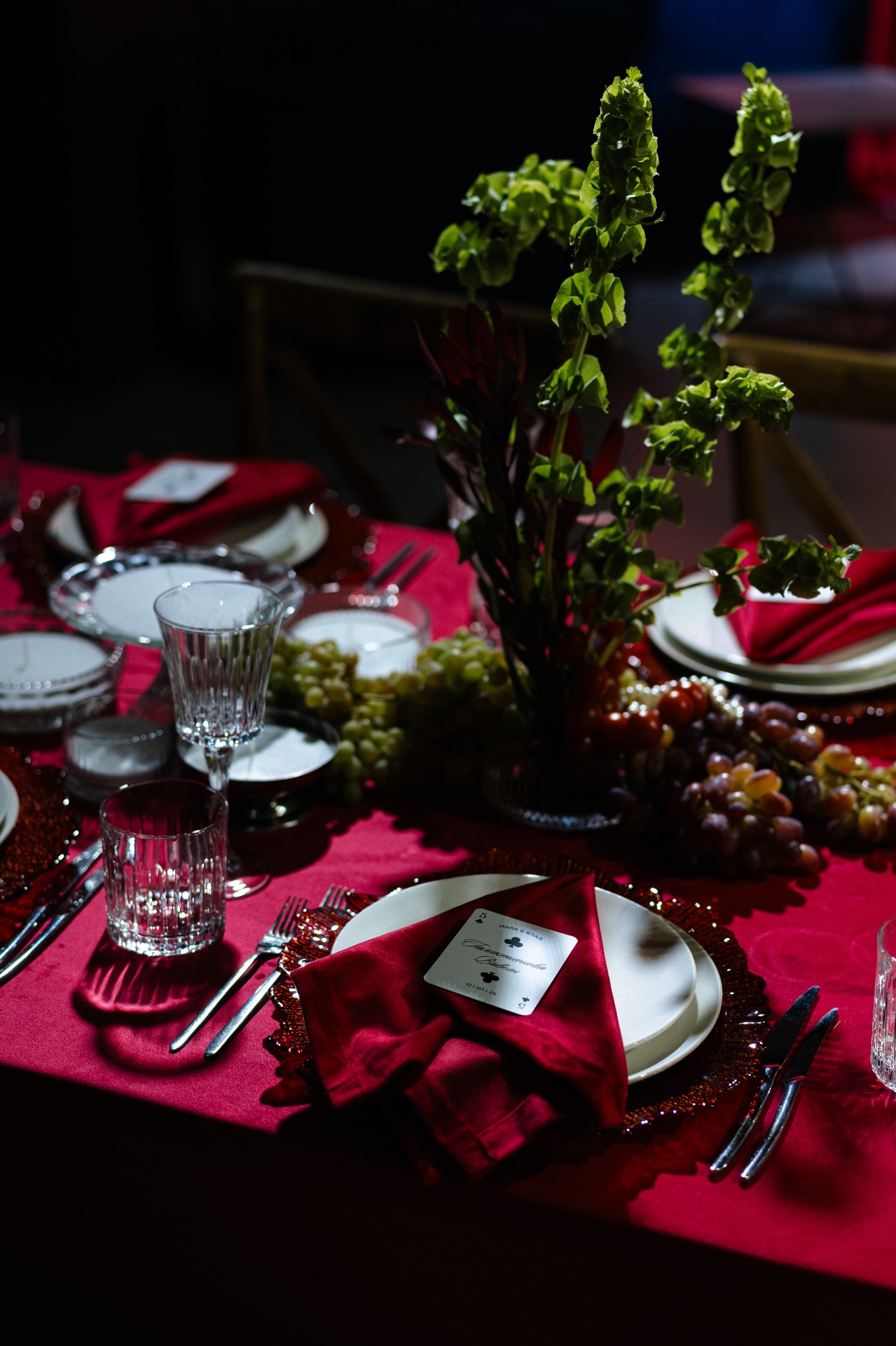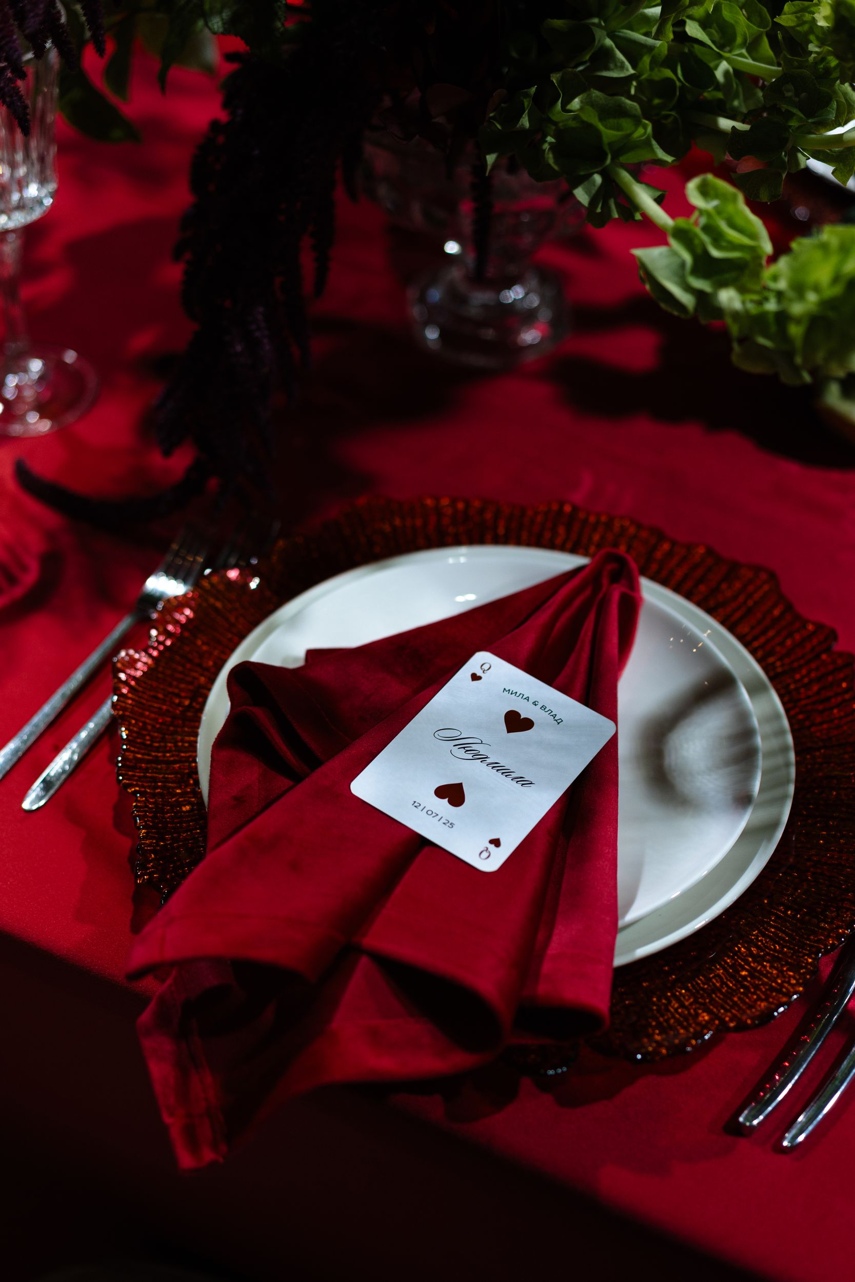 Нам очень хотелось персонализировать наш камерный формат свадьбы с атмосферой семейного ужина. А когда наши организаторы предложили тематику казино, это стало попаданием в яблочко! Мы познакомились на игре, отношения начались с фразы «не играй со мной», мы оба любим винное казино. Всё сложилось просто идеально!