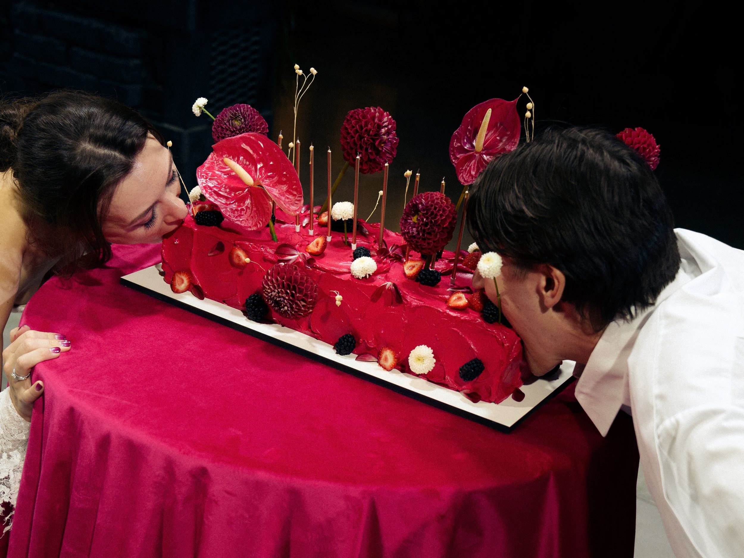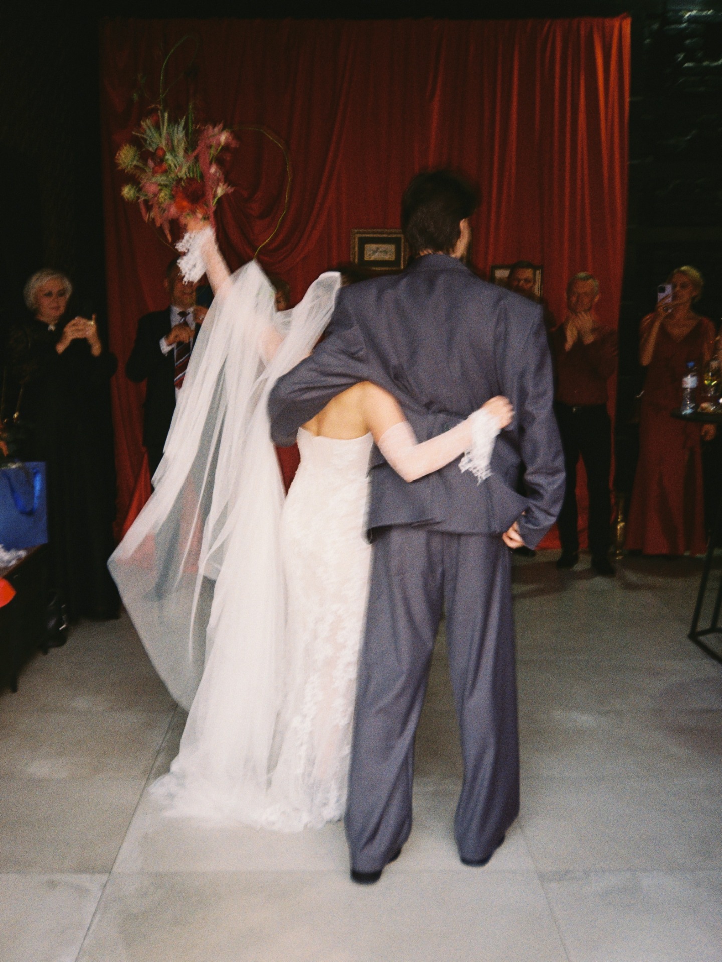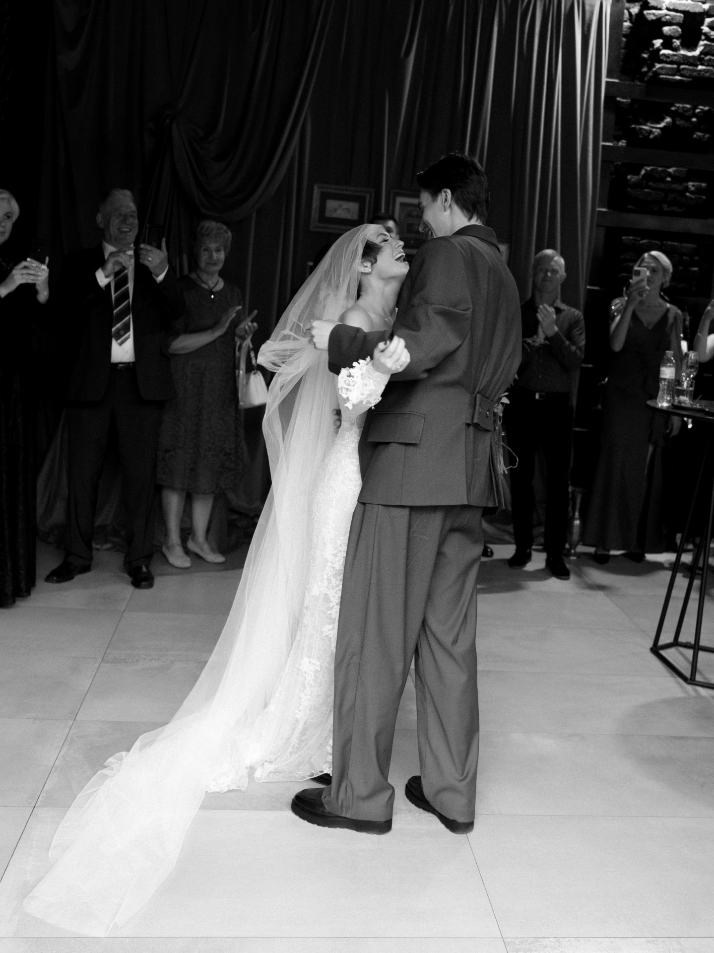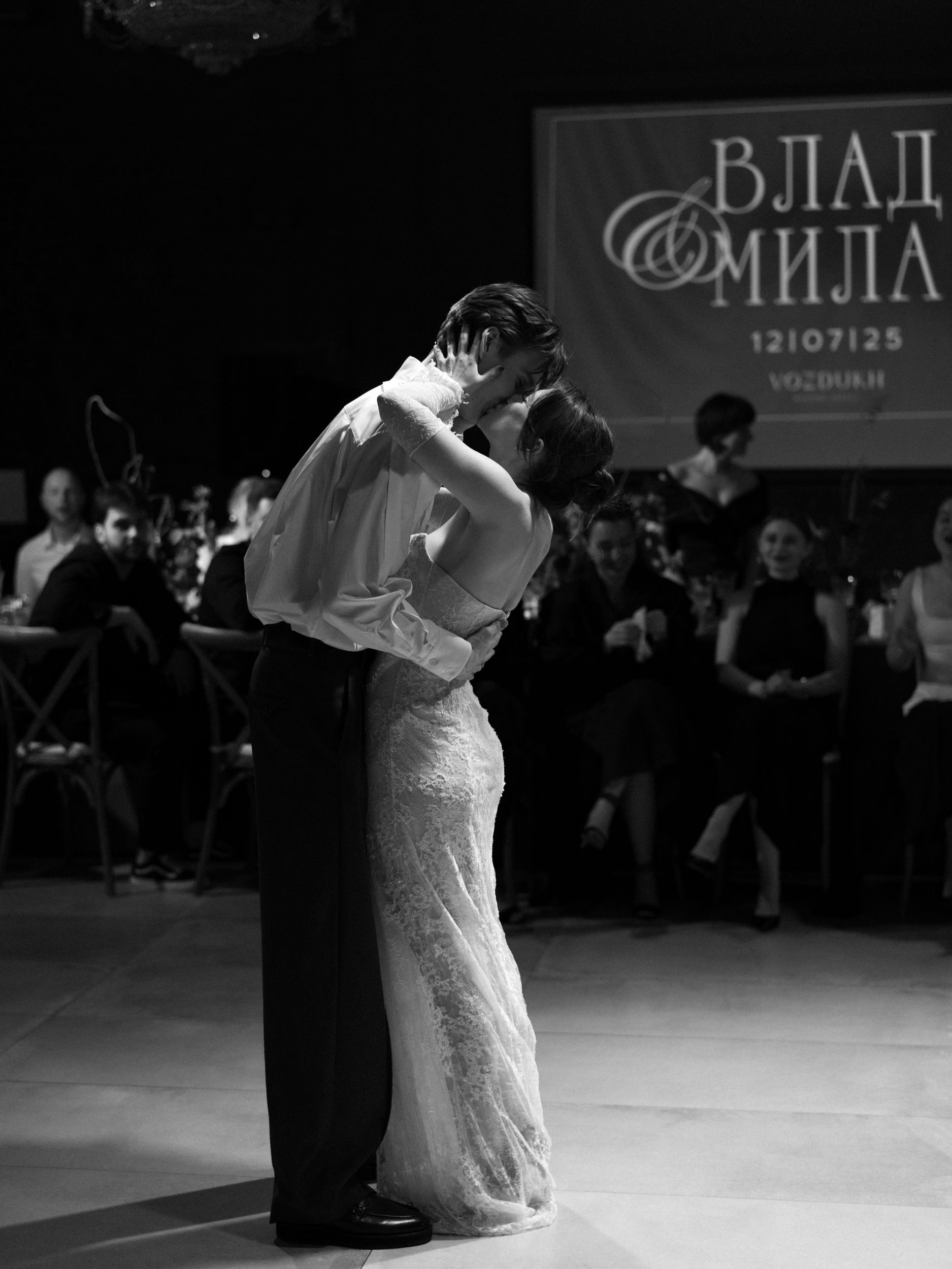 Мы зашли в зал под песню нашей любви — Frankie Valli «Can’t Take My Eyes Off You». Мы решили отказаться церемонии, так как главное «да» мы уже сказали друг другу в день росписи, поэтому выбрали произнести друг другу речь. Слова любви, понимания, принятия друг друга — без возвышенного и напыщенного, а того, что понятно именно нам.